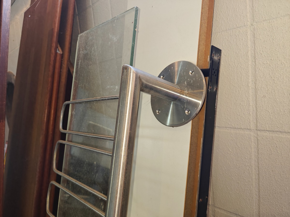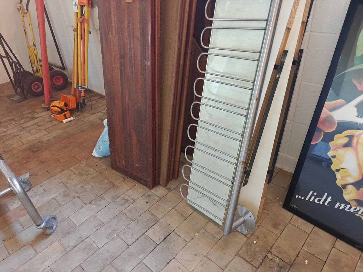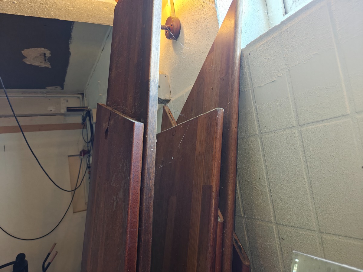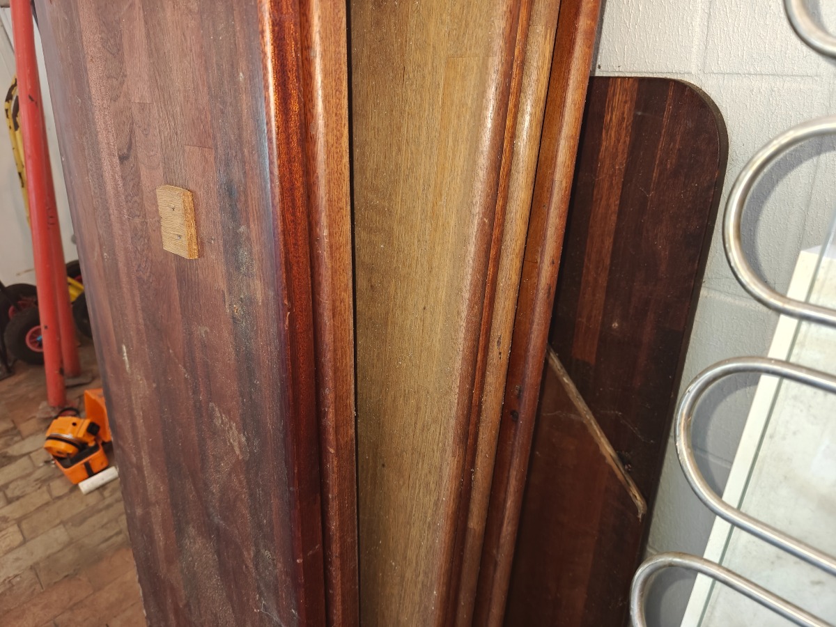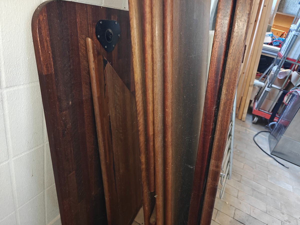 Bordplader i massivt træ. Ass. mål: D: 40-43 cm., samt 1 stk på 60 cm. Svævehylder, loftophængt glasholder i rustfrit stål. Mål: B: 164 cm, D. 40 cm, H: 15 cm. Glashylde i hærdet glas medfølger. Brugt.