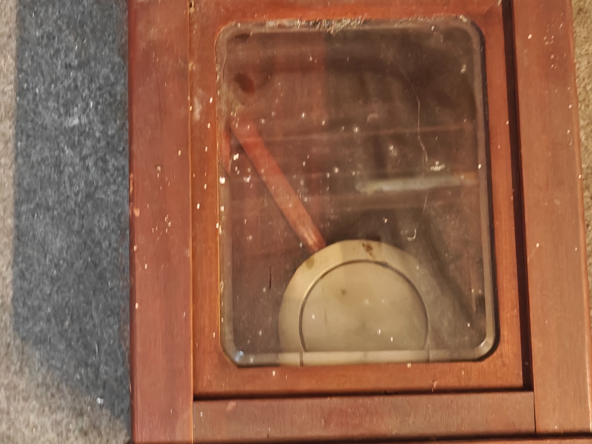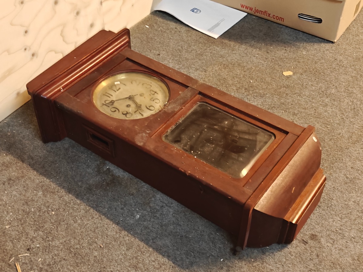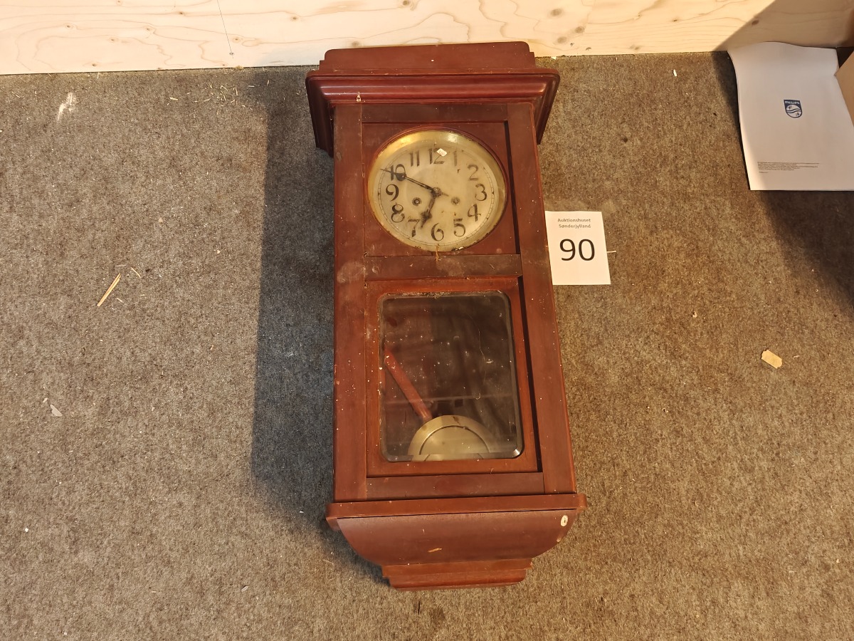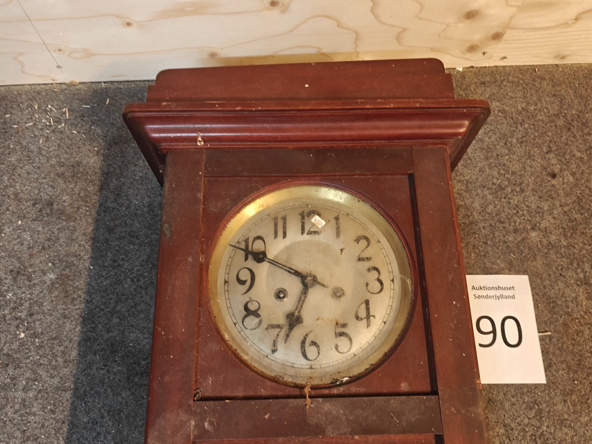 Væghængt ur. Mål: H: 77 cm. B: 32 cm. D: 17 cm. Brugt.