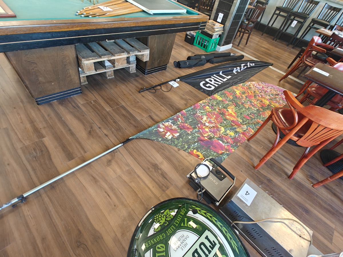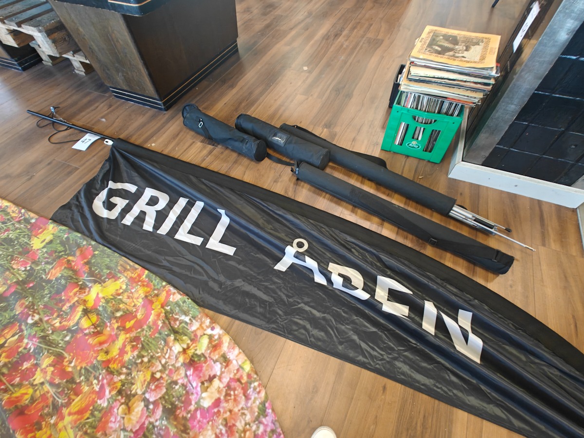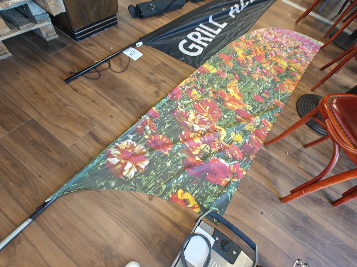 3 stk Beach flags: 2 stk: "Grillen er åben" og 1 stk med blomster. Opbevaringstasker og jordspyd medfølger til 2 flags. Brugte.