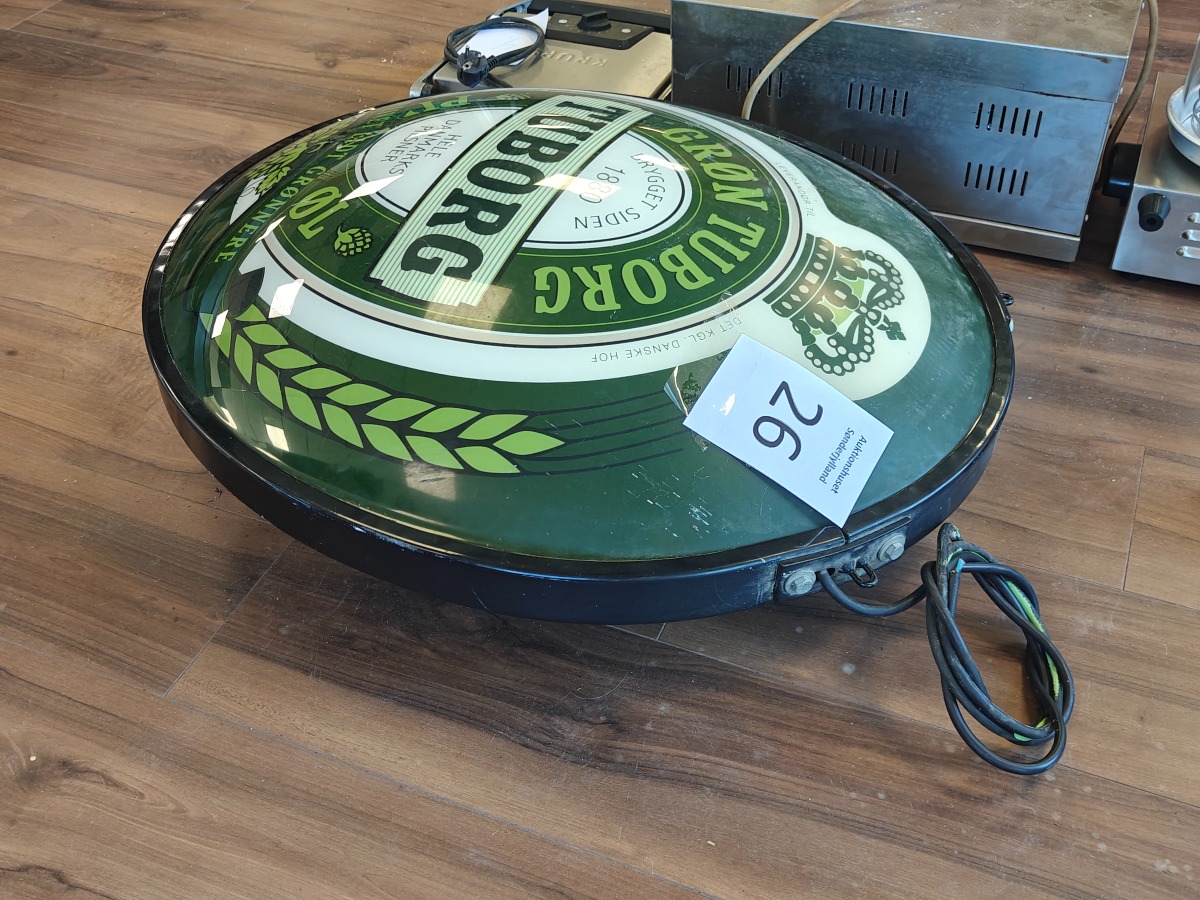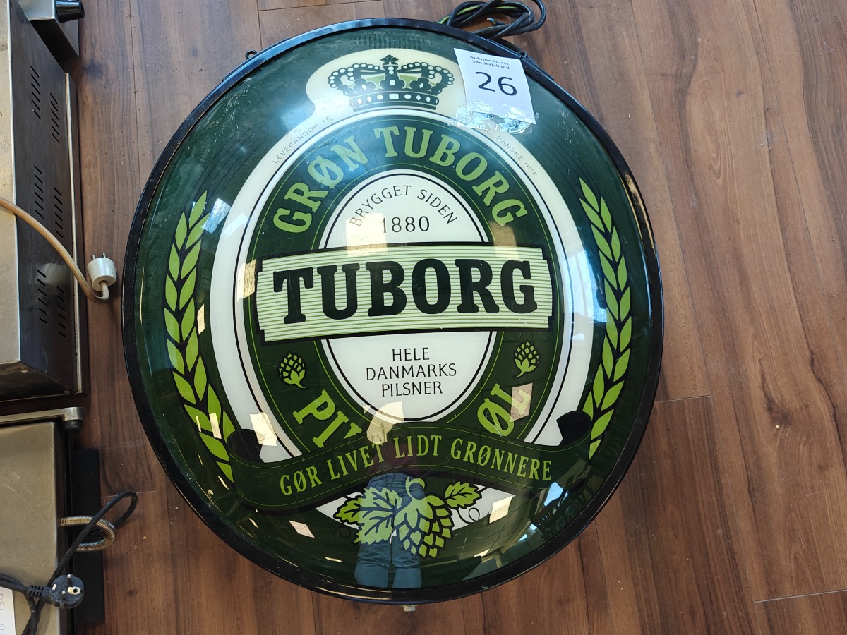 Tuborg lysskilt. Hængeskilt. Mål: H: 80 cm. B: 66 cm. Brugt. Virker. Loftsbeslag ophæng medfølger ikke. Er nedtaget.