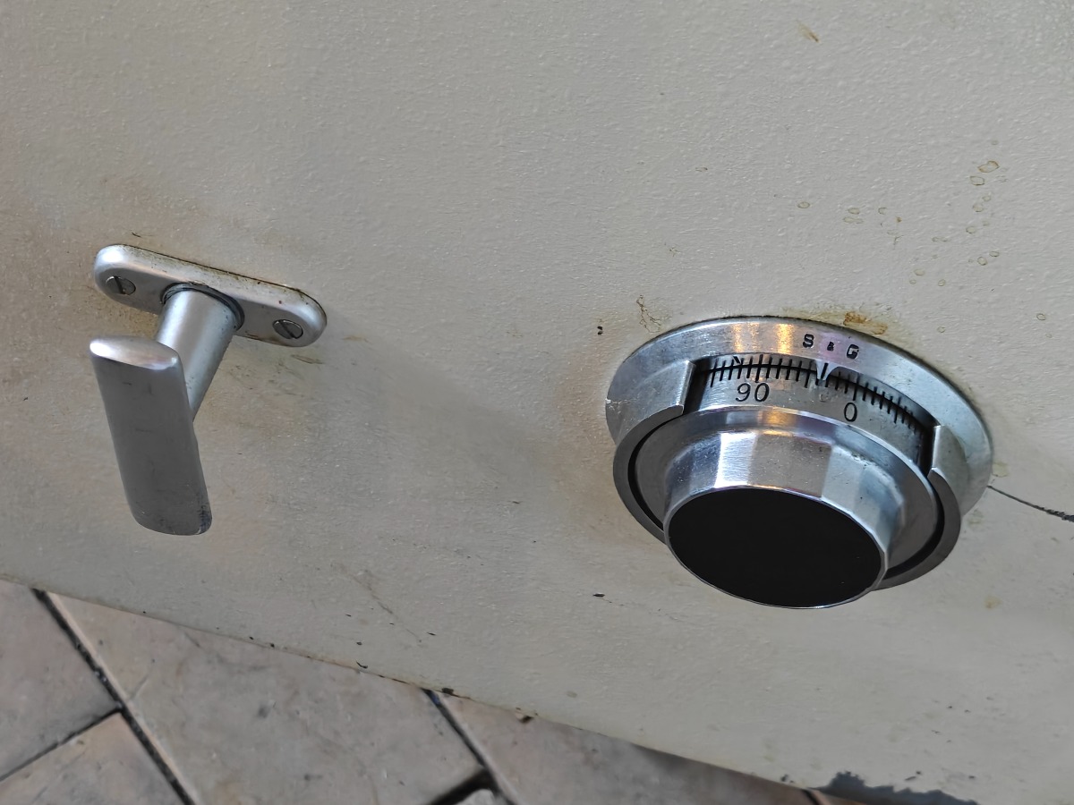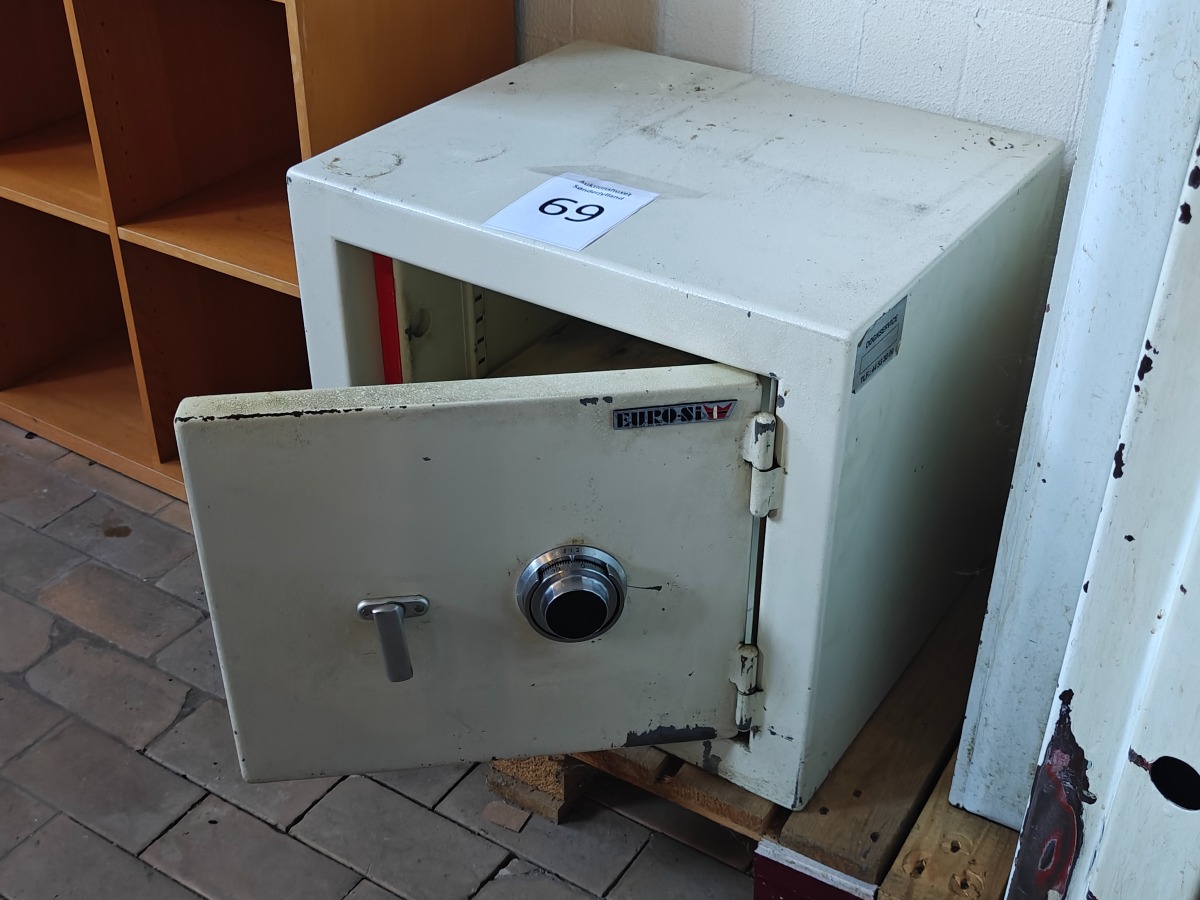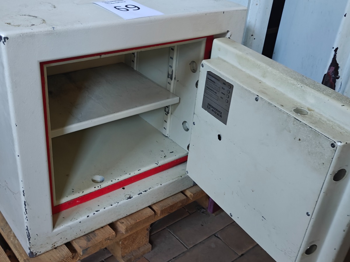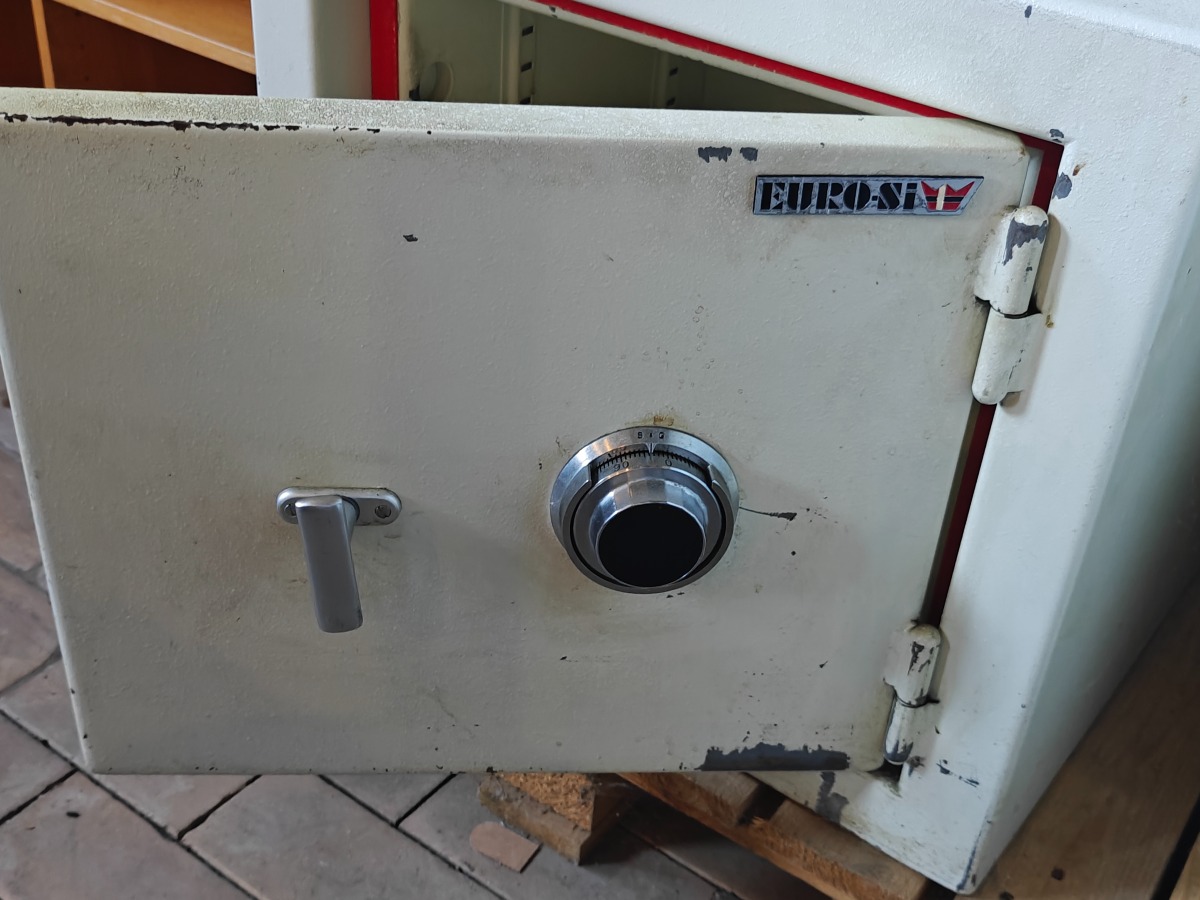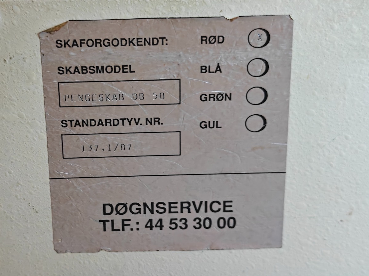 Pengeskab m/kode. Mrk Euro-Si. Model: DB 50. Mål: B: 58 cm. D: 49 cm. H: 52 cm. Kode udleveres ved udlevering. Brugt. OBS: Skabet er tungt, så der skal flere mand/flytte-/løftegrej til at bære ud og læsse v/afhentning. Vi anbefaler interesserede bydere til at komme og bese skabet ved eftersyn.