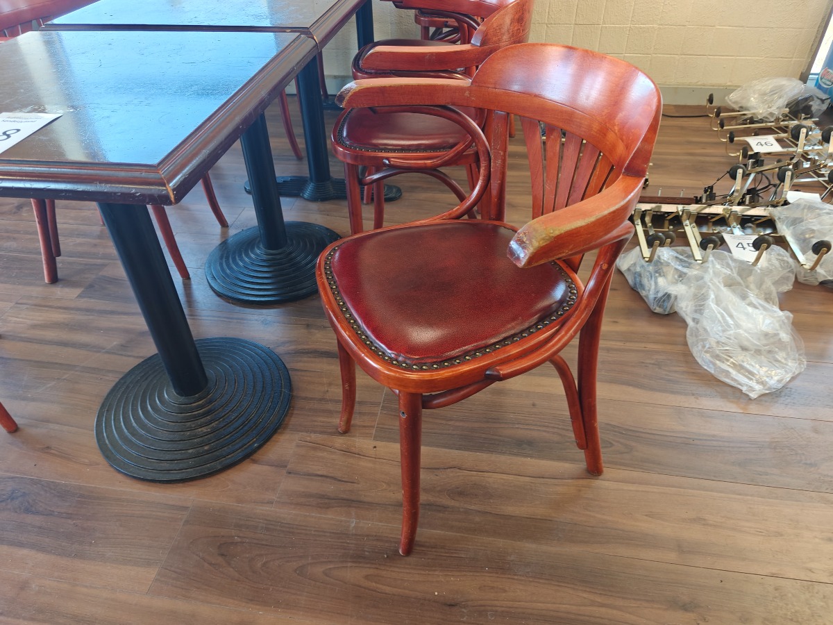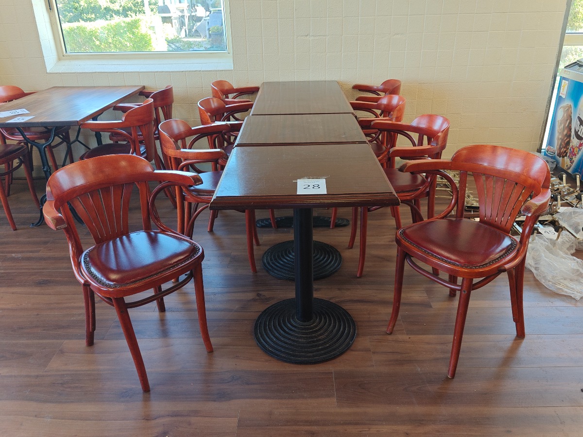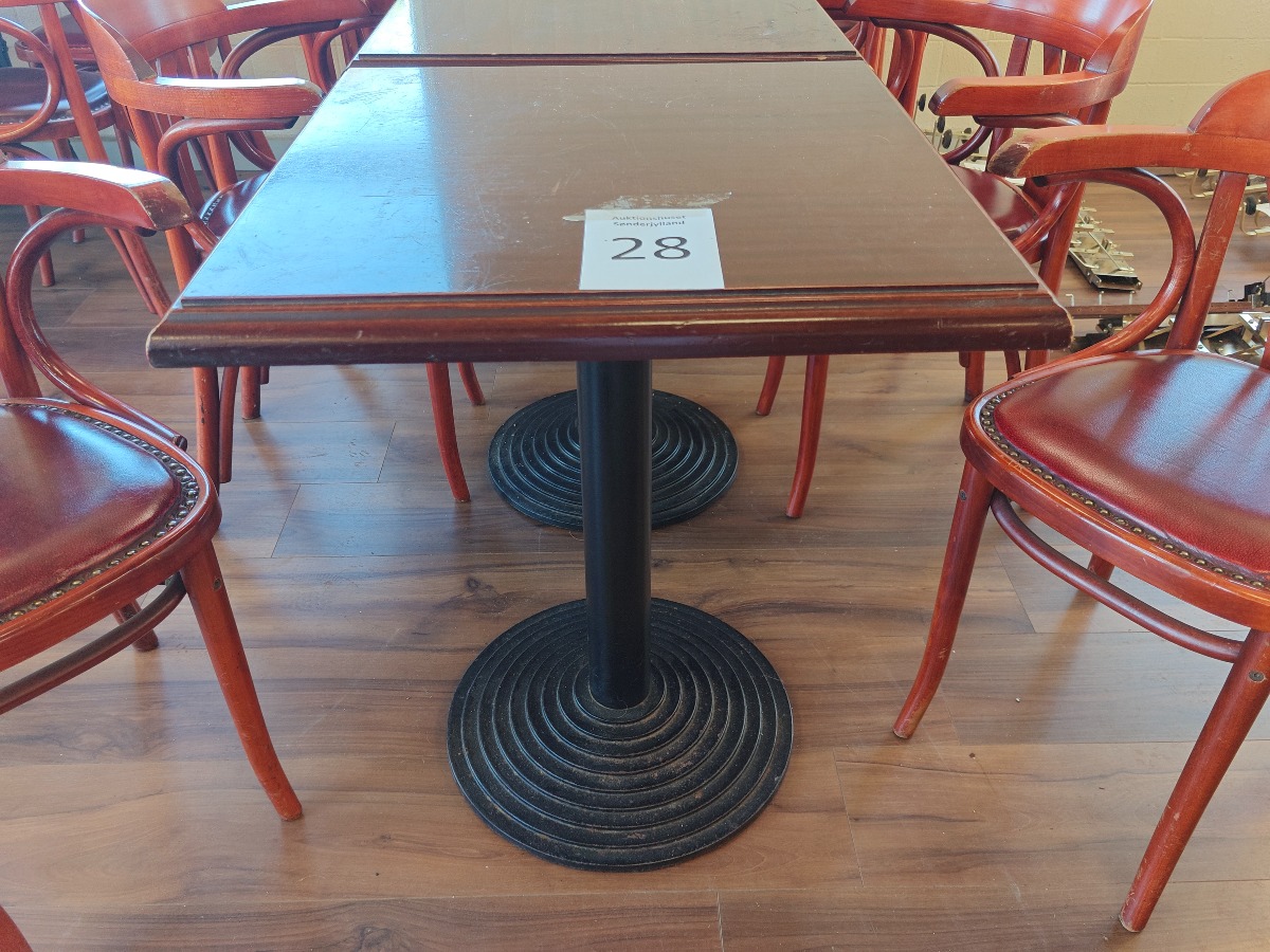 3 stk Cafeborde & 8 stk krostole. Mål: borde: 2 stk: L: 60 cm. B: 60 cm. 1 stk: H: 74 cm. L: 120 cm. B: 60 cm. H: 74 cm. Stole m/armlæn og polstrede sæder. Alm brugsspor.