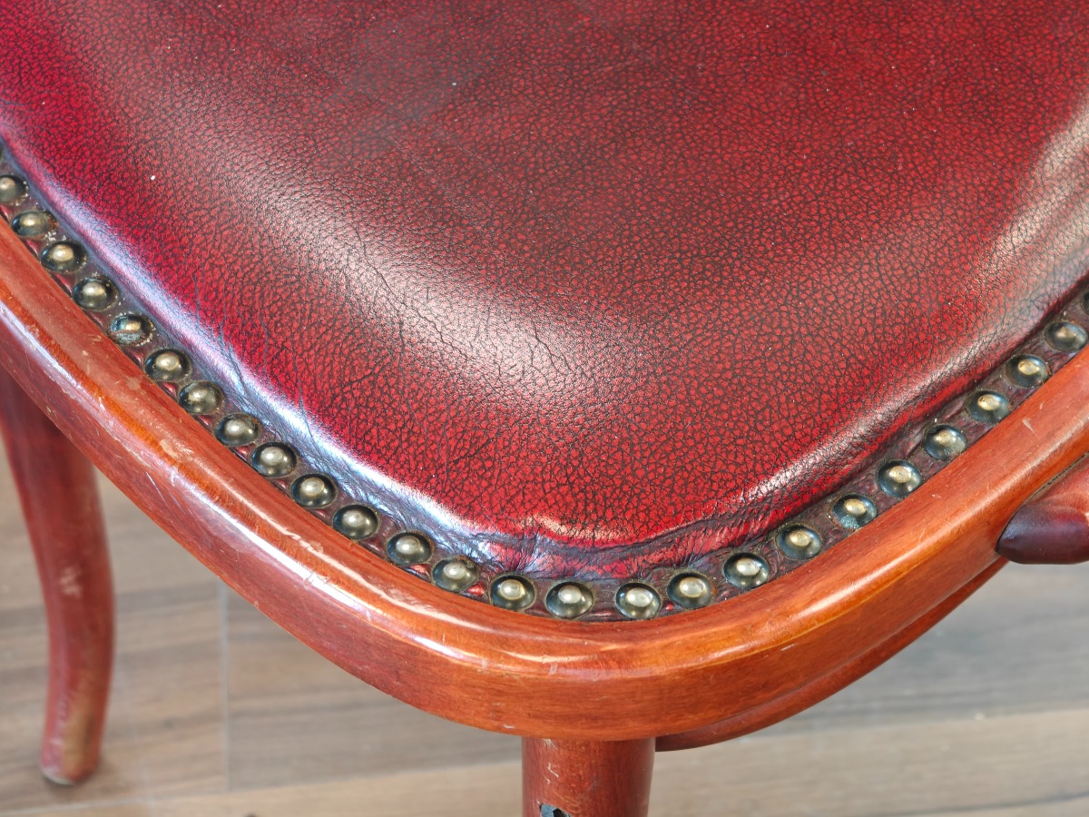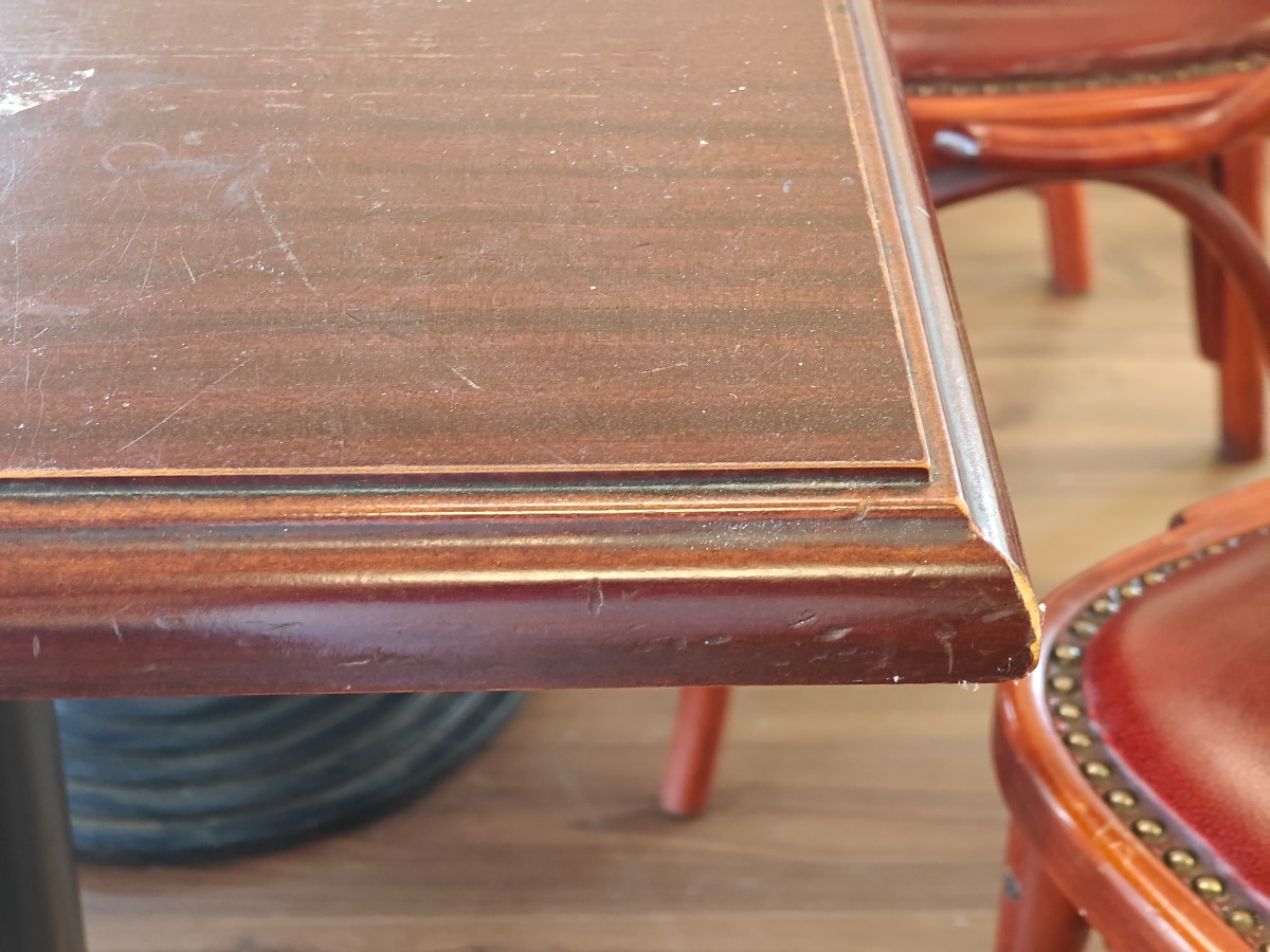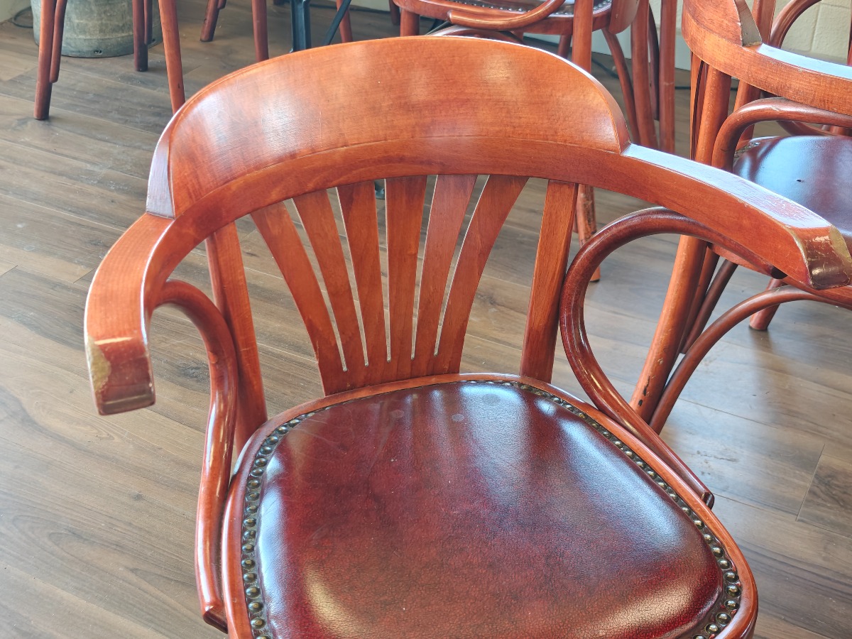3 stk Cafeborde & 8 stk krostole. Mål: borde: 2 stk: L: 60 cm. B: 60 cm. 1 stk: H: 74 cm. L: 120 cm. B: 60 cm. H: 74 cm. Stole m/armlæn og polstrede sæder. Alm brugsspor.