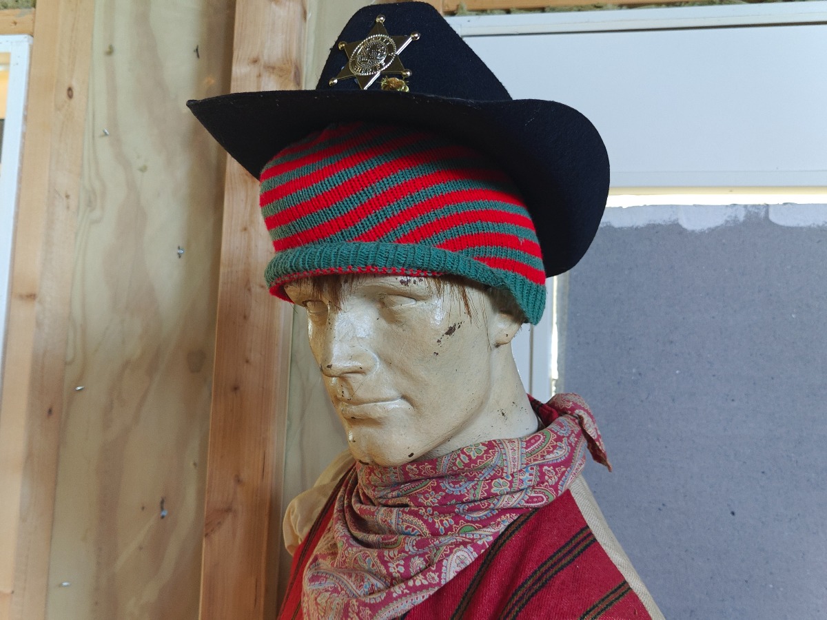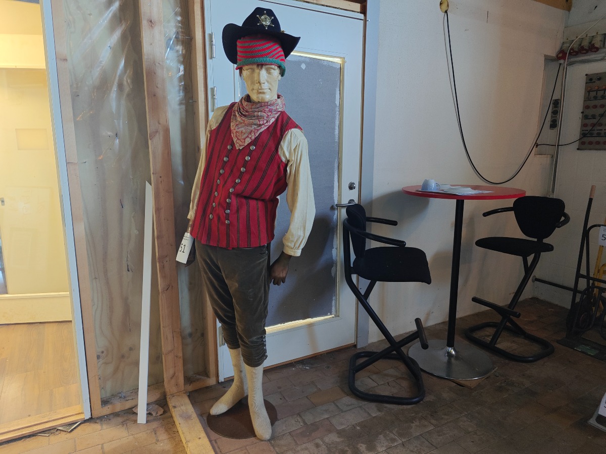 Retro mannequindukke. Incl tøj og fodplade. H: ca. 190 cm. Med patina/brugsspor. Brugt.