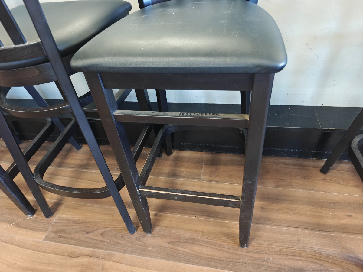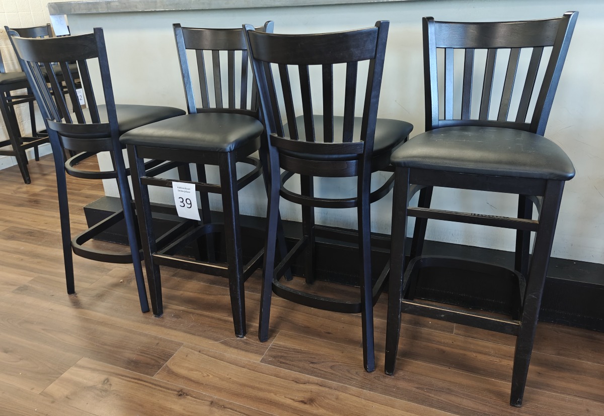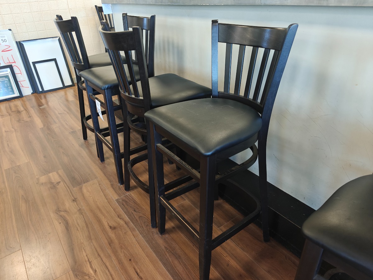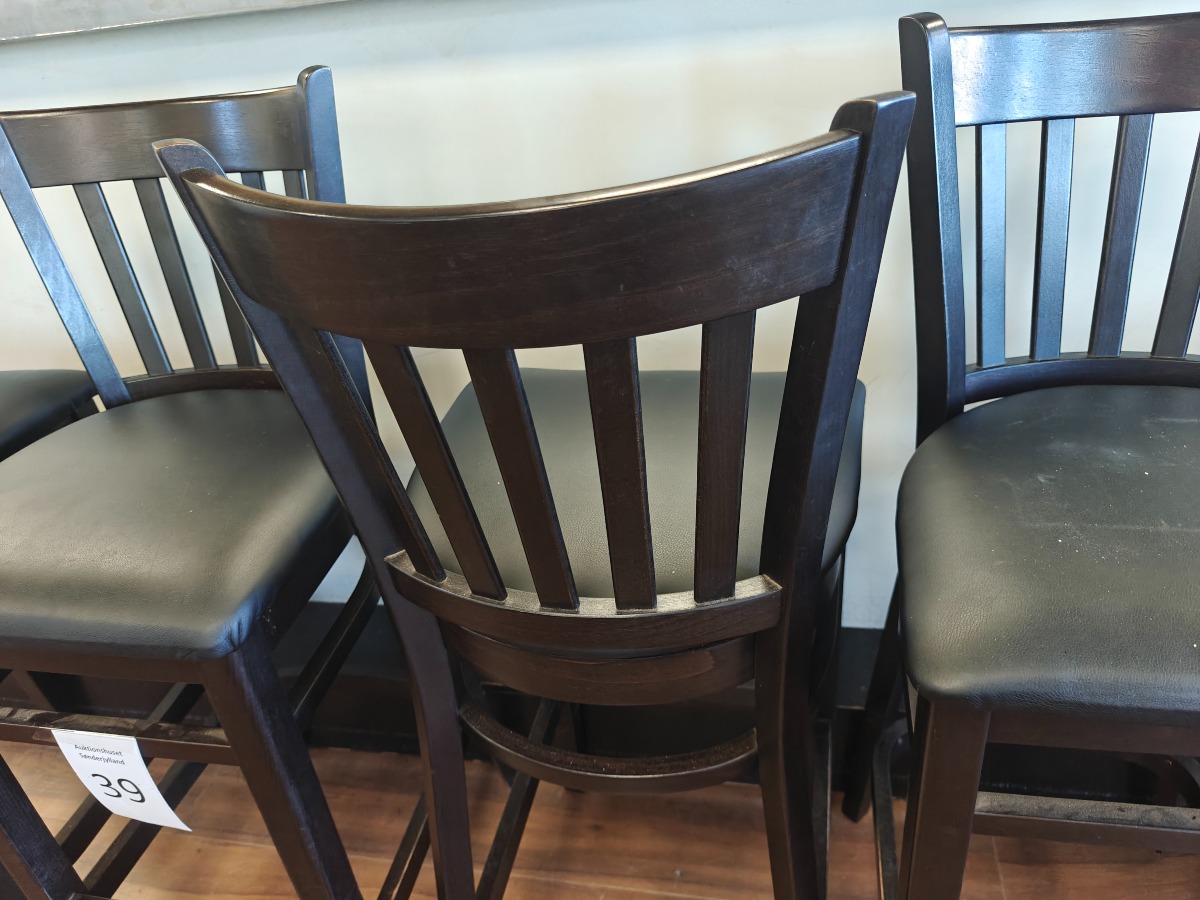 4 stk barstole med polstrede sæder, fodhviler og ryglæn. Stel af træ. Siddehøjde: 77 cm. Brugt og med alm. brugsspor.