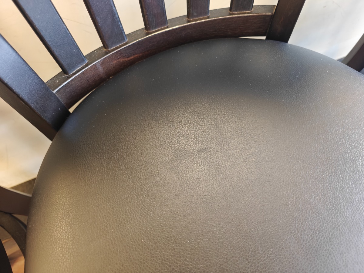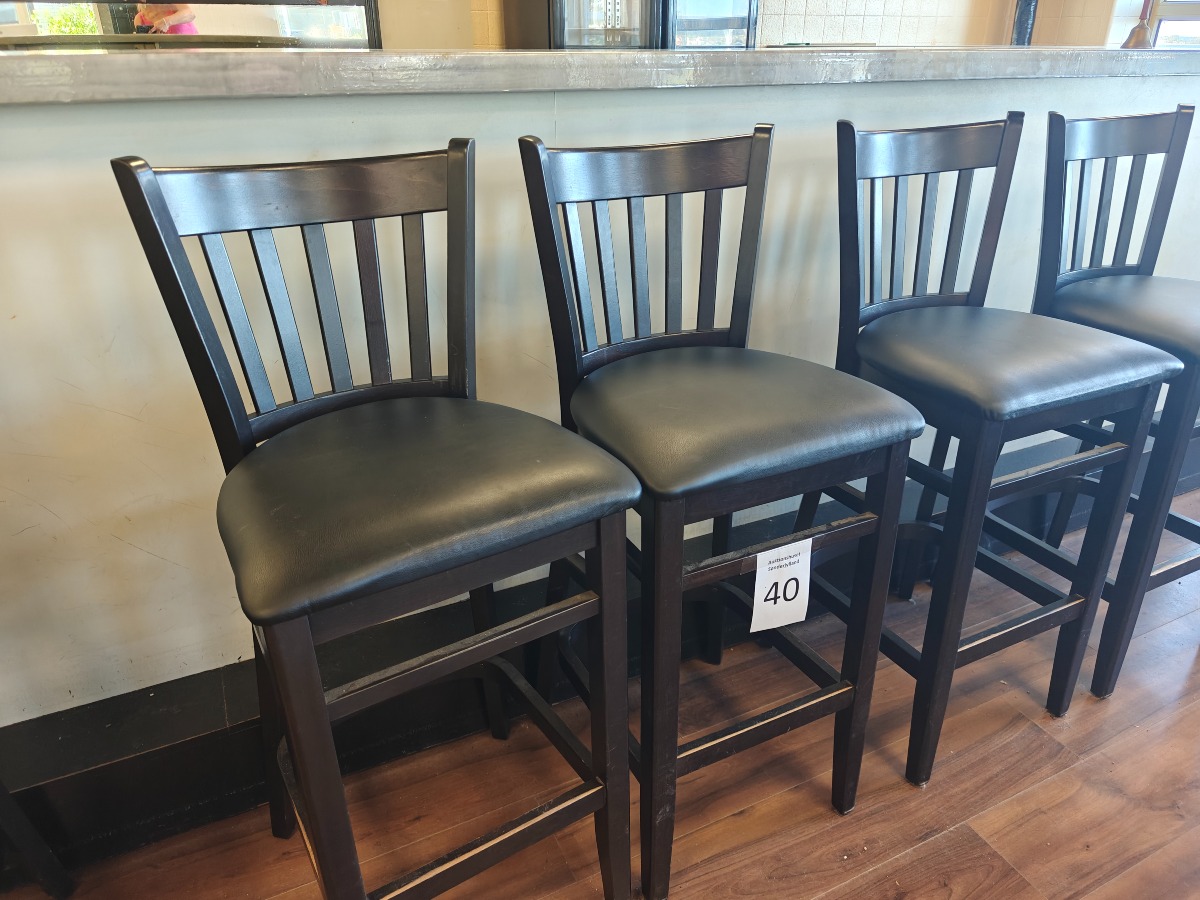 4 stk barstole med polstrede sæder, fodhviler og ryglæn. Stel af træ. Siddehøjde: 77 cm. Brugt og med alm. brugsspor.