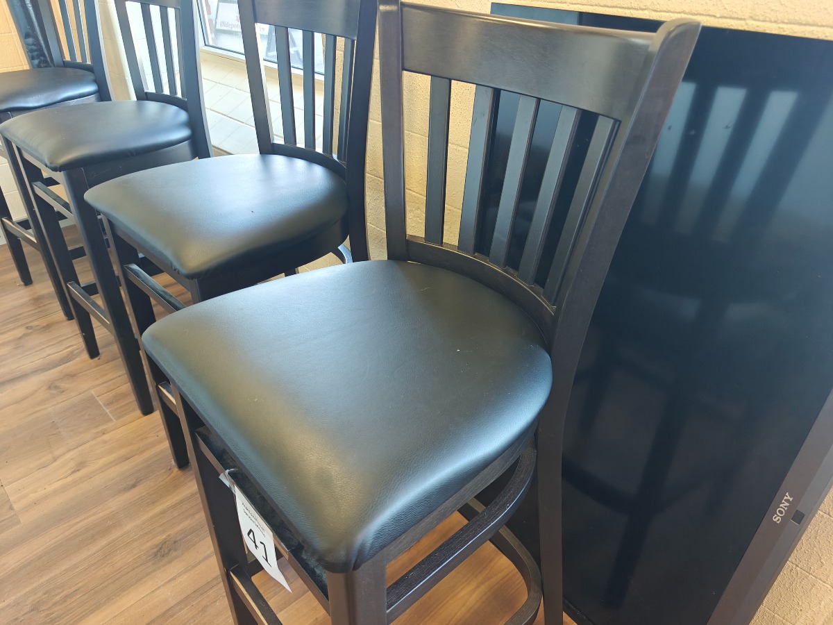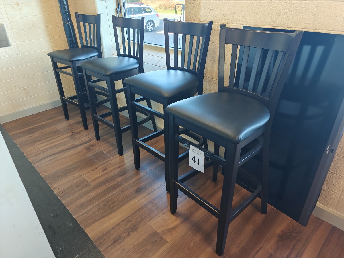 4 stk barstole med polstrede sæder, fodhviler og ryglæn. Stel af træ. Siddehøjde: 77 cm. Brugt og med alm. brugsspor.