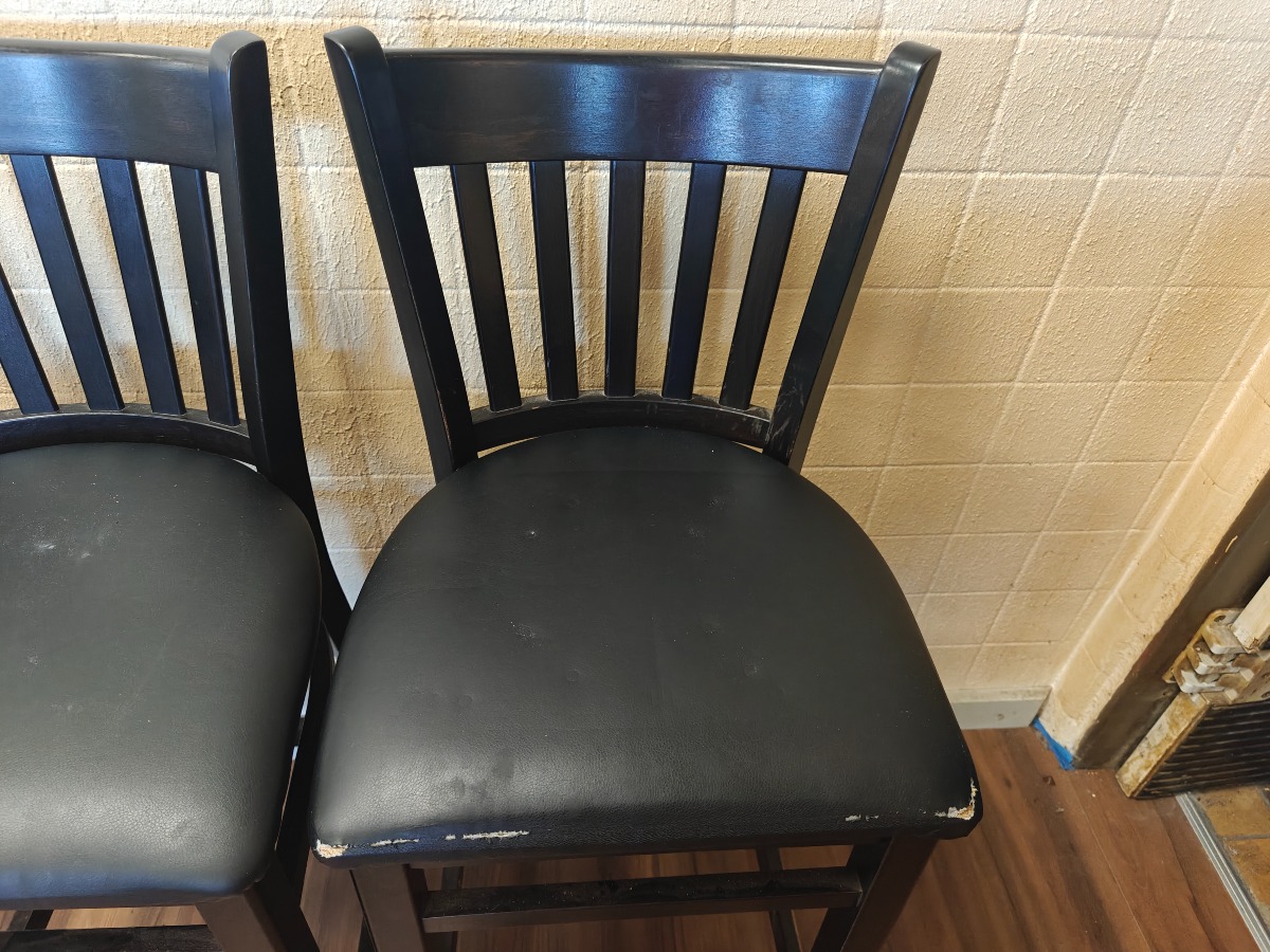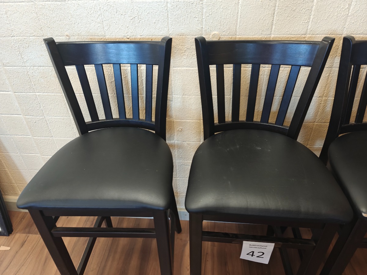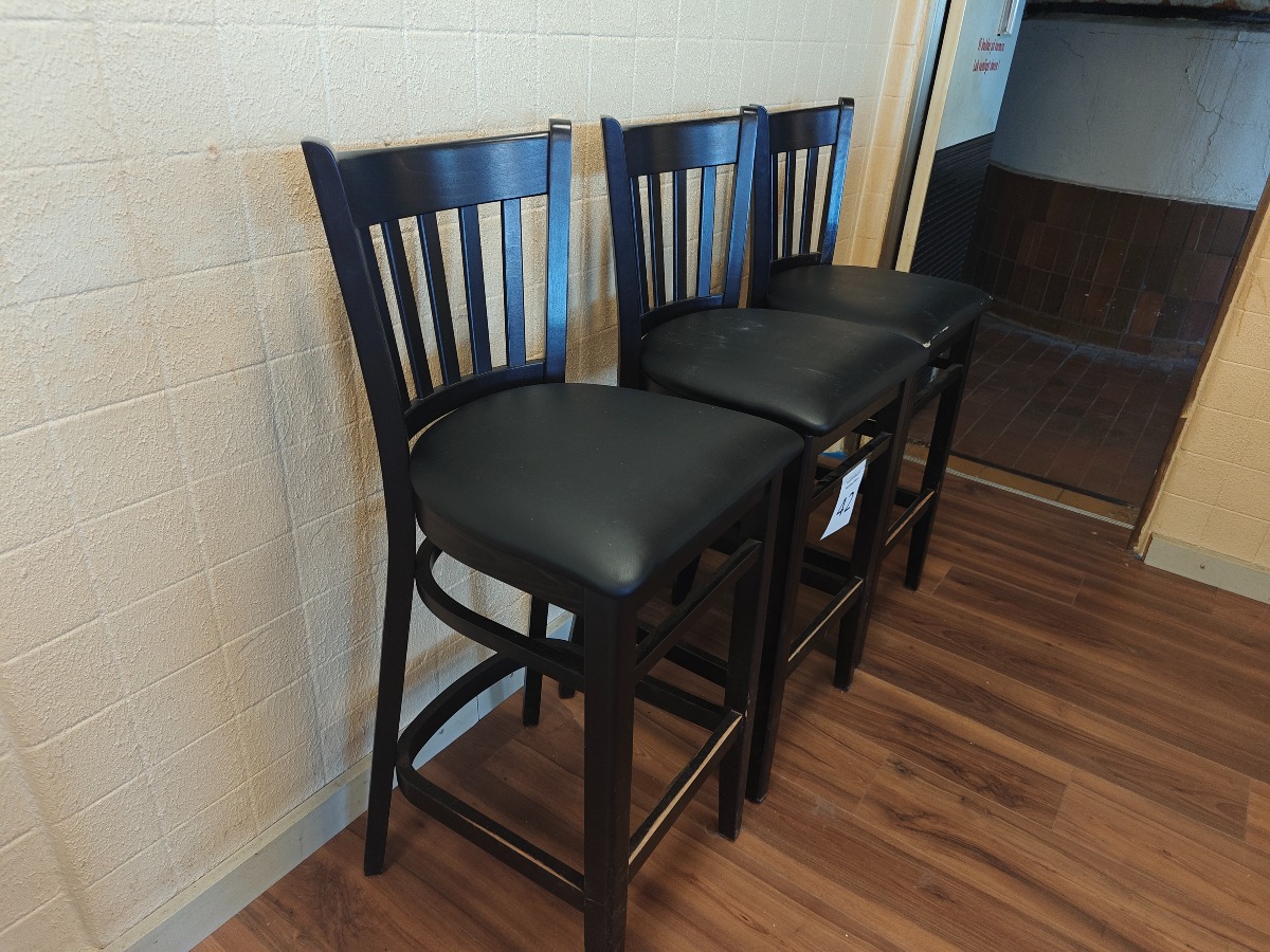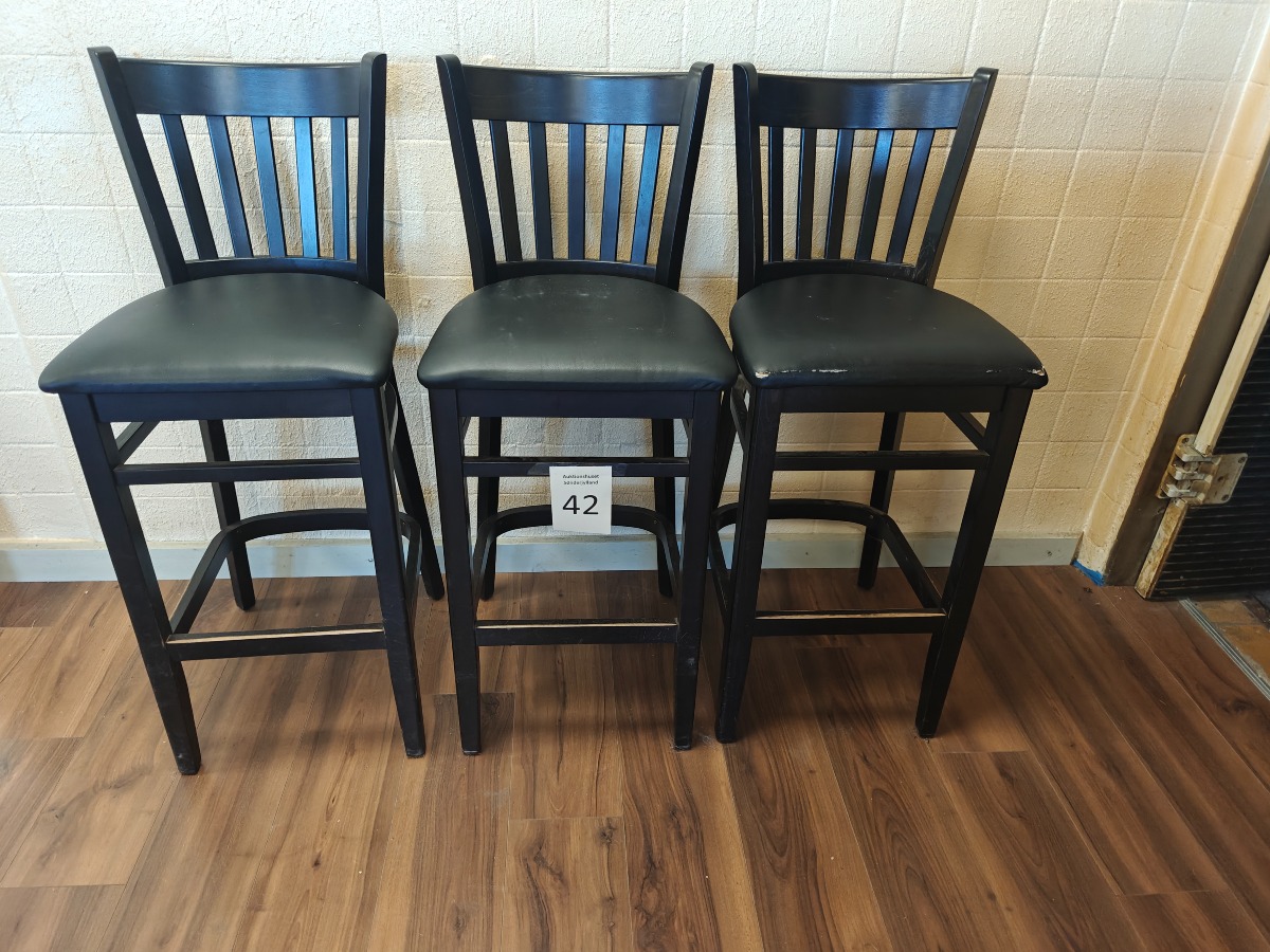 3 stk barstole med polstrede sæder, fodhviler og ryglæn. Stel af træ. Siddehøjde: 77 cm. 2 stk med alm. brugsspor, samt 1 med slid på sæde. Brugt og med alm. brugsspor.