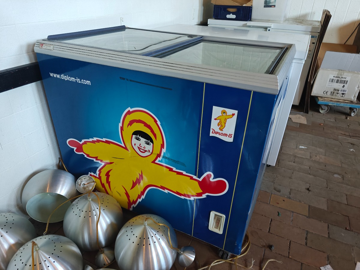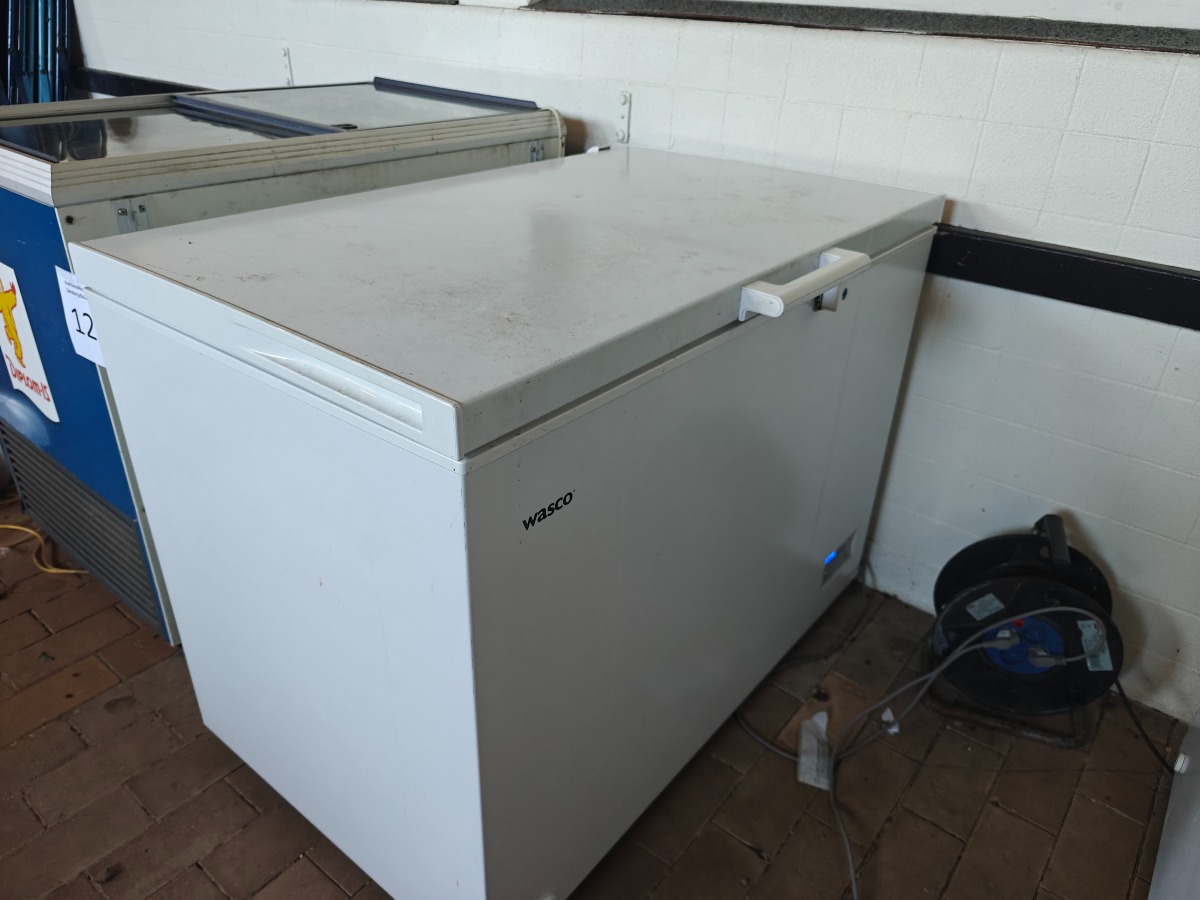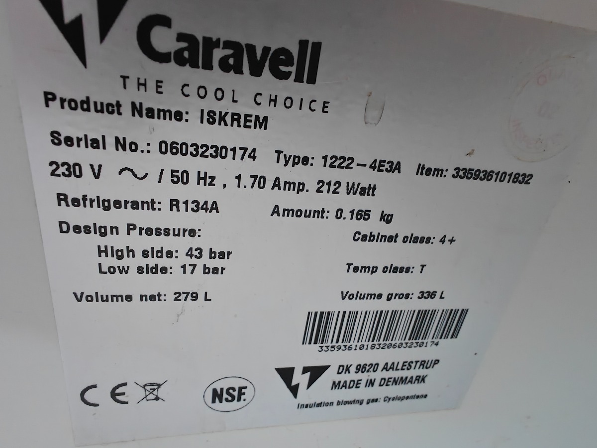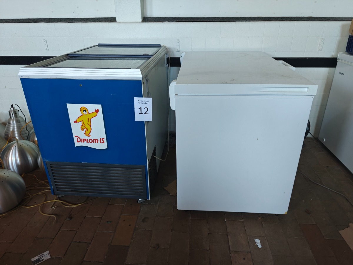 Display isfryser & kummefryser. Displayfryser: Mrk: Caravell. Type: 1222-4E3A. Produktnavn: Iskrem. Volume: 279L. Kummefryser: Mrk: Wasco. Begge frysere er på hjul. Brugte.