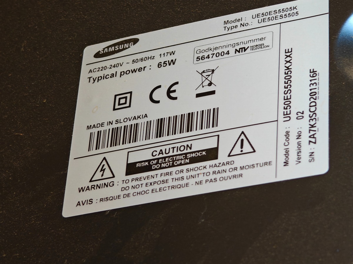 2 stk fladskærme, heraf 1 stk smart TV af Mrk. Samsung. 50" Model: UE50ES5505KXXE. Version 02. 1 stk Fladskærms TV. Mrk Sony. 46". Model: KDL-46EX710. Der medfølger fjernbetjening til begge. Brugte. Selvnedtagning. Husk værktøj.