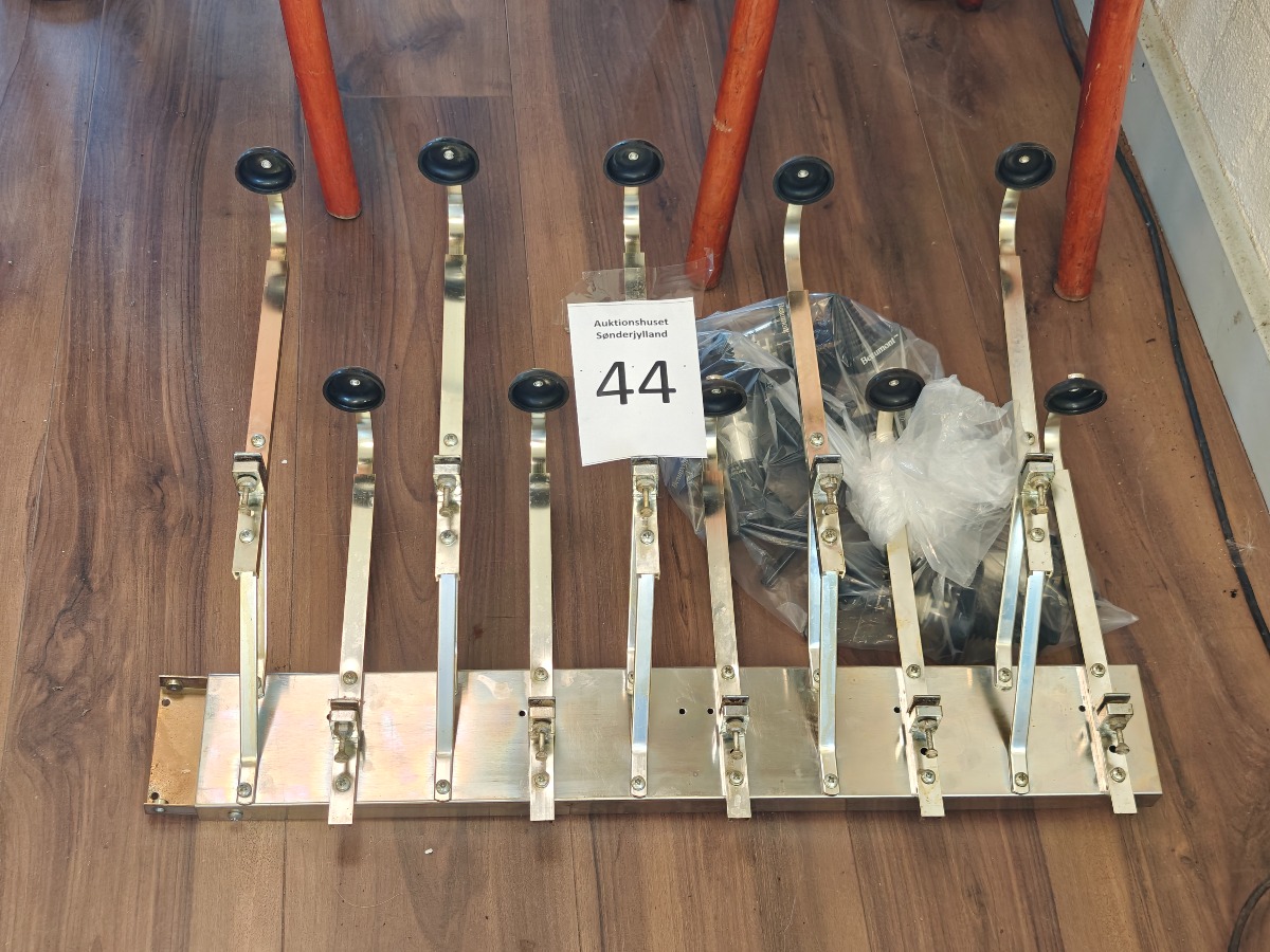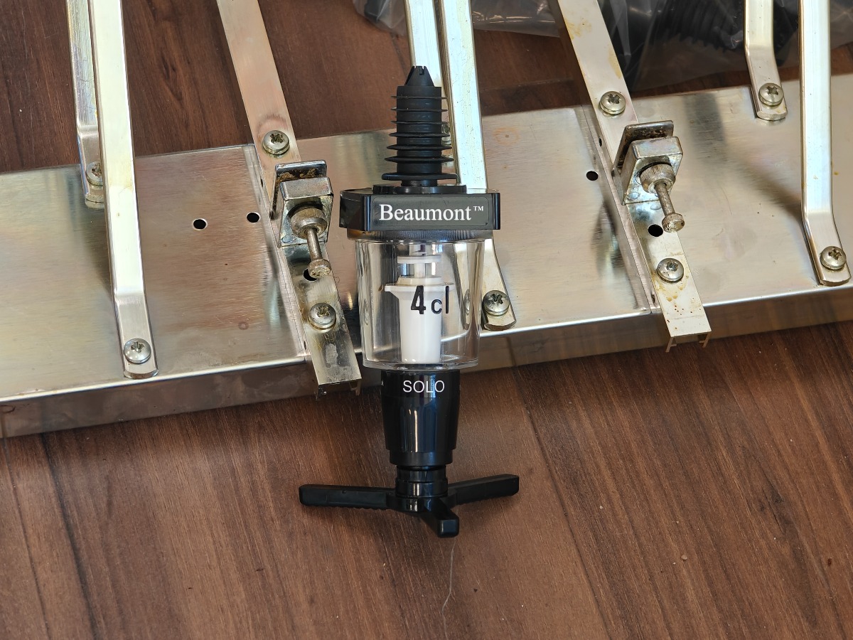 Spiritusdispensere til vægmontering. Til 10 flasker. Tappe-/doseringshætter medfølger. Brugt.