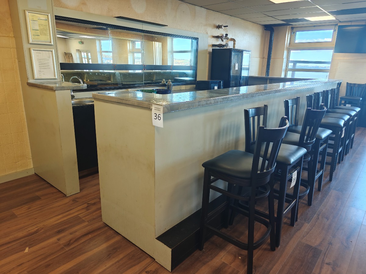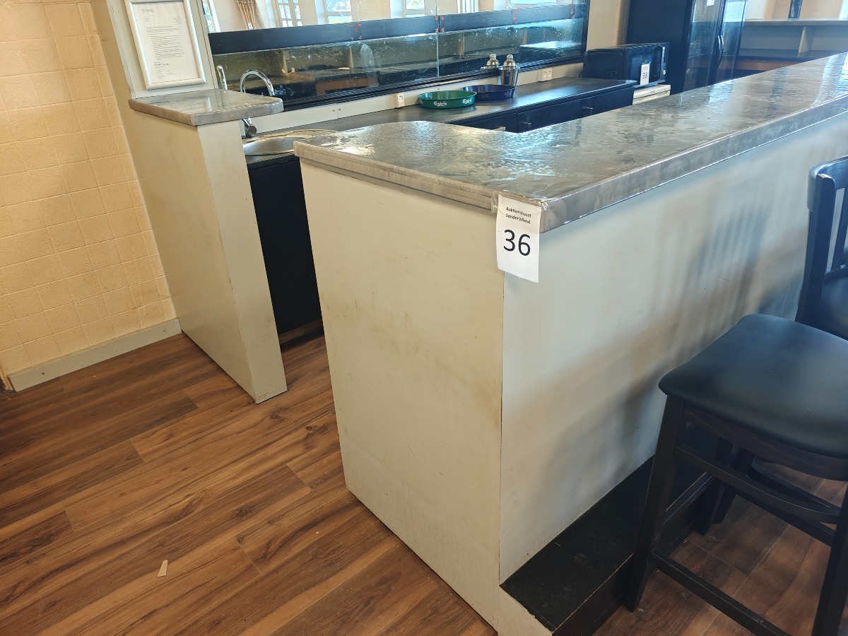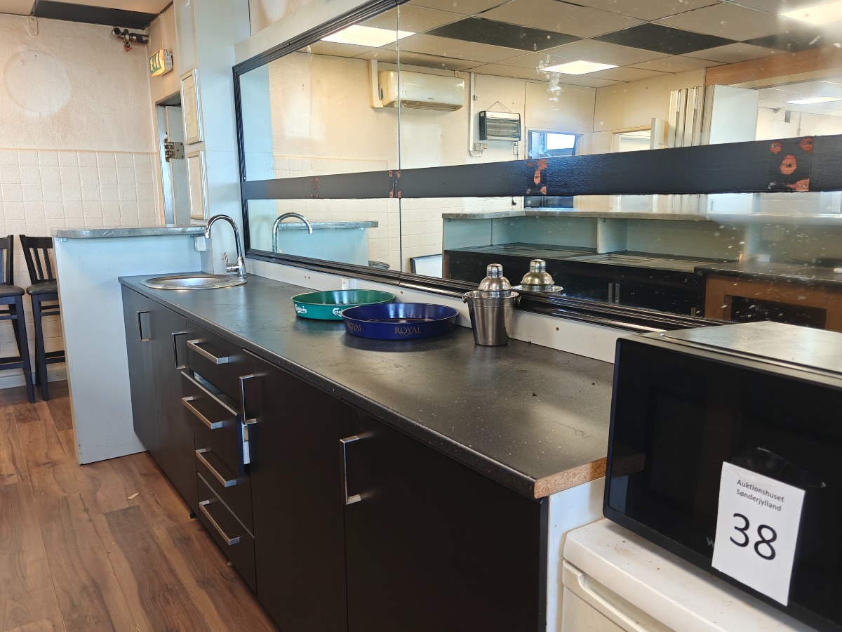 Stor bar med indbygget køler, vask, skabe mm. Inkl. indhold i skabe: Glas, bakker mm. Mål: Front/bardisk: Kortside - højre side af bardisk: L: 245 cm. Langside af bardisk: 575 cm. Kortside venstre side af bardisk: 90 cm. Anretningsbord: 302 cm. Spejl: L: 300 cm. Indhold i skabe samt spejl bag baren medfølger. Køleskab, fryser, microovn samt andre løsdele på/ved bar medfølger ikke, men udbydes seperat (se kat. nr 37-38). OBS: Køber skal selv nedtage baren (over sokkel.). Husk værktøj og læssegrej. Vi opfordrer interesserede bydere til at komme og bese baren til eftersyn.