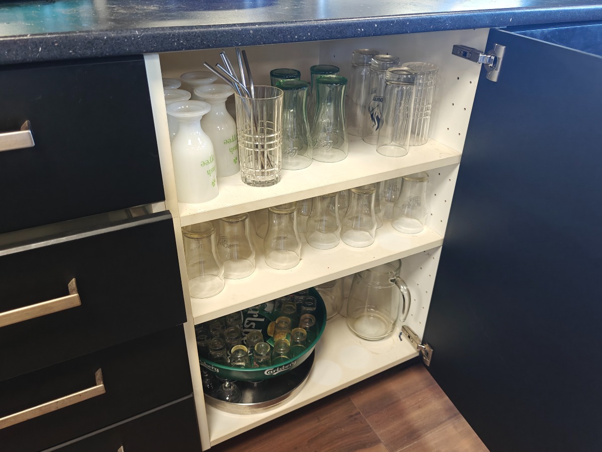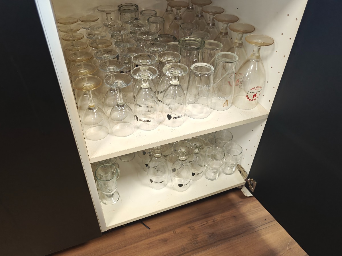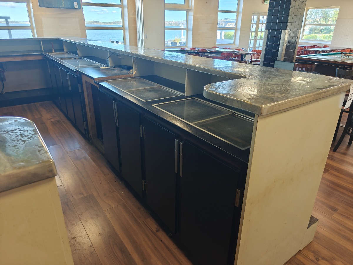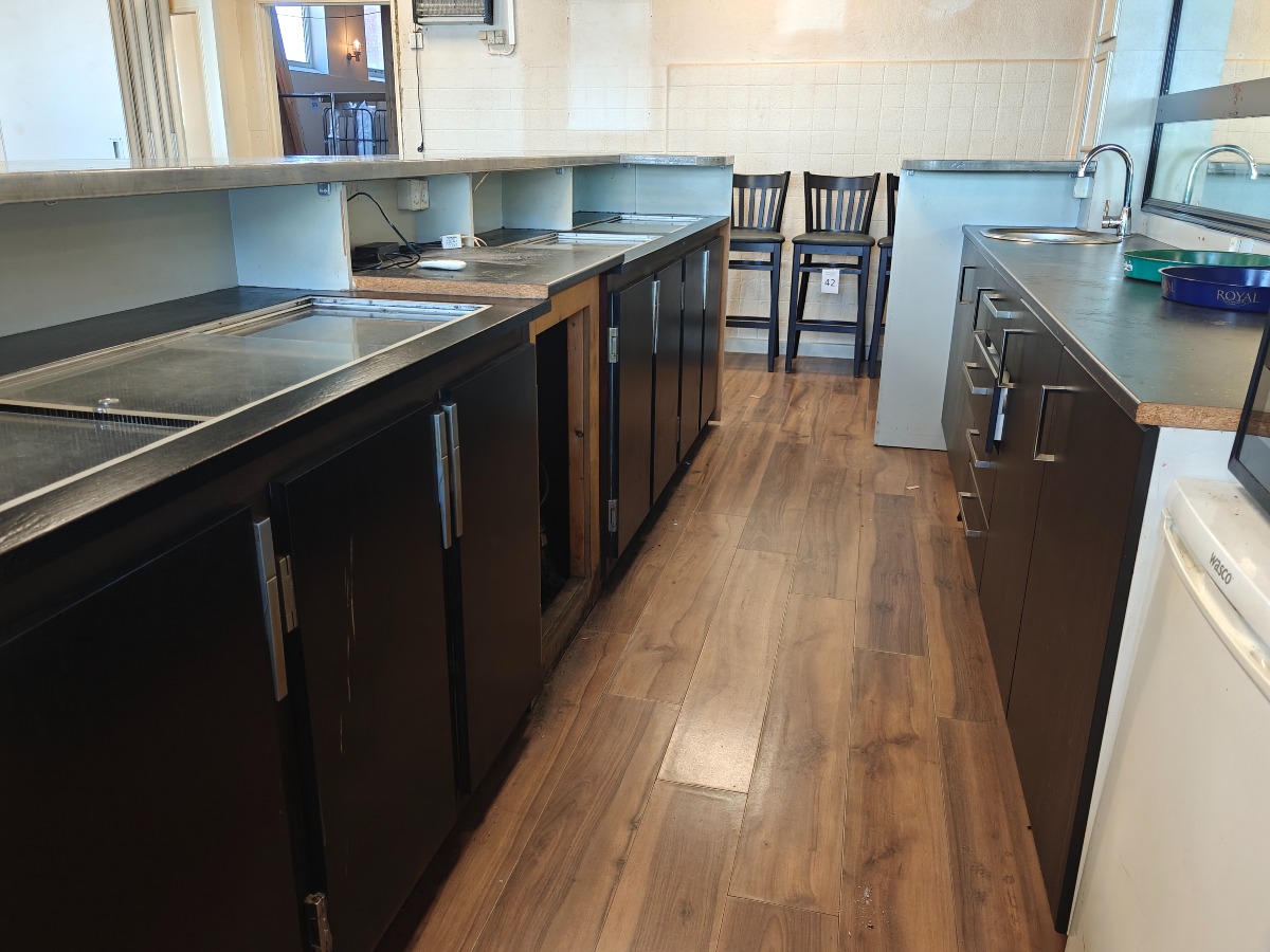 Stor bar med indbygget køler, vask, skabe med indhold mm.
