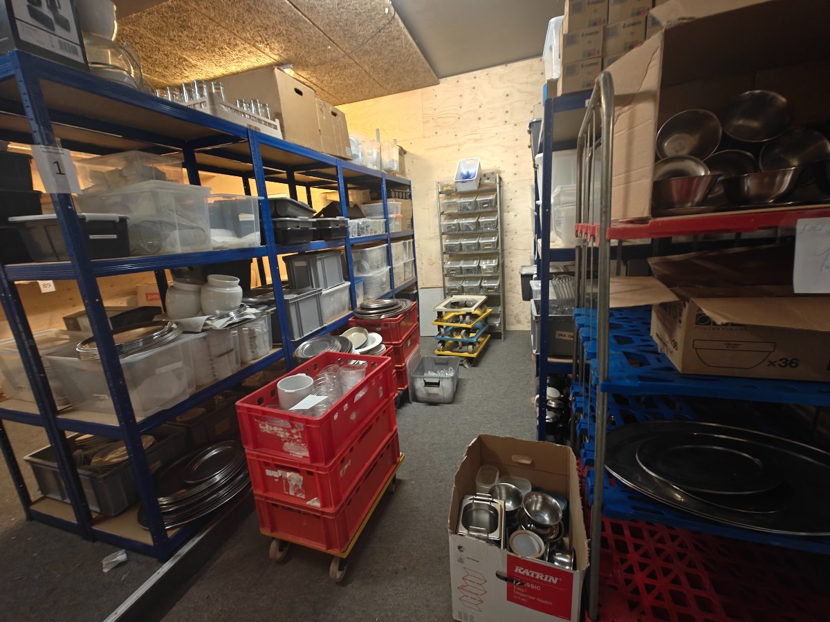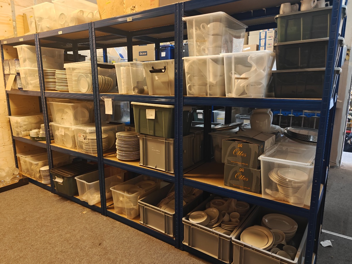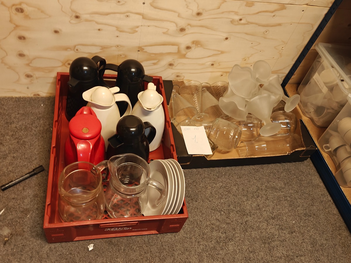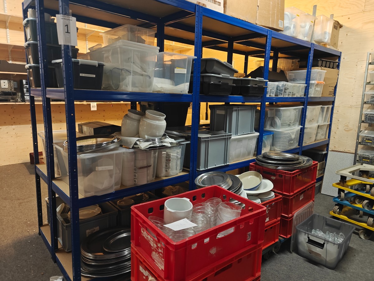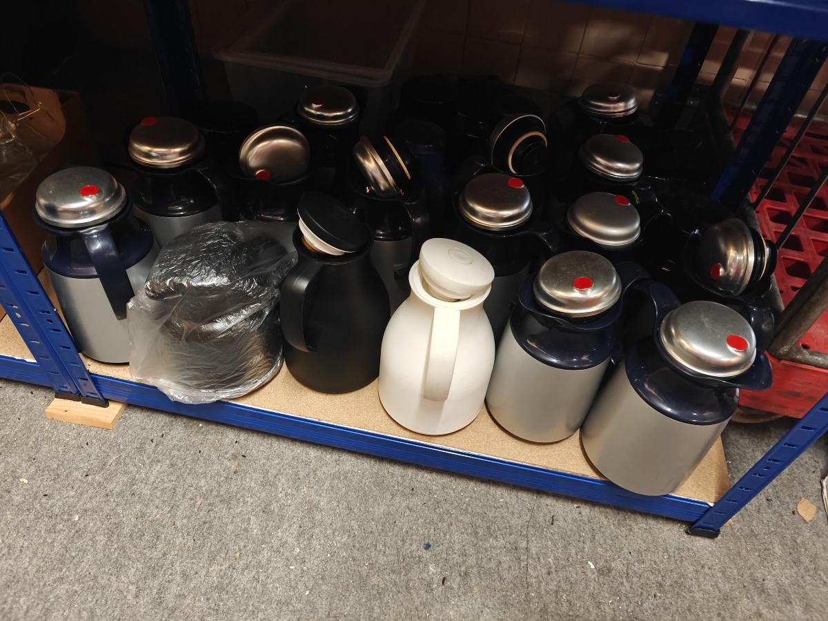 Tøm reolerne: Service til ca. 200 personer - termokander, fade, stager mm. Brugt. Stålreoler og varebur medfølger ikke.