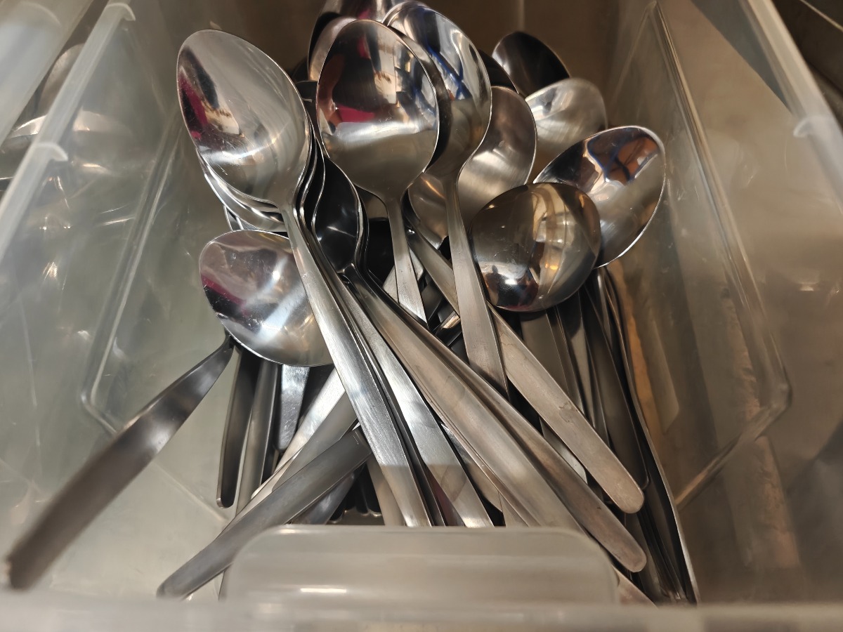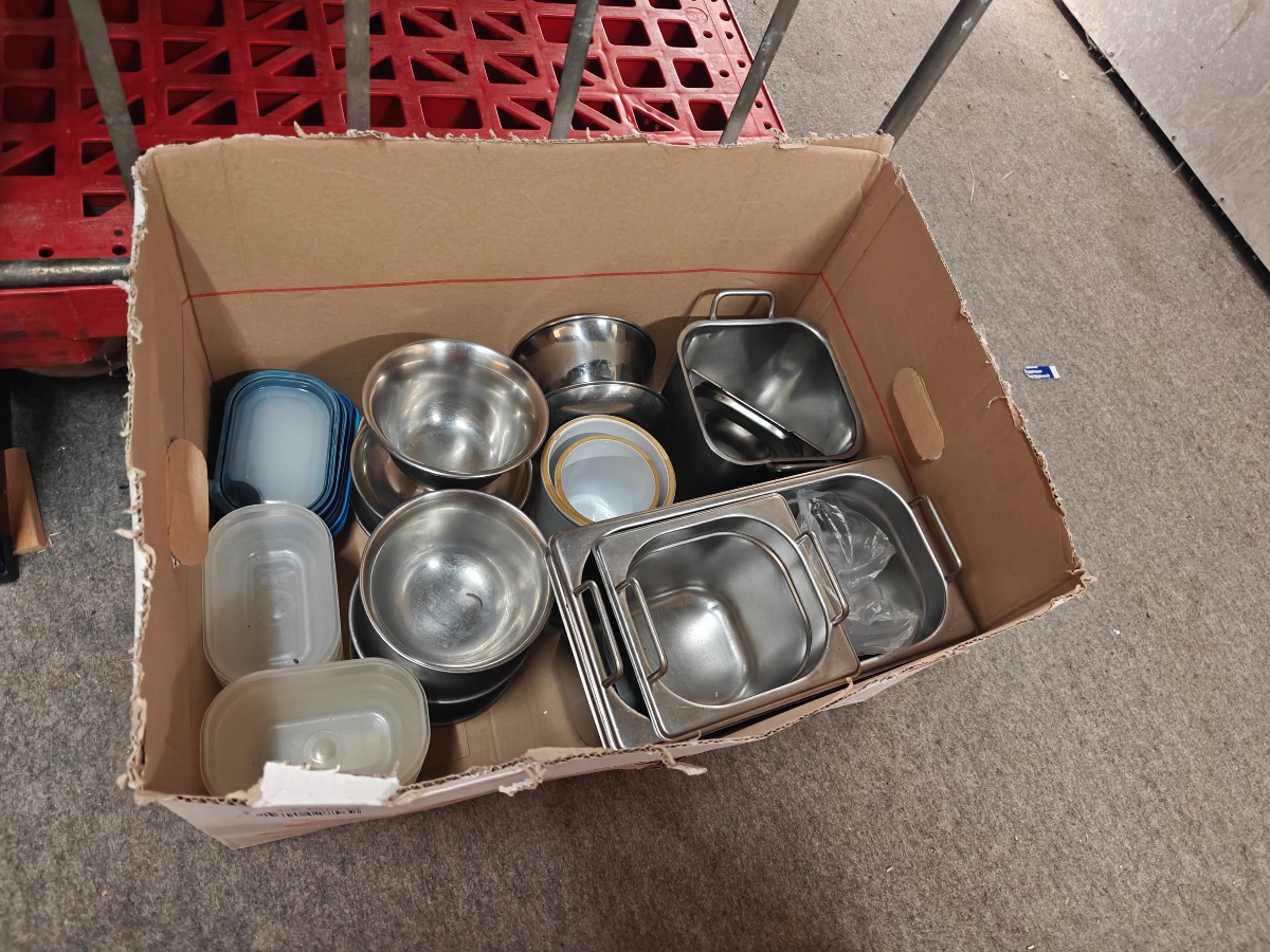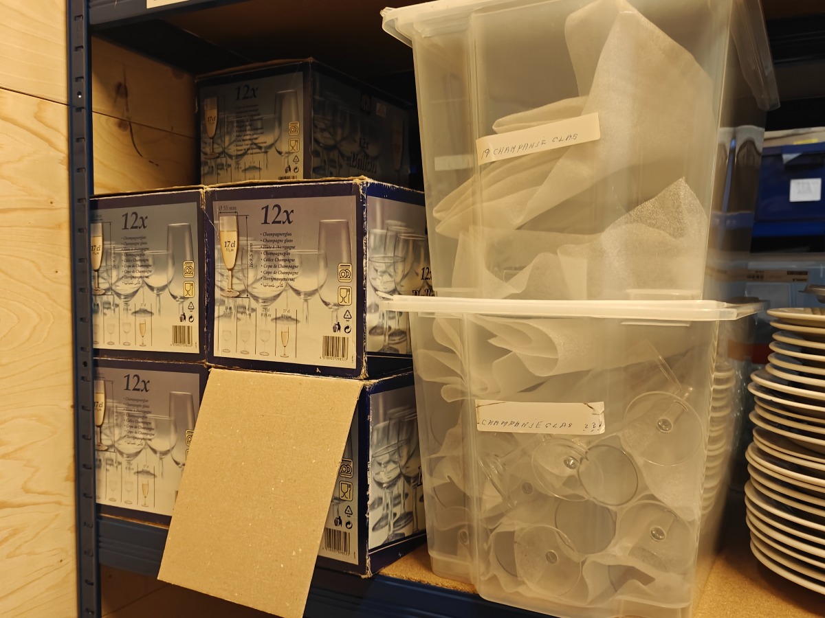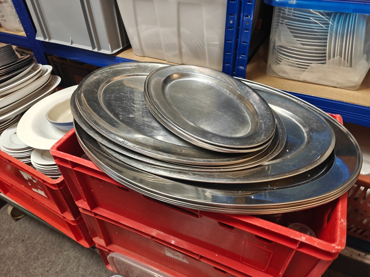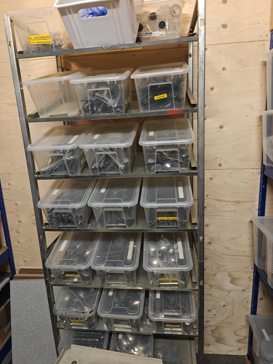Tøm reolerne: Service til ca. 200 personer - termokander, fade, stager mm. Brugt. Stålreoler og varebur medfølger ikke.
