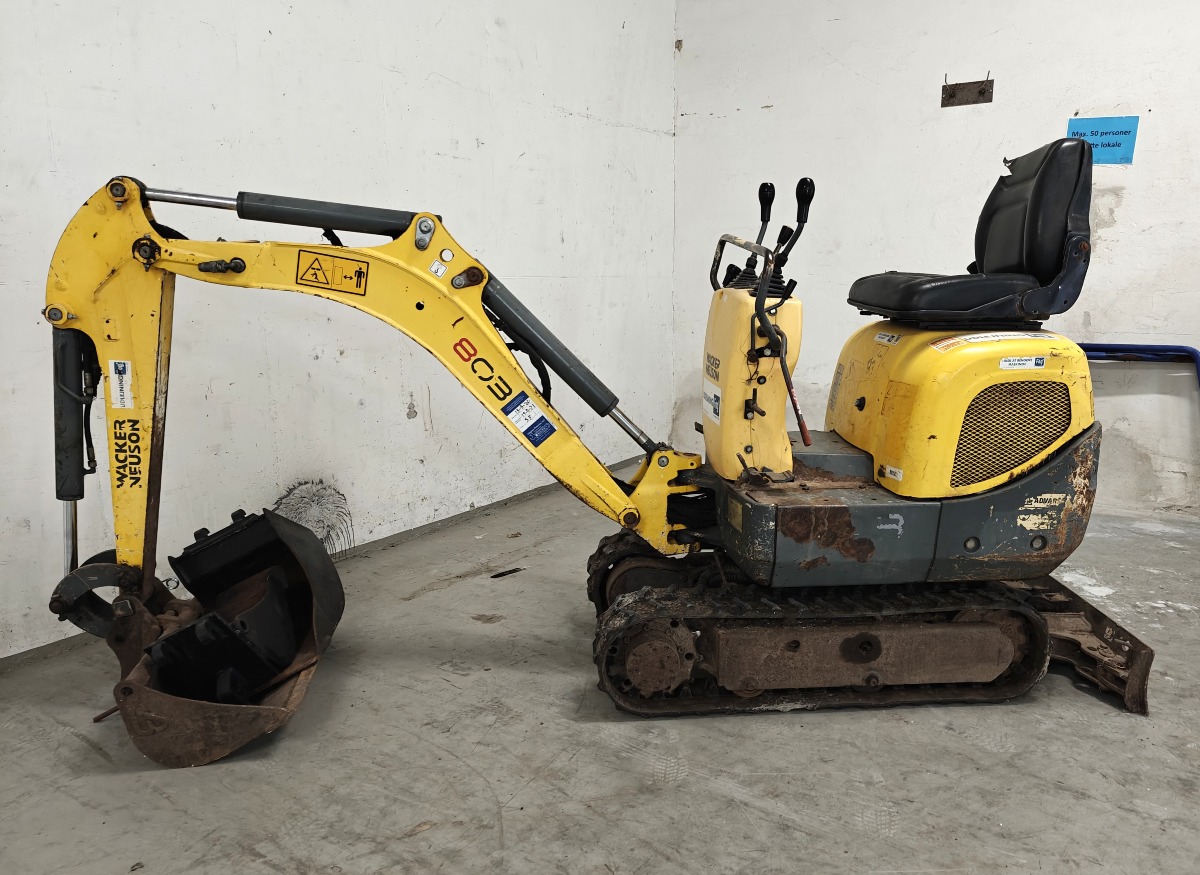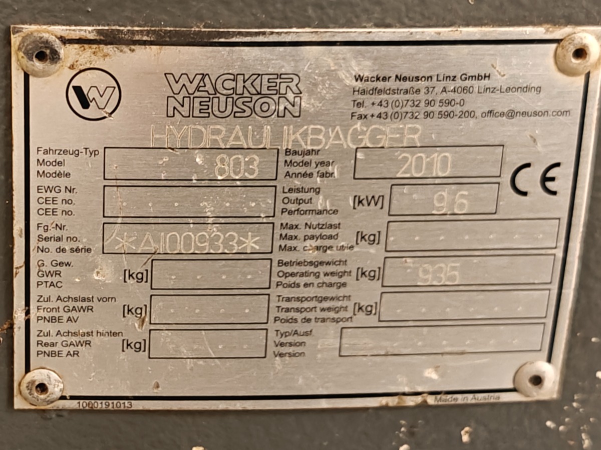 Wacker Neuson gravemaskine på larvebånd incl div skovle. Model: 803. Årgang: 2010. Motorydelse: 9.6 kW. Bruttovægt: 935 kg. Serienummer:  *A100933*.  Der medfølger 6 skovle: 3 stk der passer til beslag: 22 cm, 27 cm og 80 cm samt 3 skovle, som skal tilpasses (på palle): 24 cm, 32 cm og 80 cm. Vi opfordrer interesserede bydere til at komme og bese maskinen ifm. eftersyn.