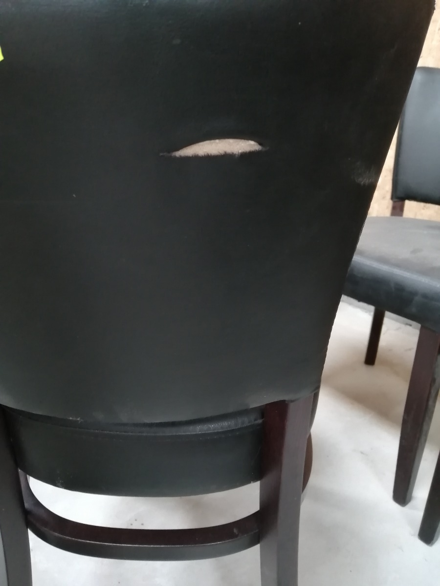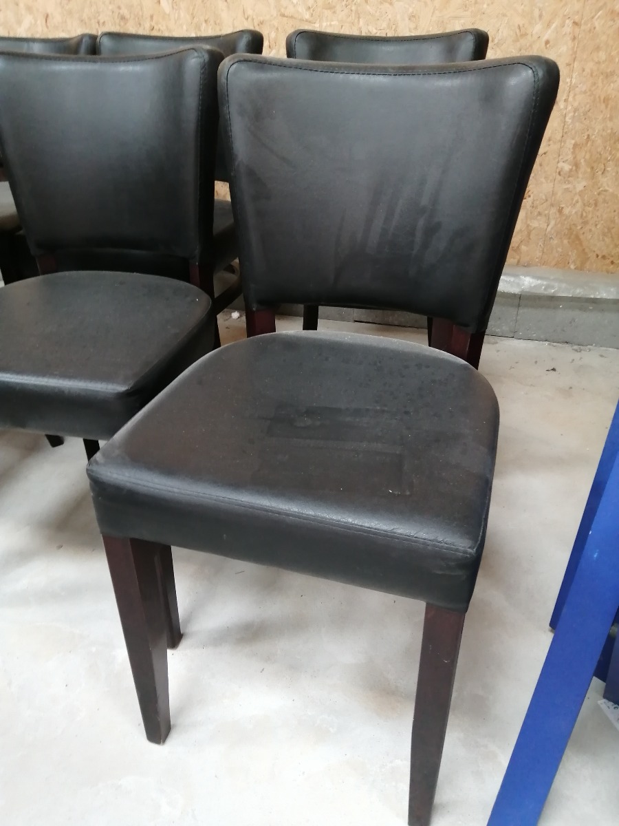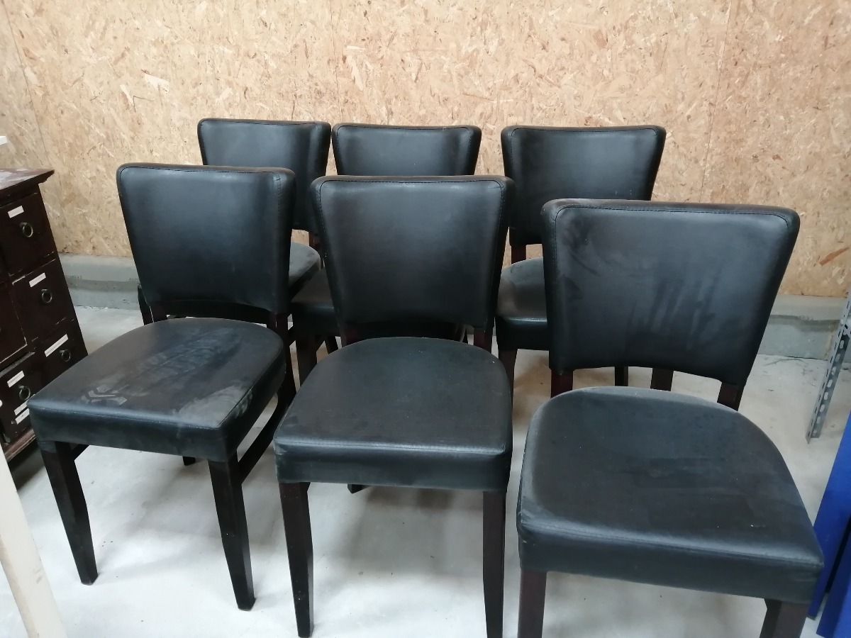 6 stk. sorte spisebordsstole. De har diverse bruggspor på benene og sæderne. 2 af dem er i stykker på ryglæn og flere af dem har hul i understof. De trænger til grundig rengøring.