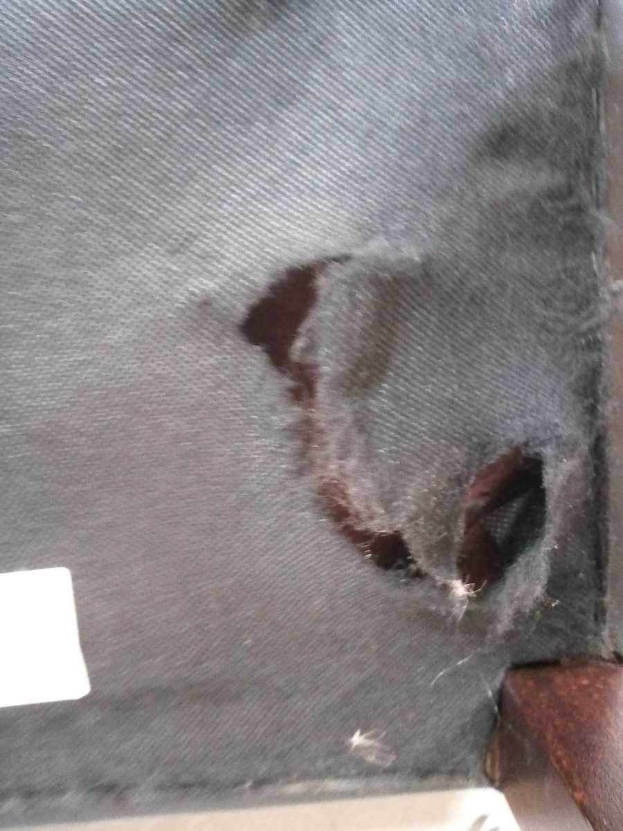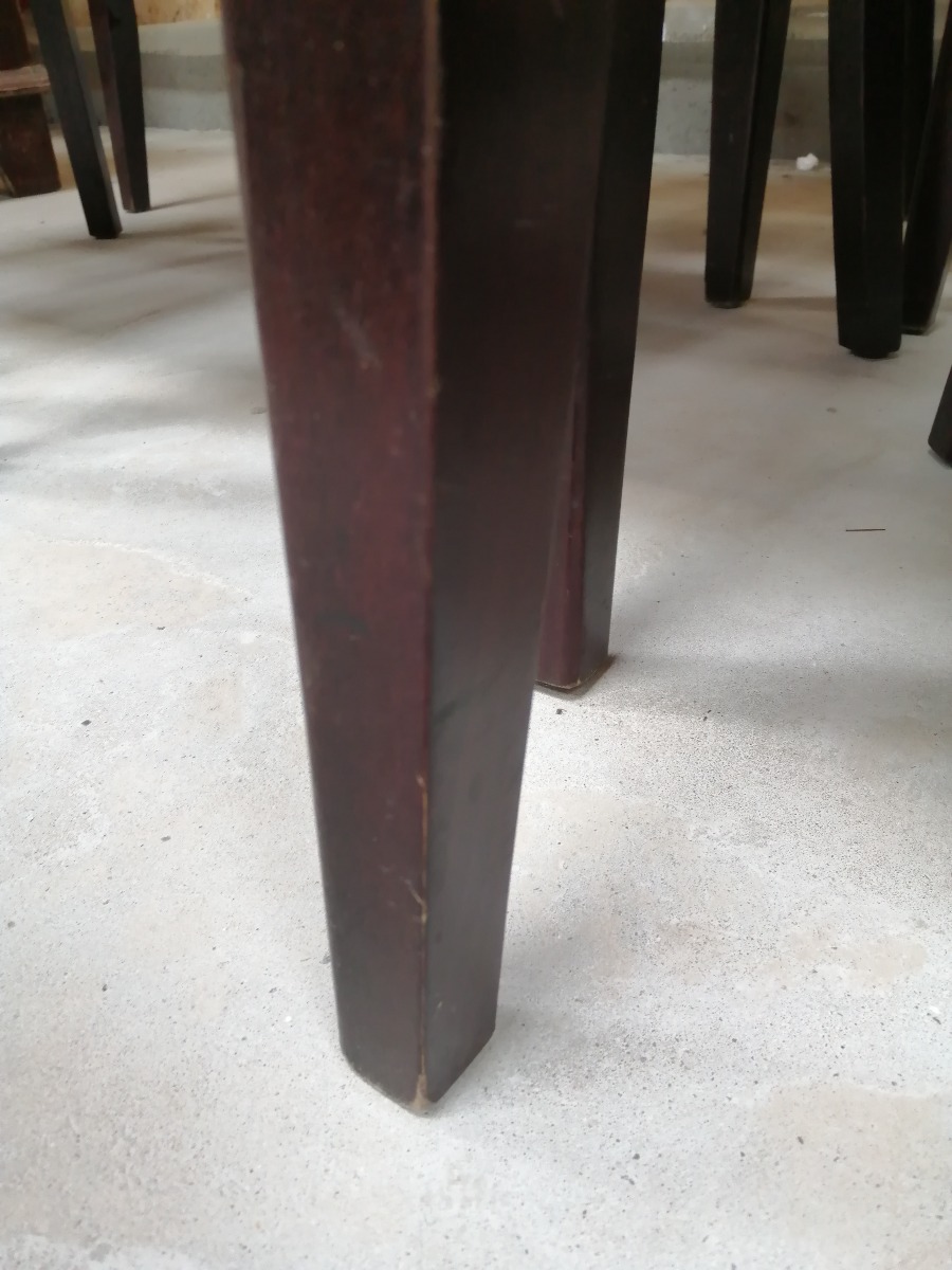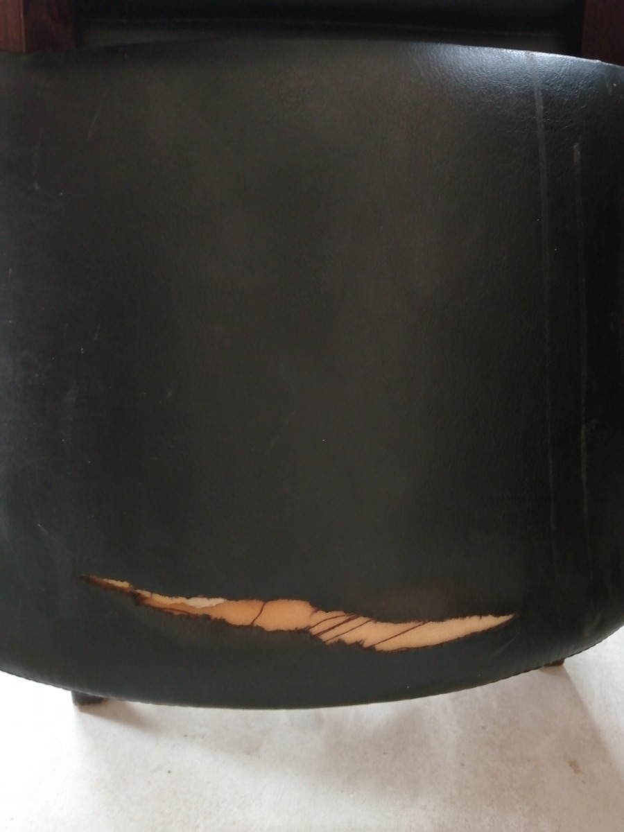 6 stk. sorte spisebordsstole. De har diverse bruggspor på benene og sæderne. 2 af dem er i stykker på ryglæn og flere af dem har hul i understof. De trænger til grundig rengøring.