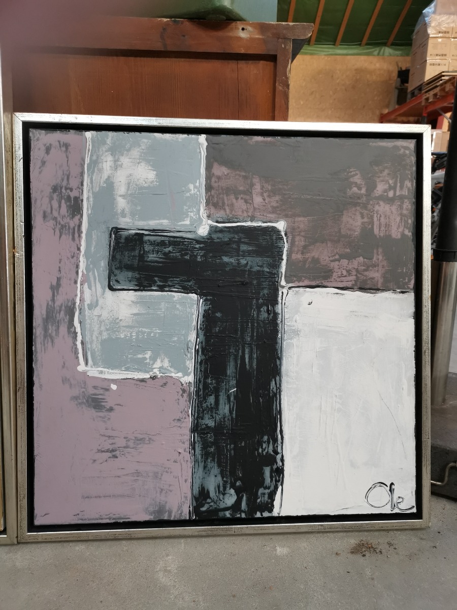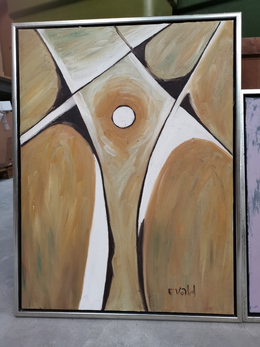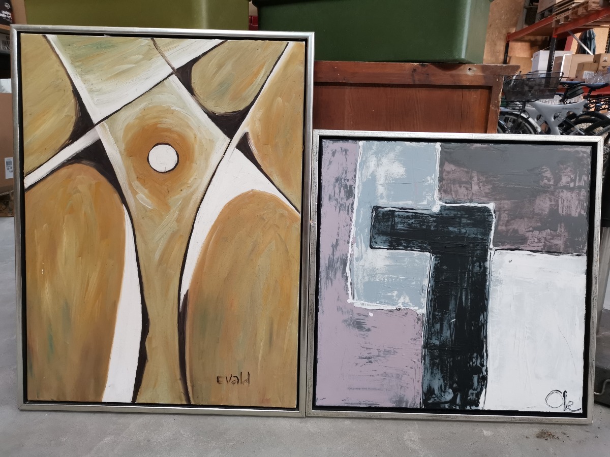 2 stk. malerier med abstrakt motiv. Ubekendte kunstnere. Mål: 85 x 64 cm. og 64 x 64 cm.