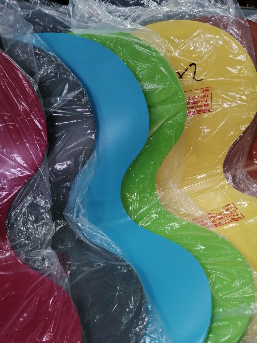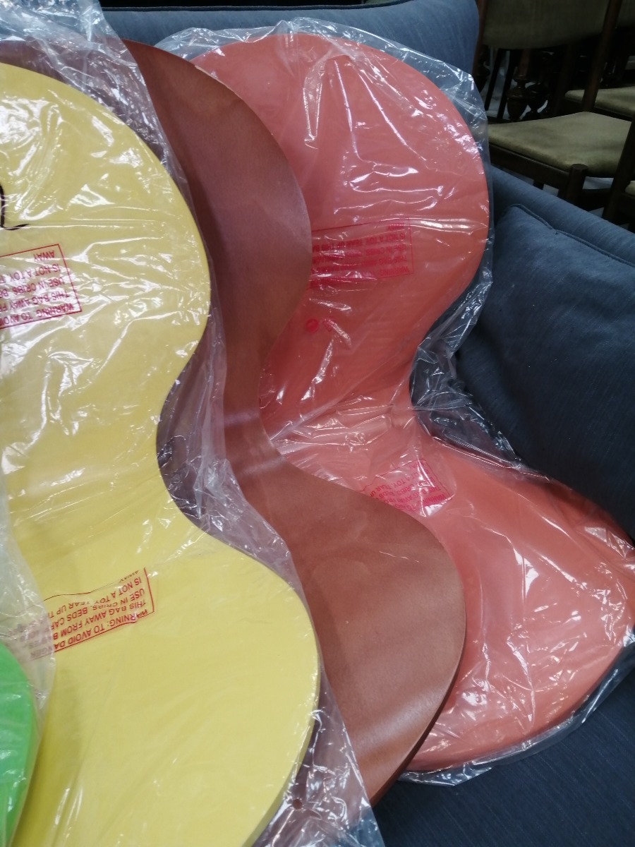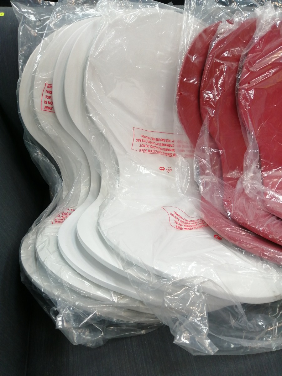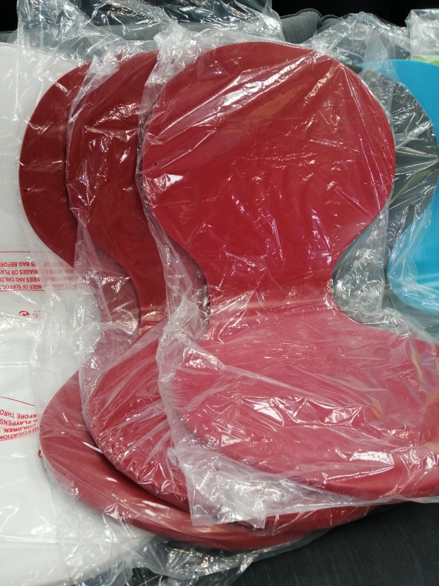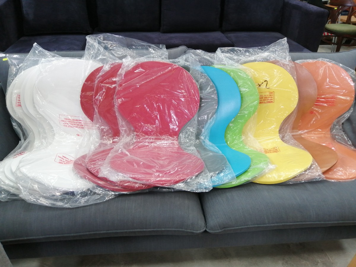 13 stk. skal stole i forskellige farver - UDEN ben. 4 stk. hvide, 1 stk. grå, 1 stk. blå, 1 stk. grøn, 1 stk. gul, 1 stk. brun, 1 stk. orange og 3 stk. røde. Nogle af dem har enkelte små brugsspor. Oversete fejl kan forekomme. Der er en ekstra hvid stol, men den har en del ridser.