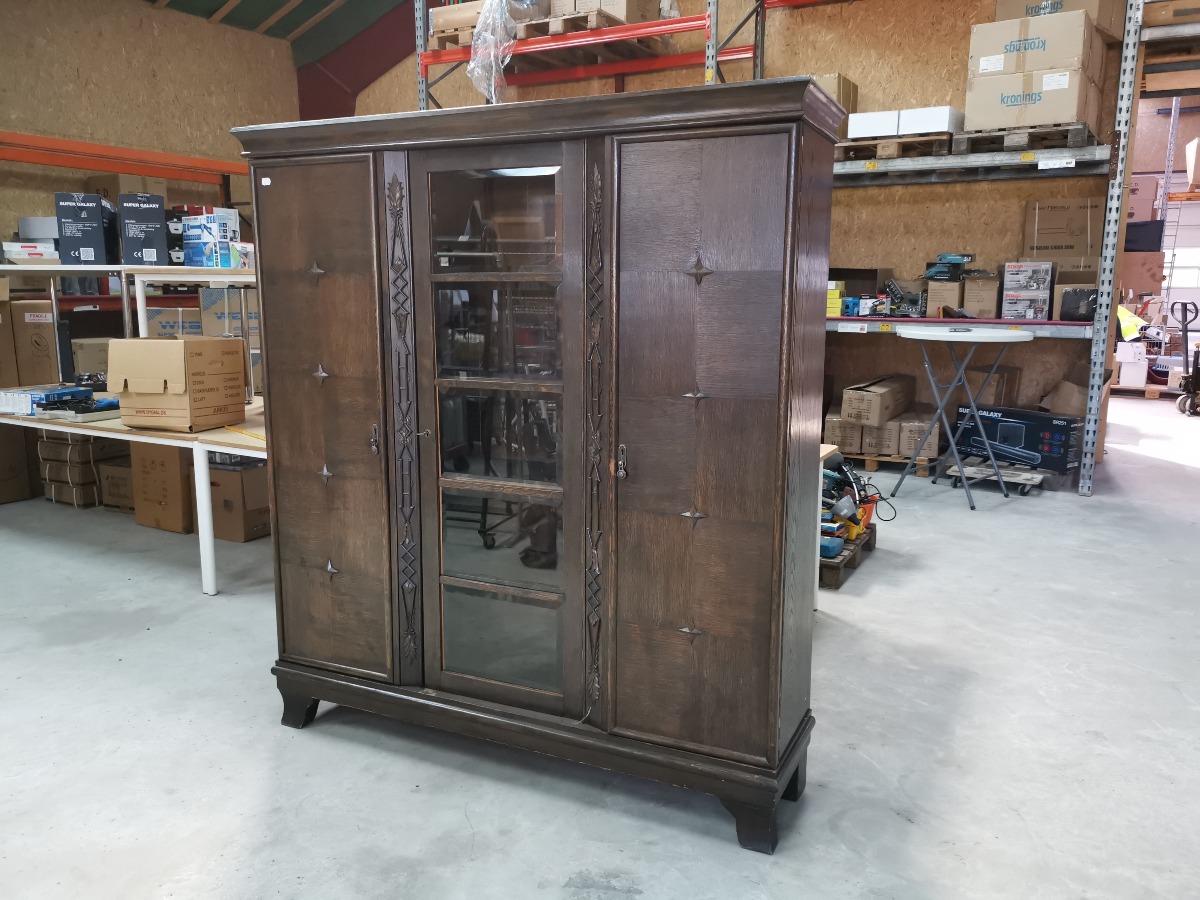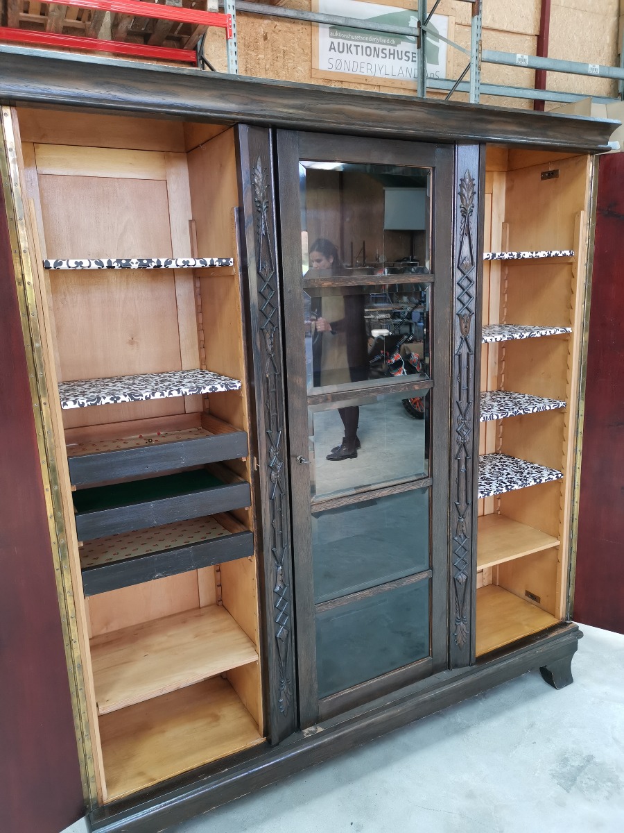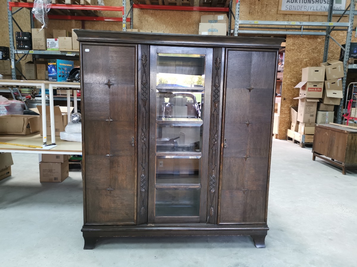 3-fløjet skab af mørkbejdset eg. Midterste låge med faceteret glas. Front prydet med udskæringer. Indrettet med skuffer og hylder. H. 182, B. 160, D. 40 cm.