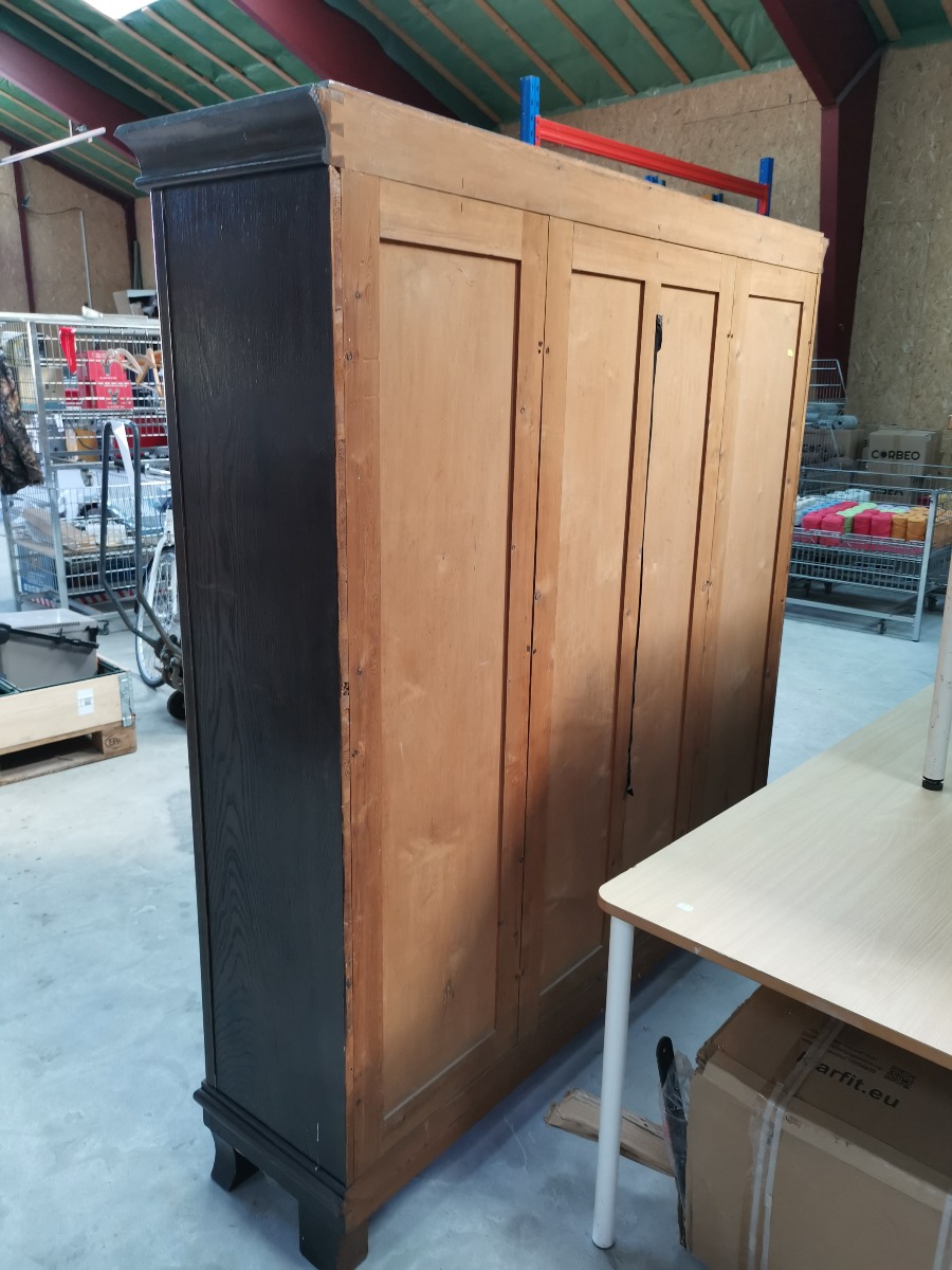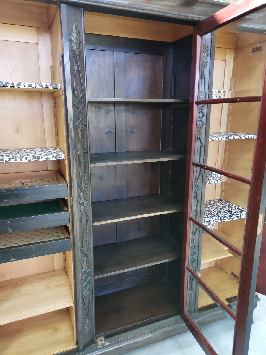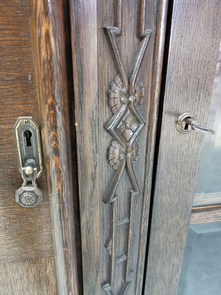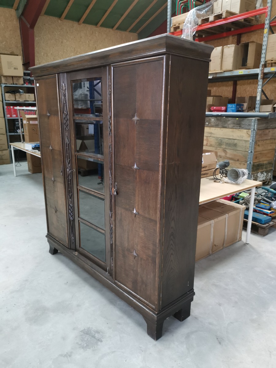 3-fløjet skab af mørkbejdset eg. Midterste låge med faceteret glas. Front prydet med udskæringer. Indrettet med skuffer og hylder. H. 182, B. 160, D. 40 cm.