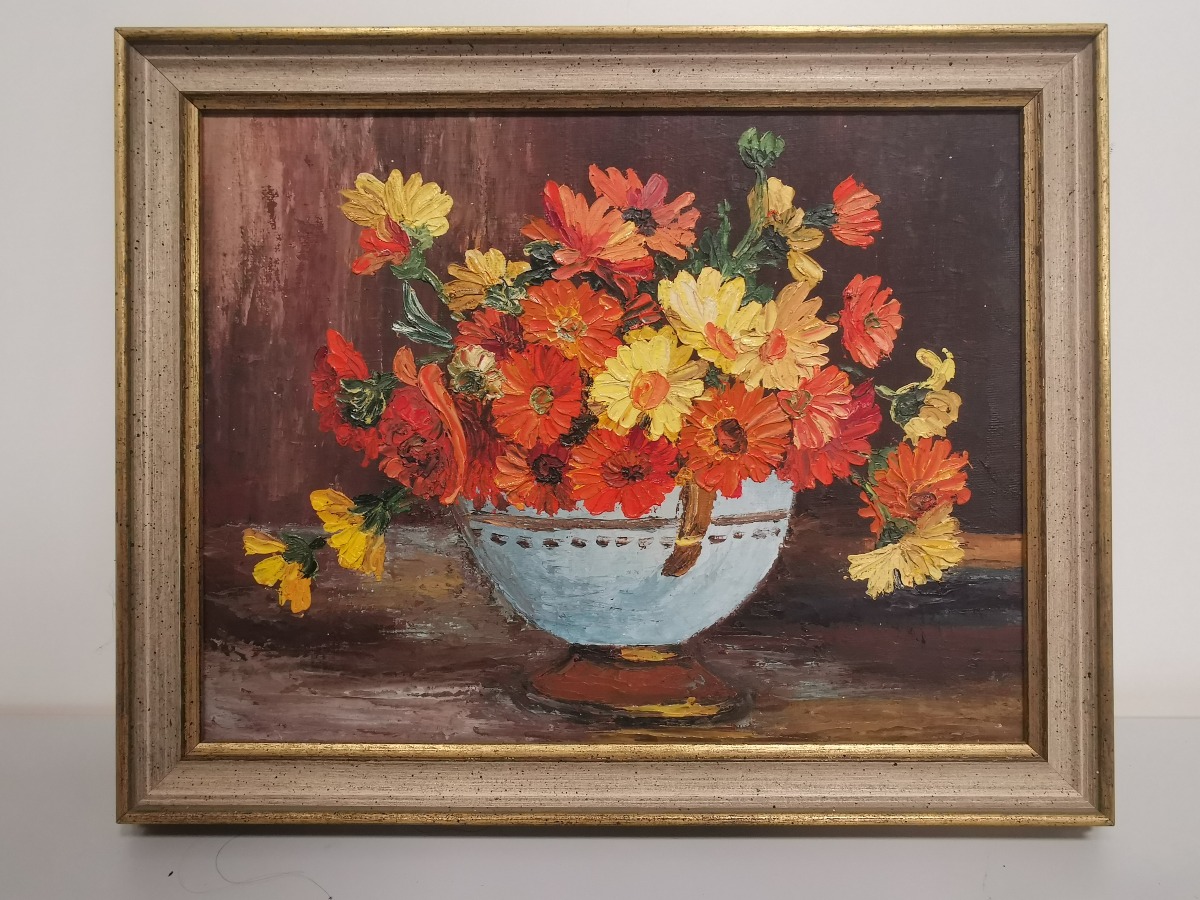 Maleri med motiv af buket. Olie på plade. Usigneret. Mål: 33 x 41 cm. Papir på bagside med flænge.