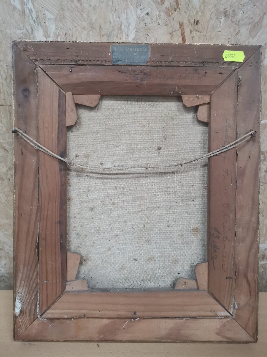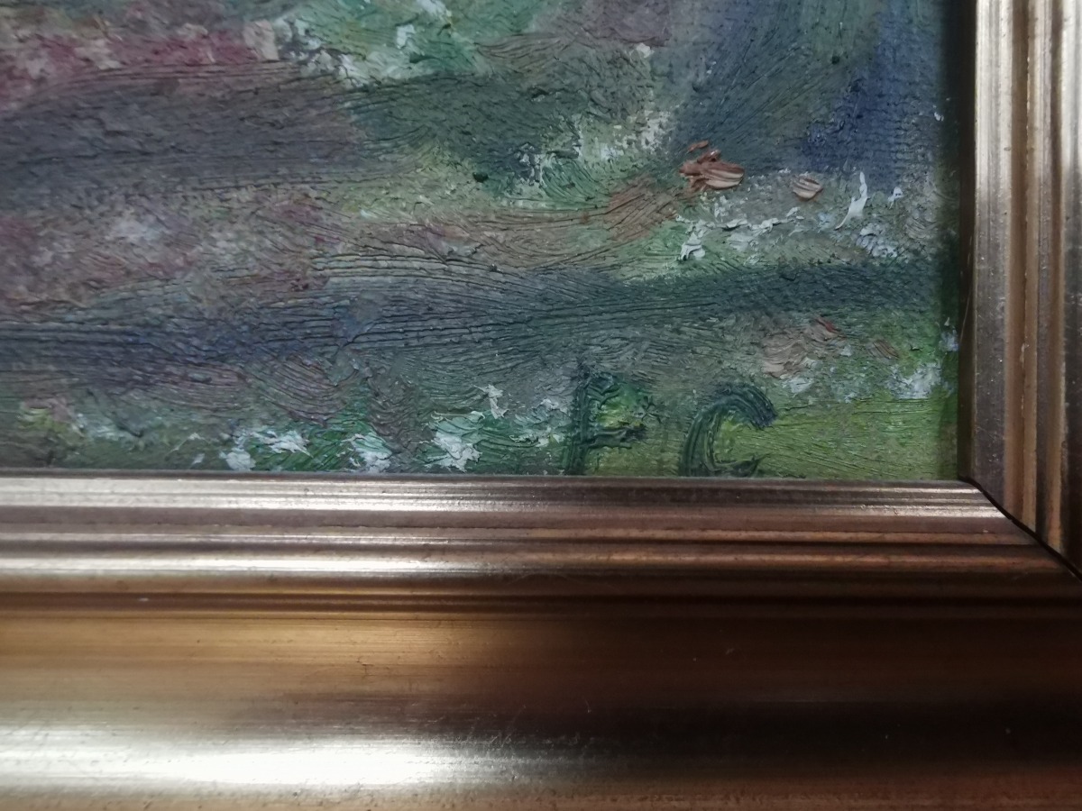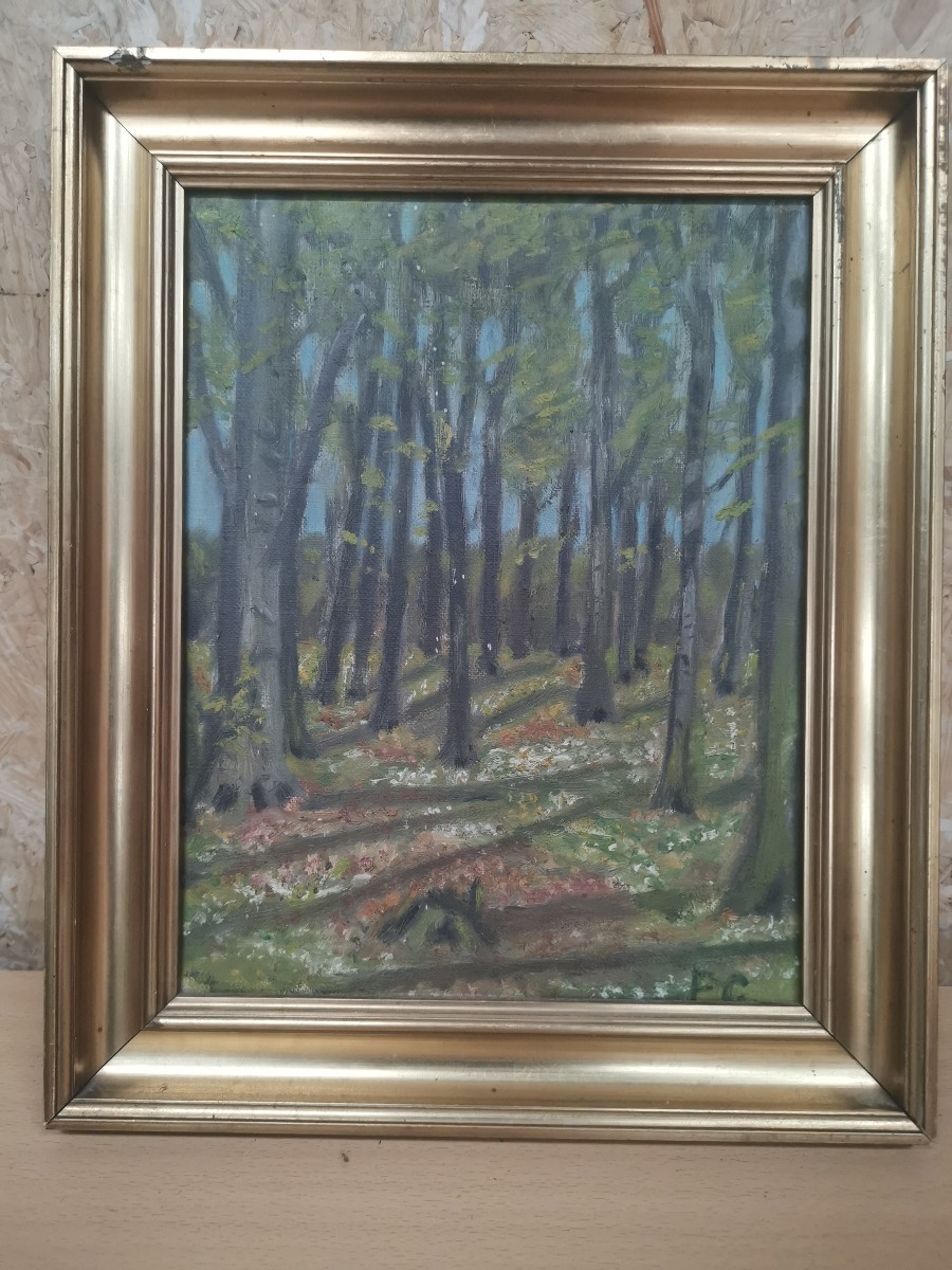 Maleri af skov. Olie på lærred. Sign. FC. Mål: 35 x 29 cm. Fremstår med skader på ramme.