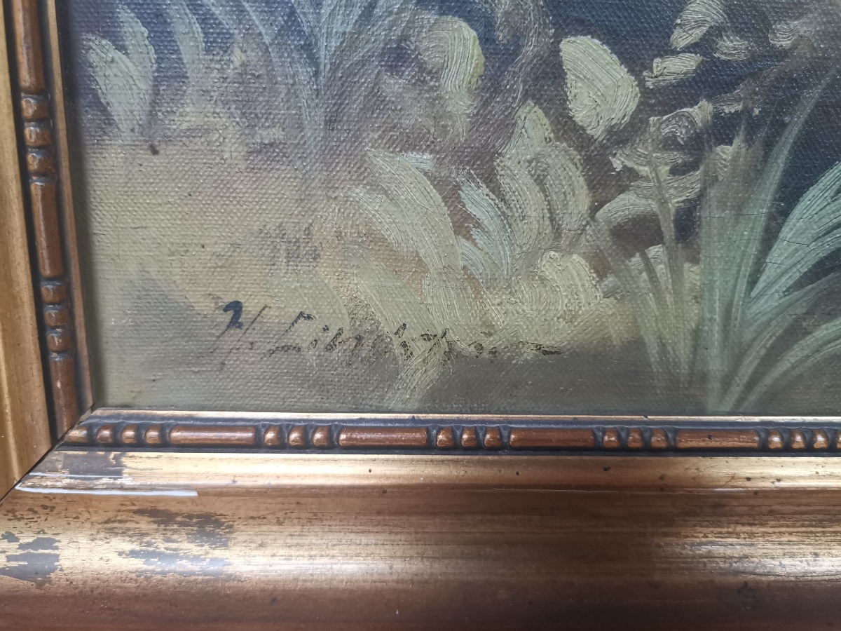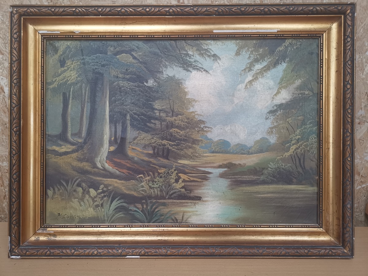 Maleri med skovsø. Olie på lærred. Signeret H. Lindskov. Mål: 56 x 75 cm. Fremstår med skader på ramme.