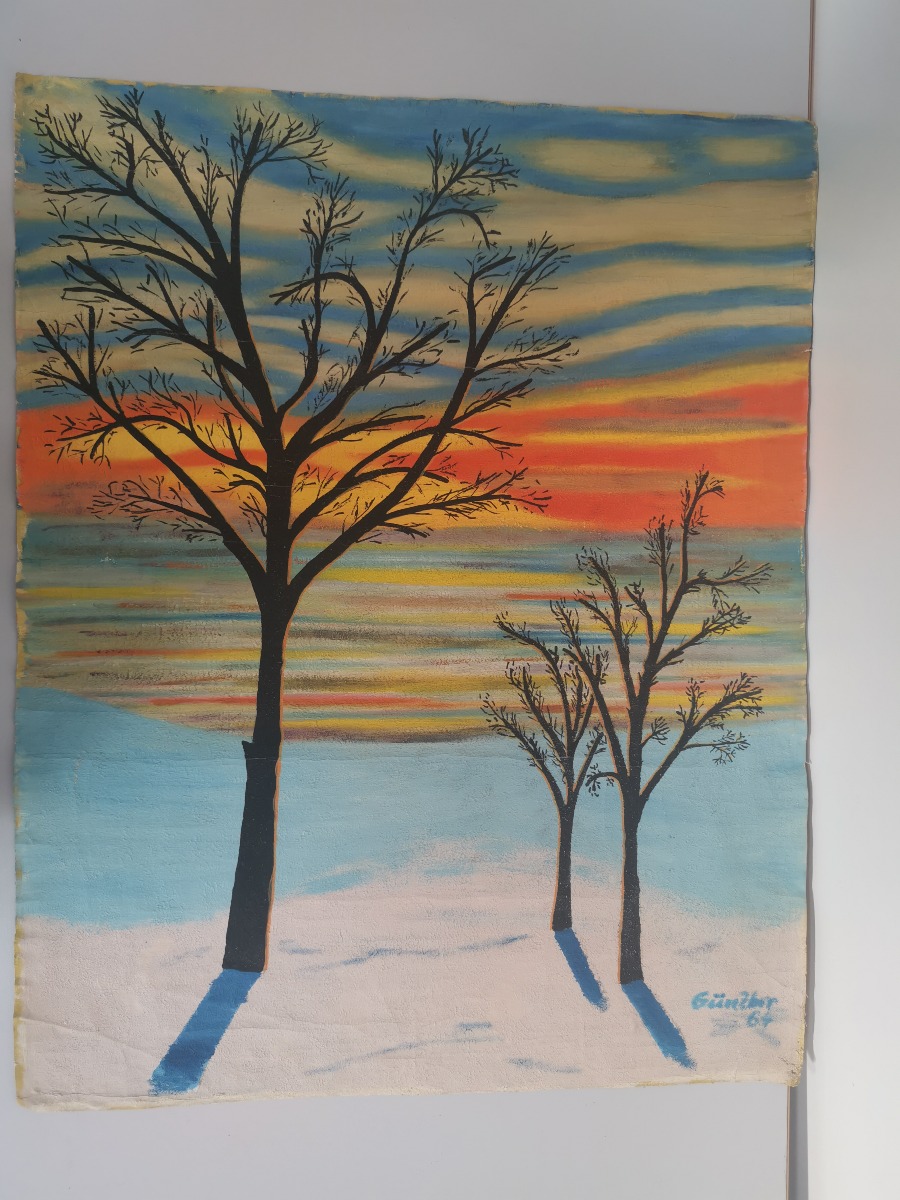 Maleri med vinterlandskab. Olie på lærred. Sign. Gunther 64. Mål: 66 x 52 cm. Uindrammet.