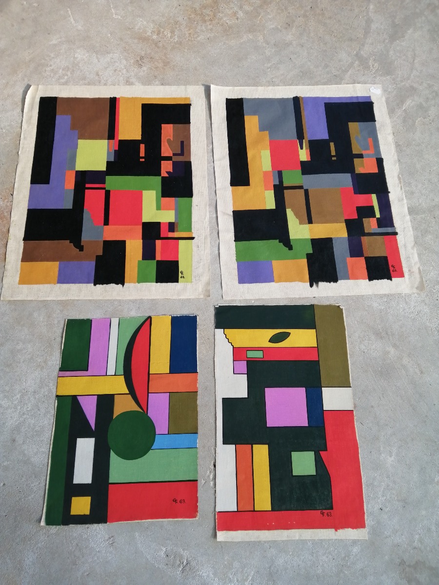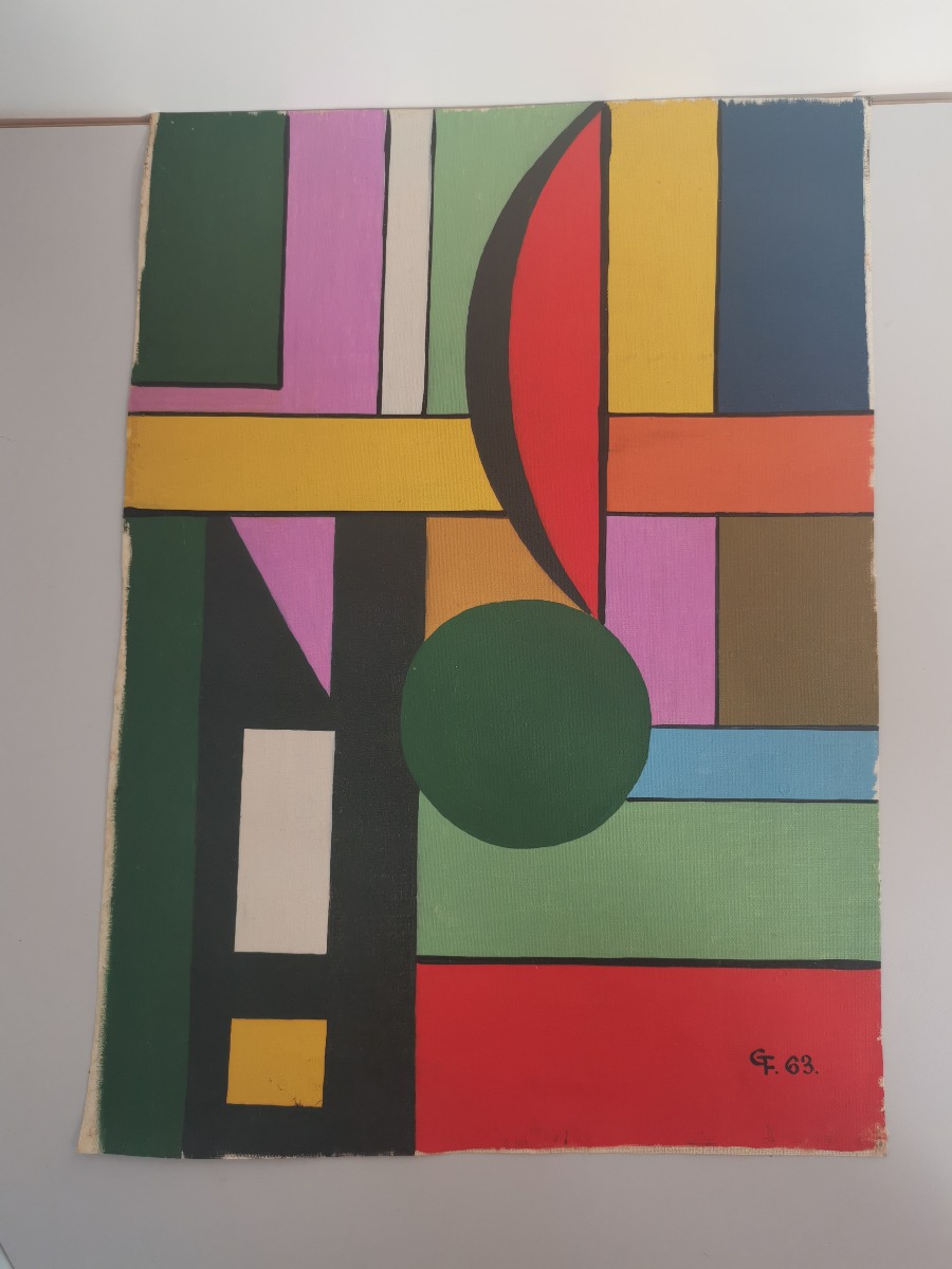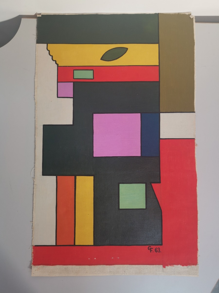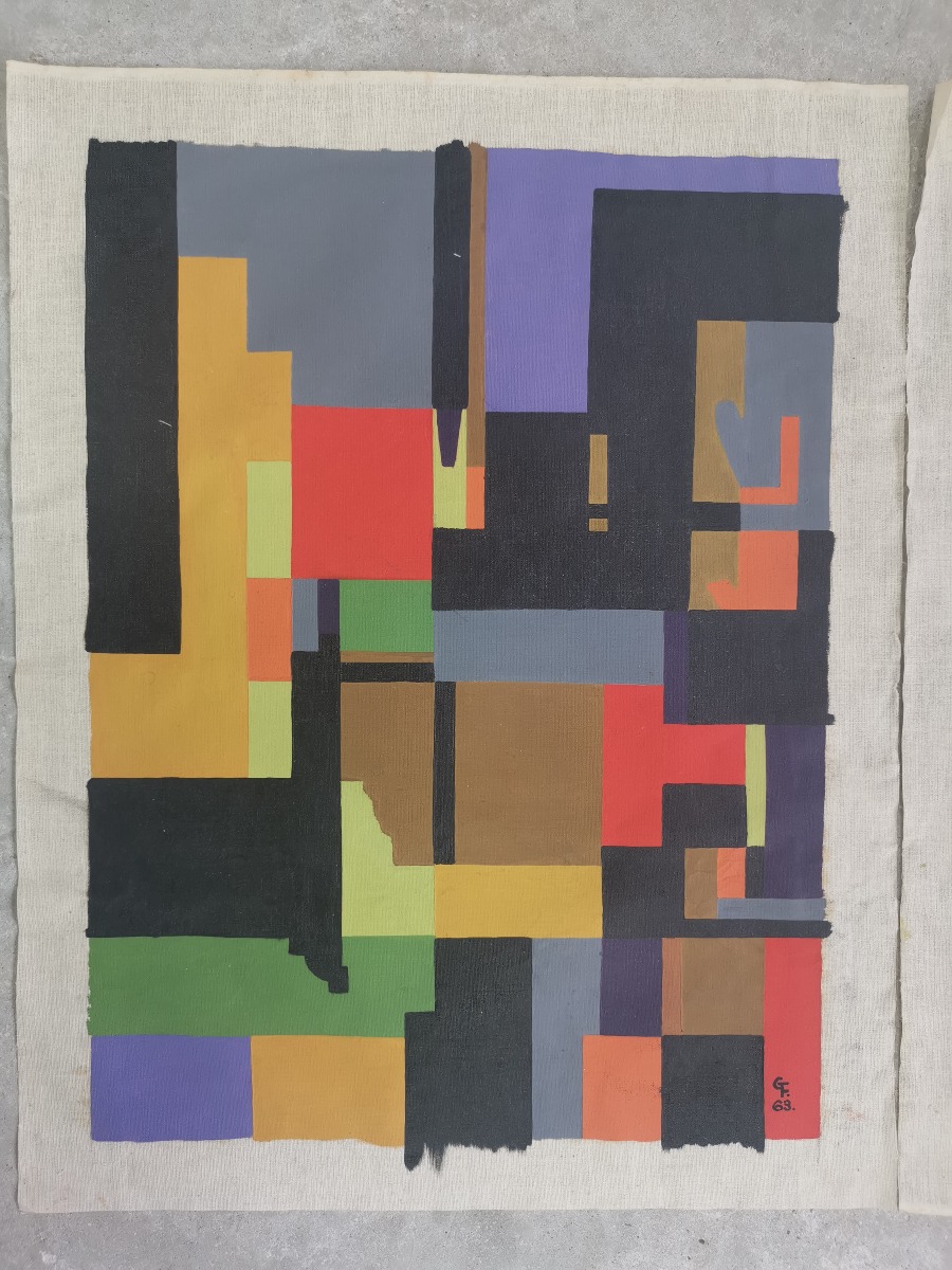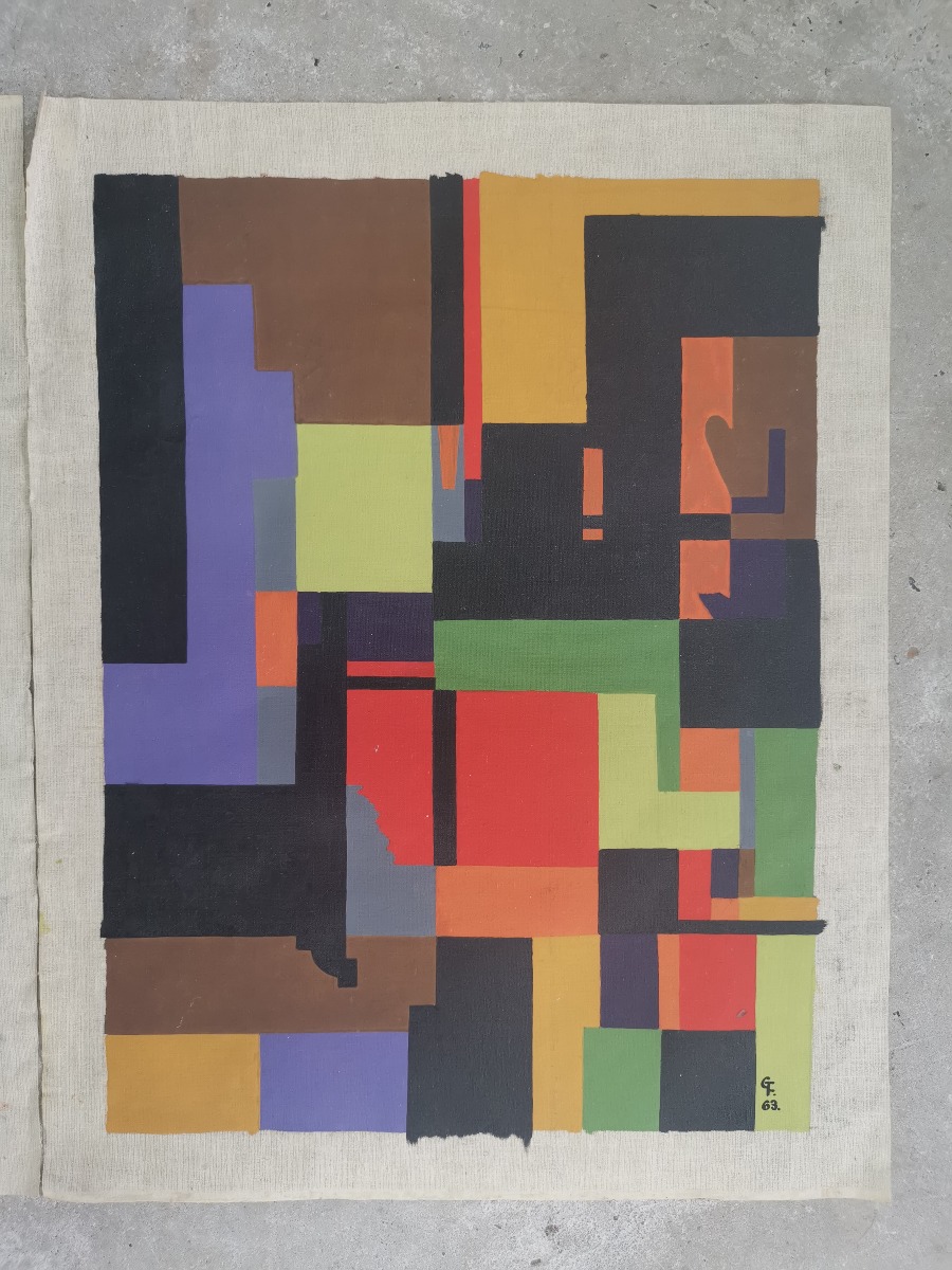 Malerier med figurkompositioner. Olie på lærred. Mål: 2 stk af 56 x 42 cm. 44 x 31 cm. og 49 x 31 cm. Alle signerede GF 63. Uindrammede.