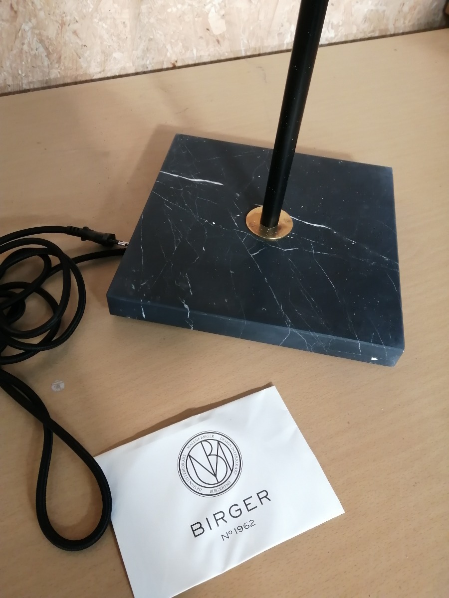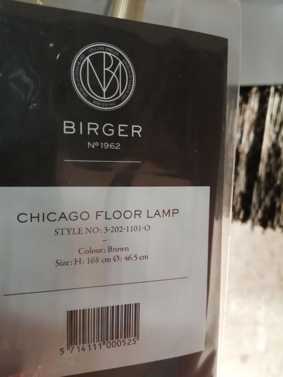 Birger No 1962 standerlampe. Model: Chicago Floor Lamp. Style no: 3-202-0500-O. H: 168 cm. Ø: 46,5 cm. Brun skærm. Sort stang og marmorfod. Ubrugt, men der er nogle enkelte tråde fra skærm som skal klippes til.