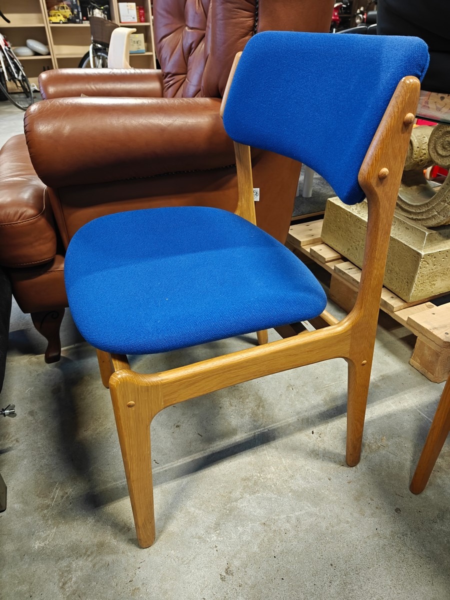 Erik Buch. sæt på 3 armstole og 1 spisestuestol. Alle af eg. 2 armstole samt spisestuestol med blå uld. 1 armstol med karrygul uld. Slid og andre brugsspor forekommer. Enkelte træpropper mangler.