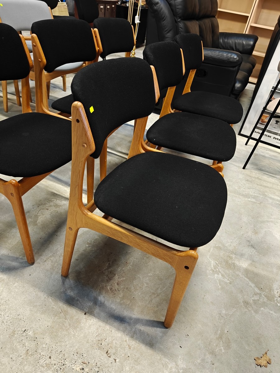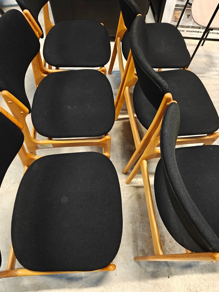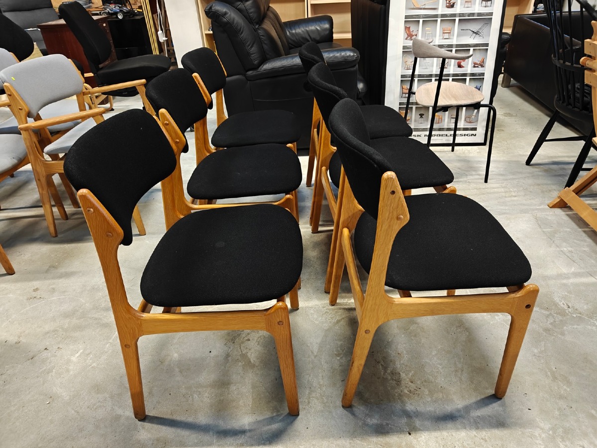 Erik Buch, sæt på 6 spisestuestole af eg. Sæde og ryg med sort uld. Fremstår med slid på betræk og enkelte propper på rygstykker kan mangle.