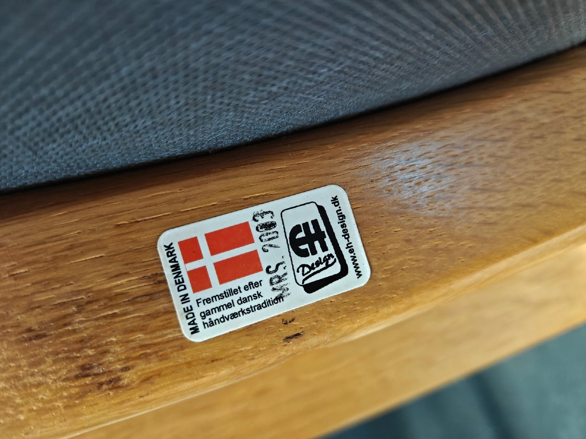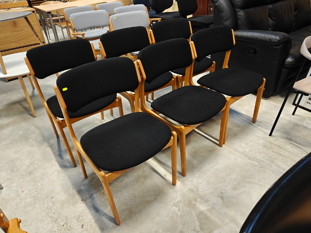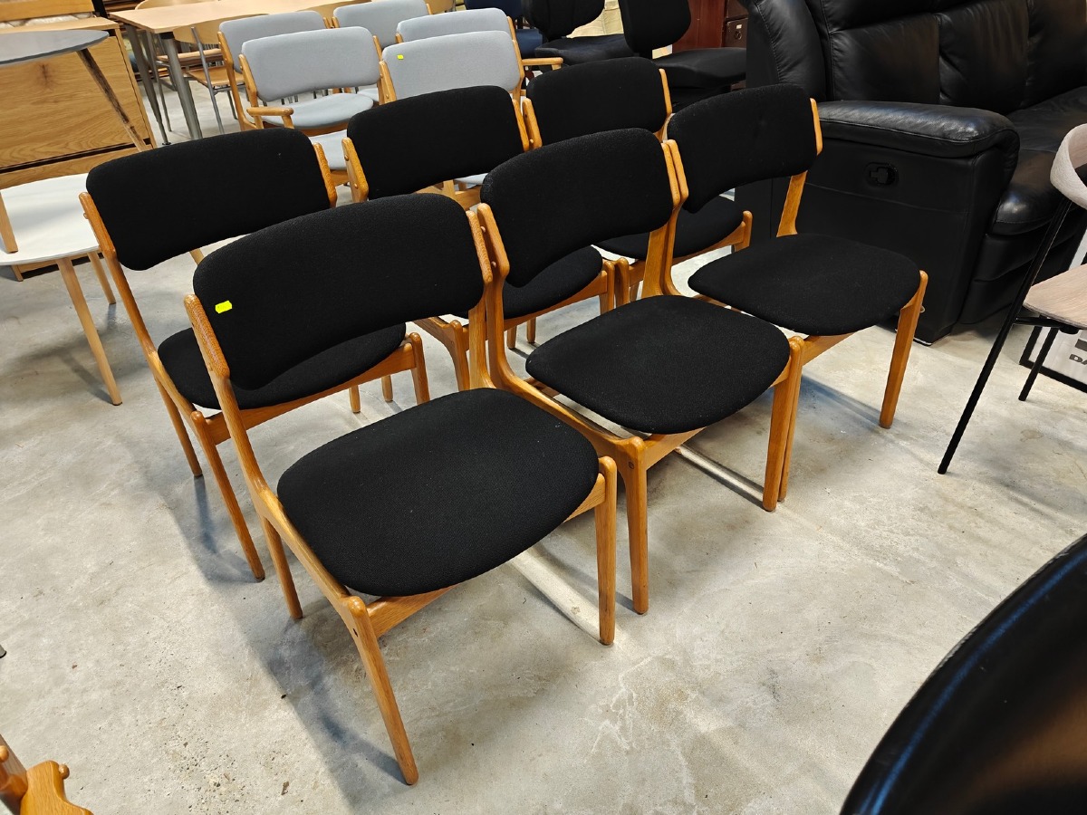 Erik Buch, sæt på 6 spisestuestole af eg. Sæde og ryg med sort uld. Fremstår med slid på betræk og enkelte propper på rygstykker kan mangle.