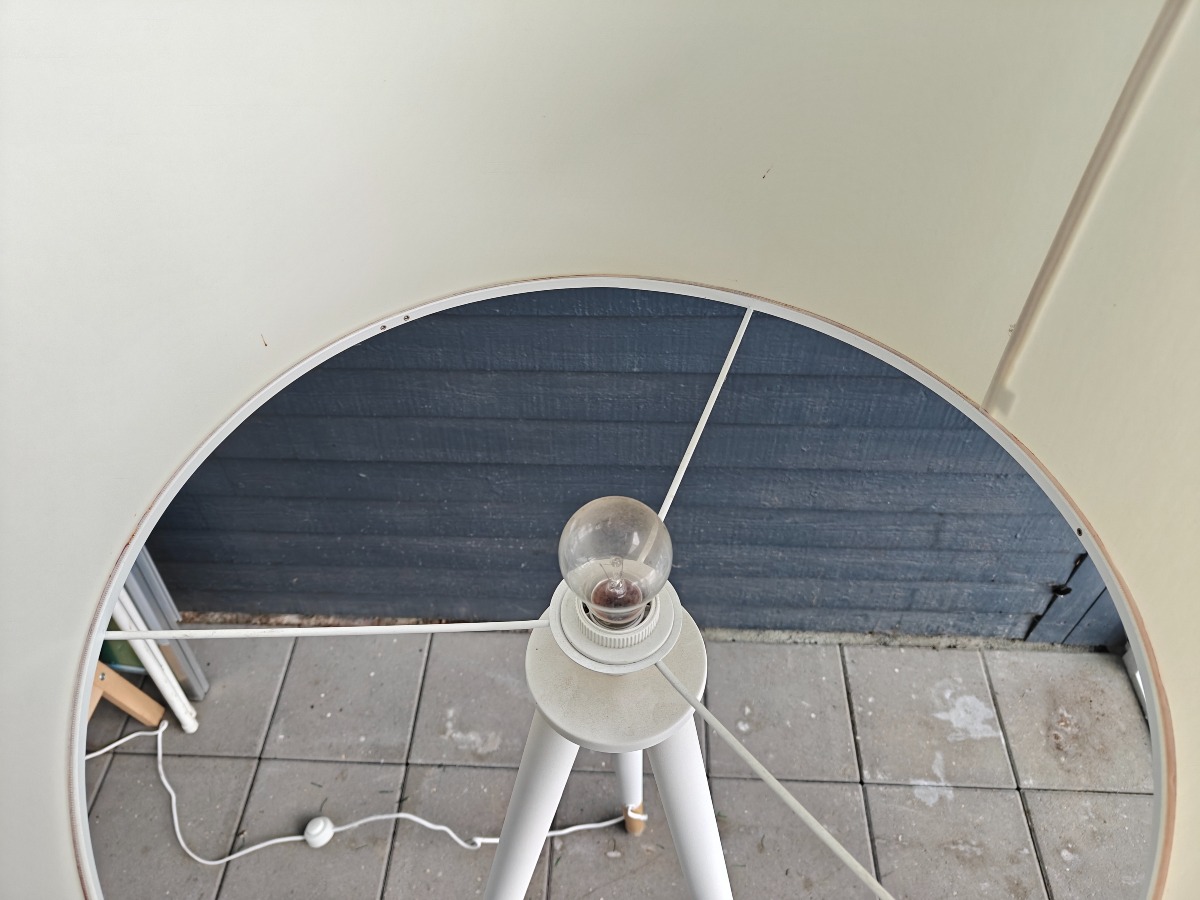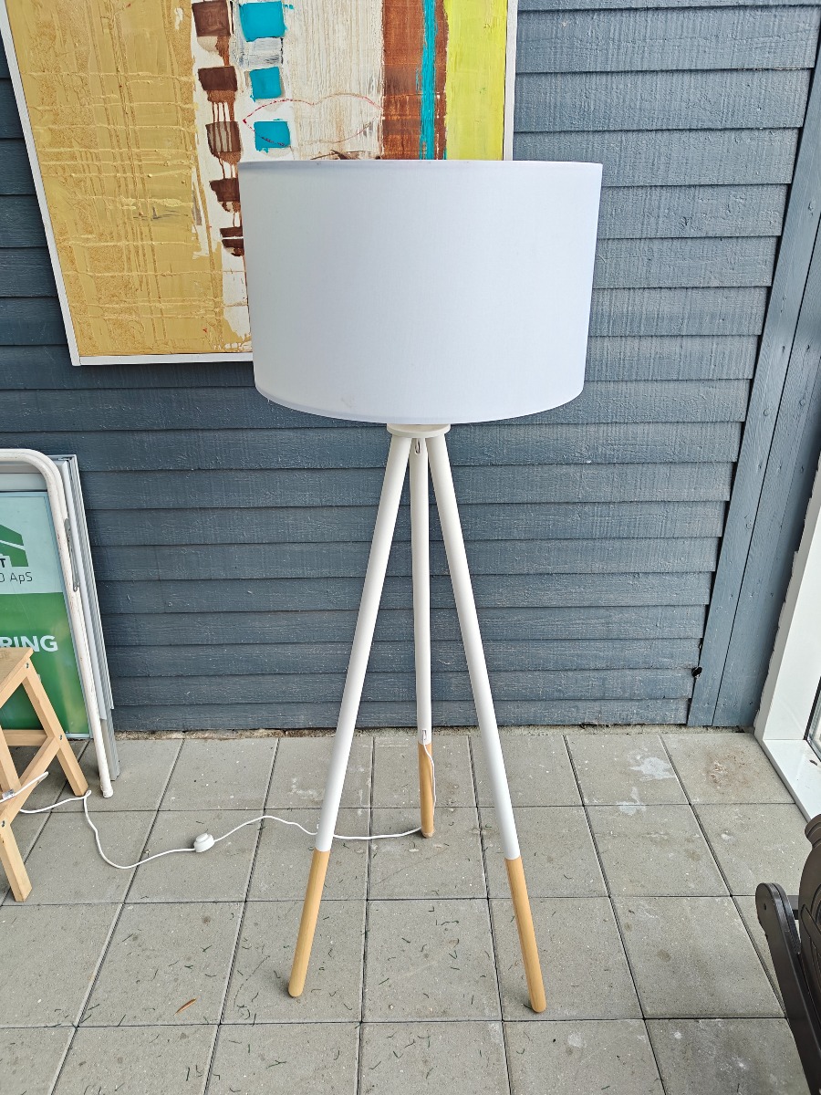 Pip gulvlampe. Hvidelakeret stel af træ med umalede fødder. Hvid skærm. H. 155 cm. Mindre brugsspor.