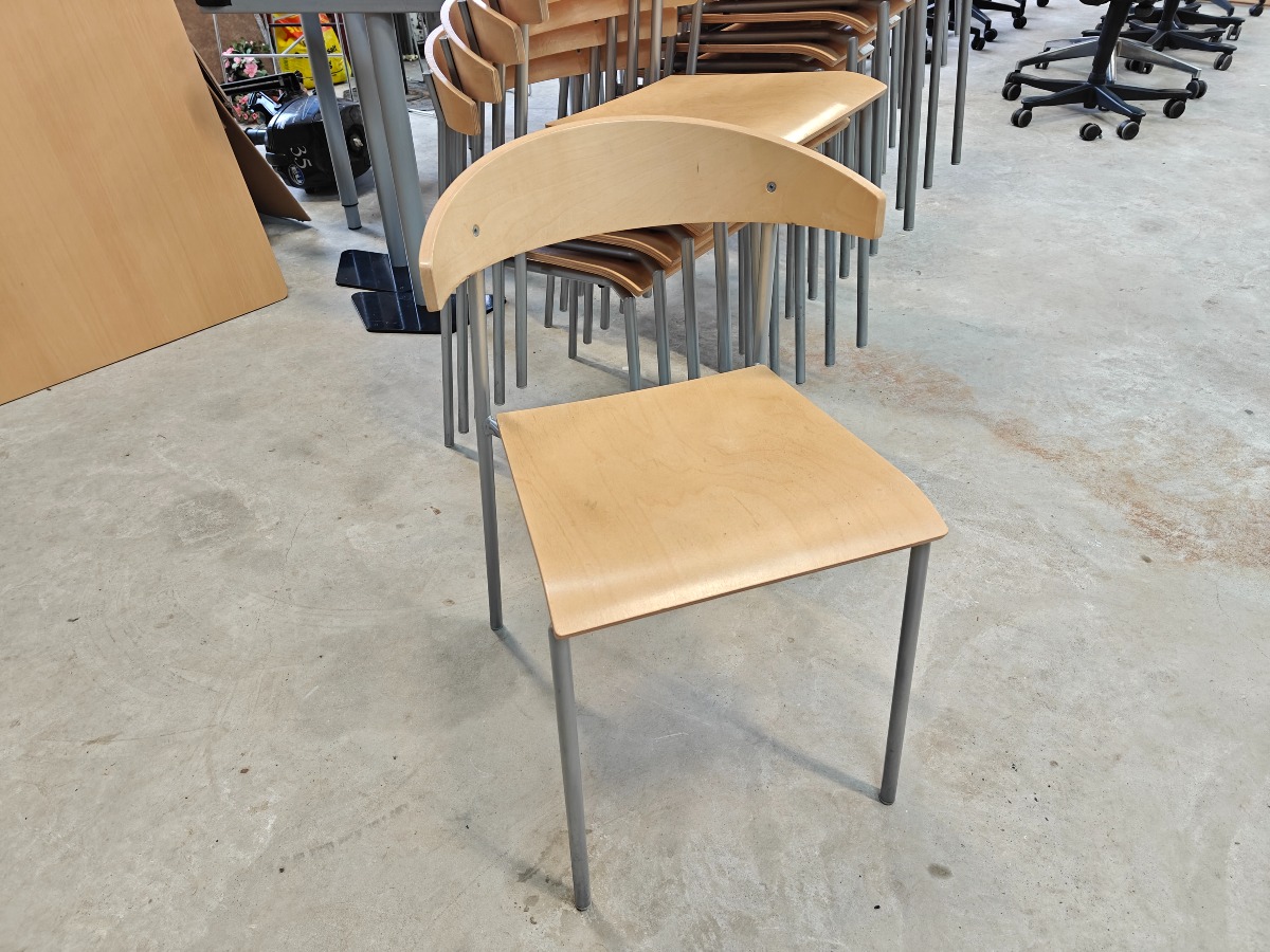 Kinnarps Riff stabelstole, 6 stk. Gråt metalstel med sæde og ryg af formspændt bøgefiner. Brugsrelateret slidtage.