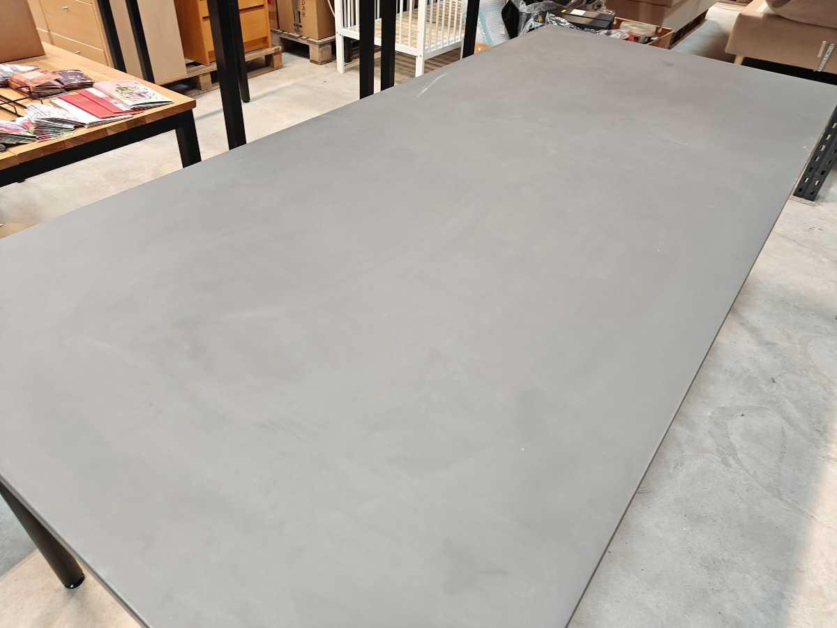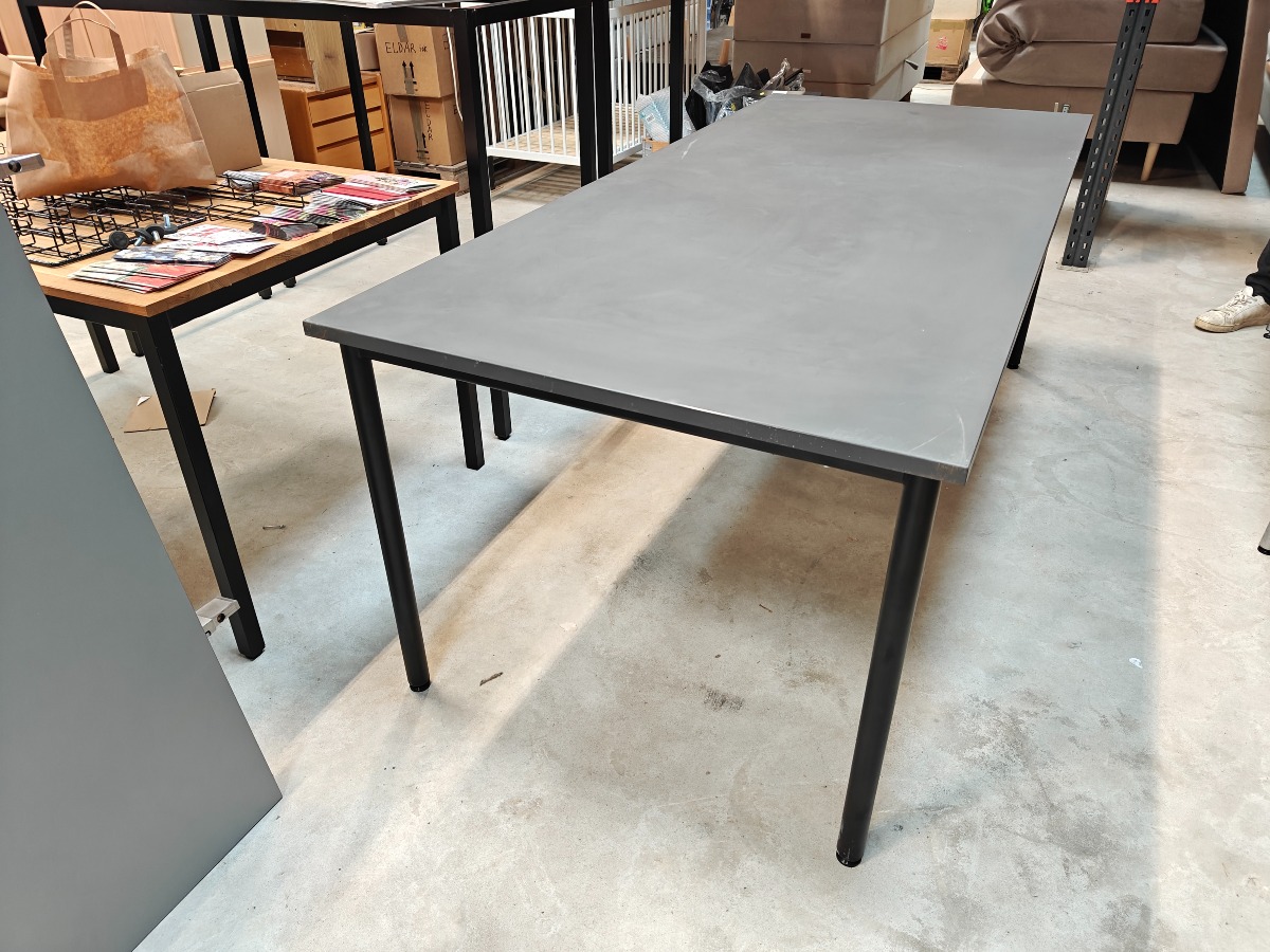 Rektangulært bord. Grålakeret metalstel med mat grå laminatplade. H. 73, B. 200, D. 90 cm.