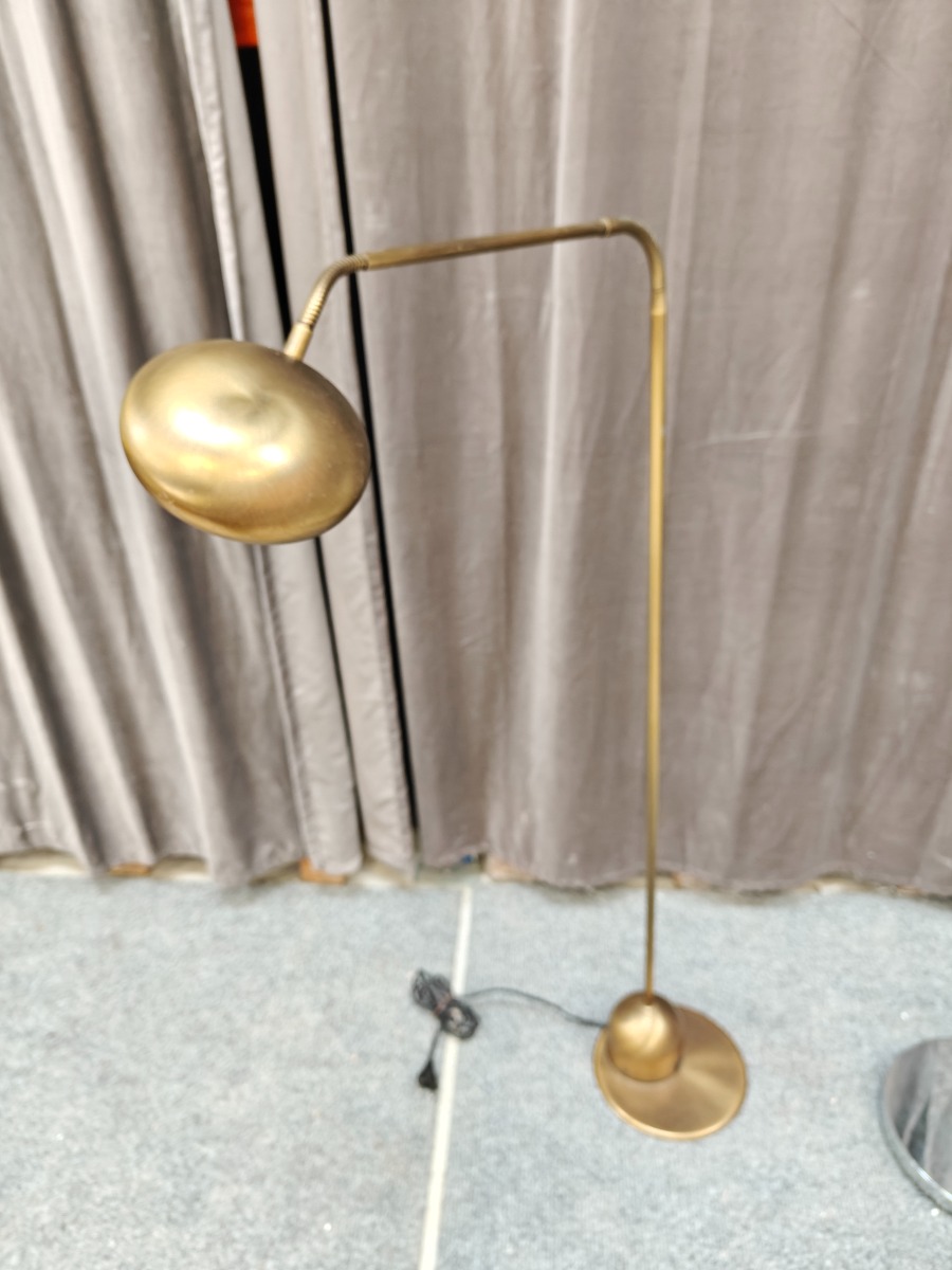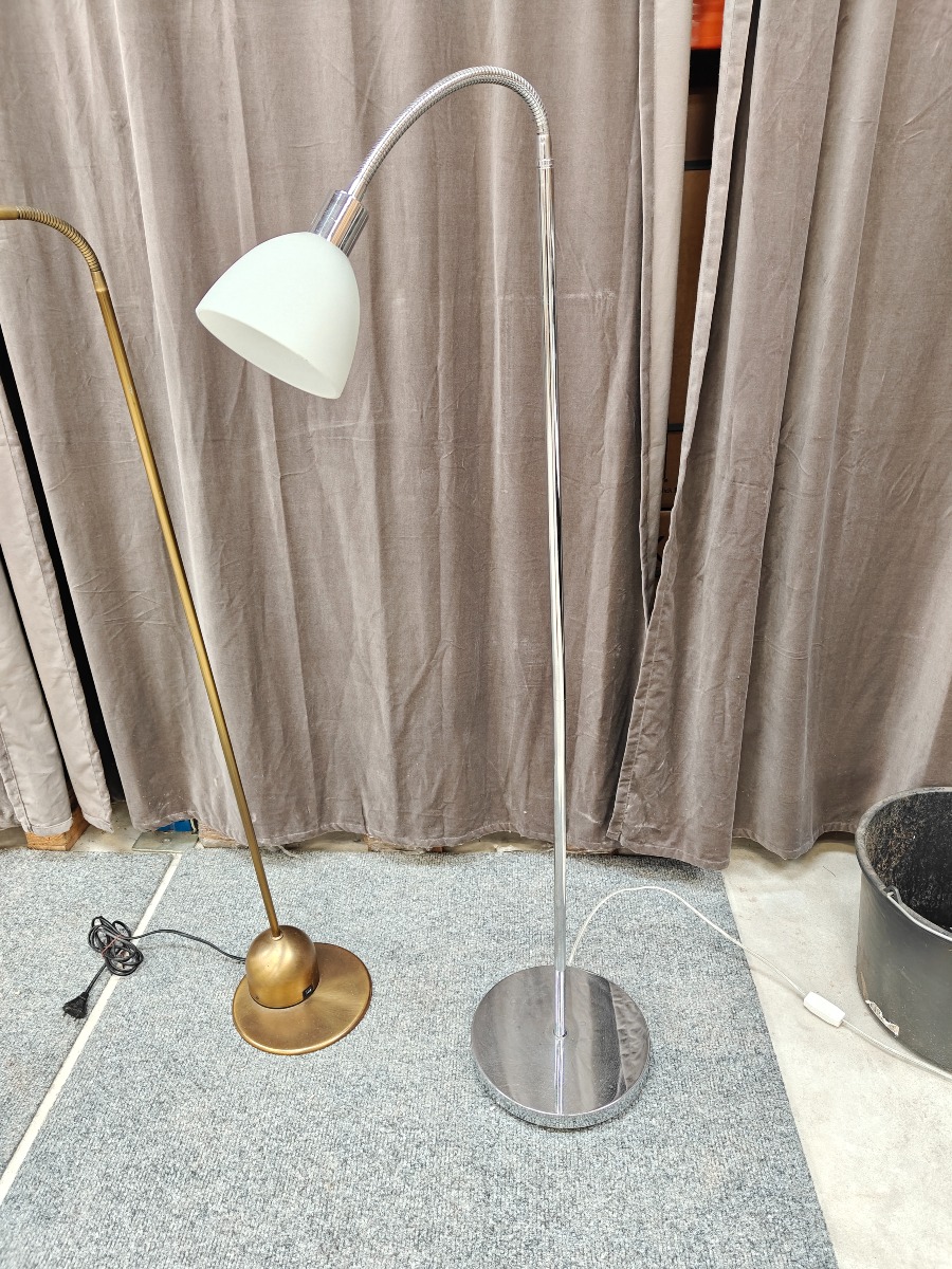 2 standerlamper. Ene med børstet messing-overflade, den anden med forkromet overflade. Begge halogen.