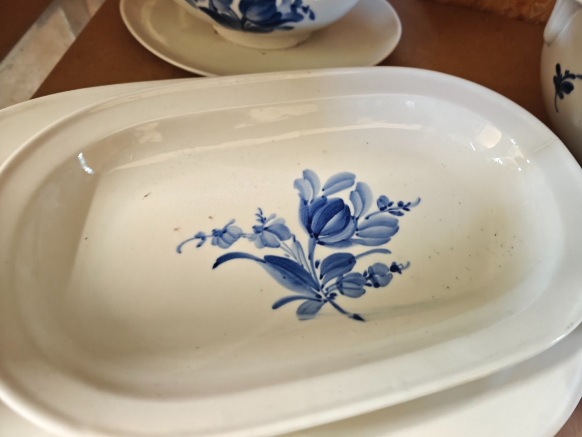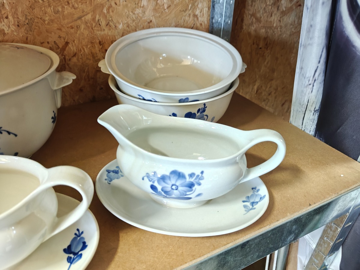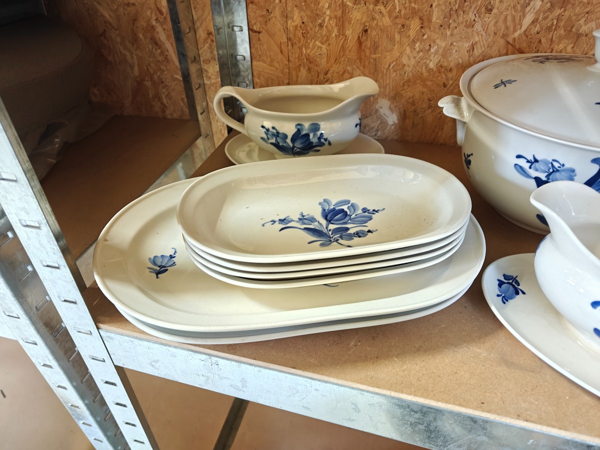 Blåmalet stel med blomster. Lille terrin, 2 skåle, 3 sovsebåde og 6 fade.
