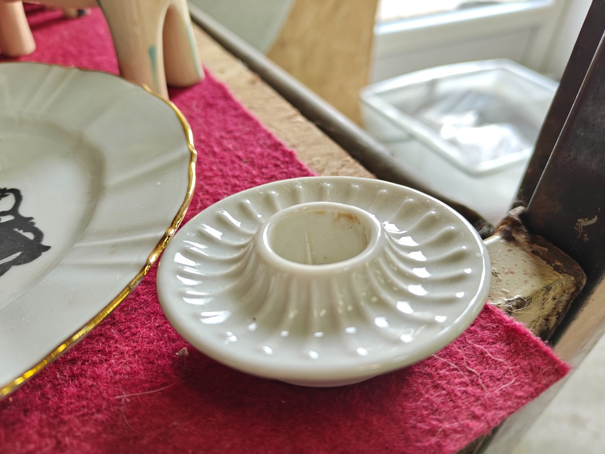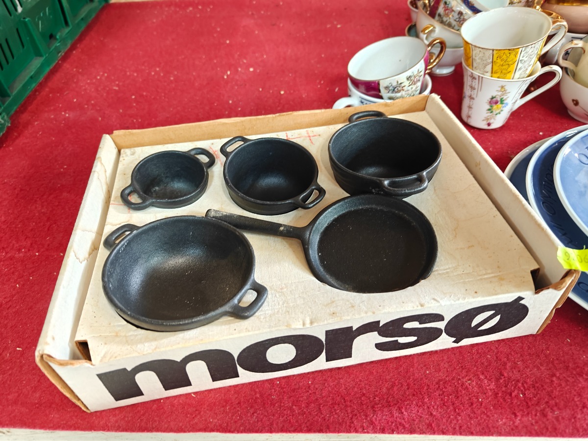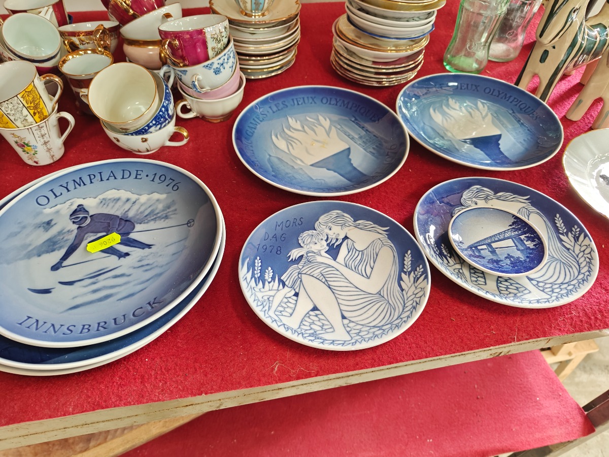 Diverse pyntegenstande. Royal Cph. platter, Aluminia, Morsø minigryder, større samling mokkakopper og forskelligt andet.