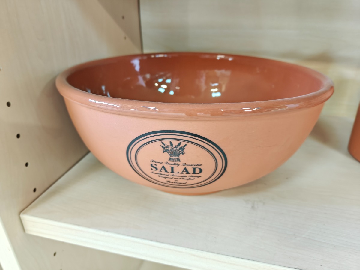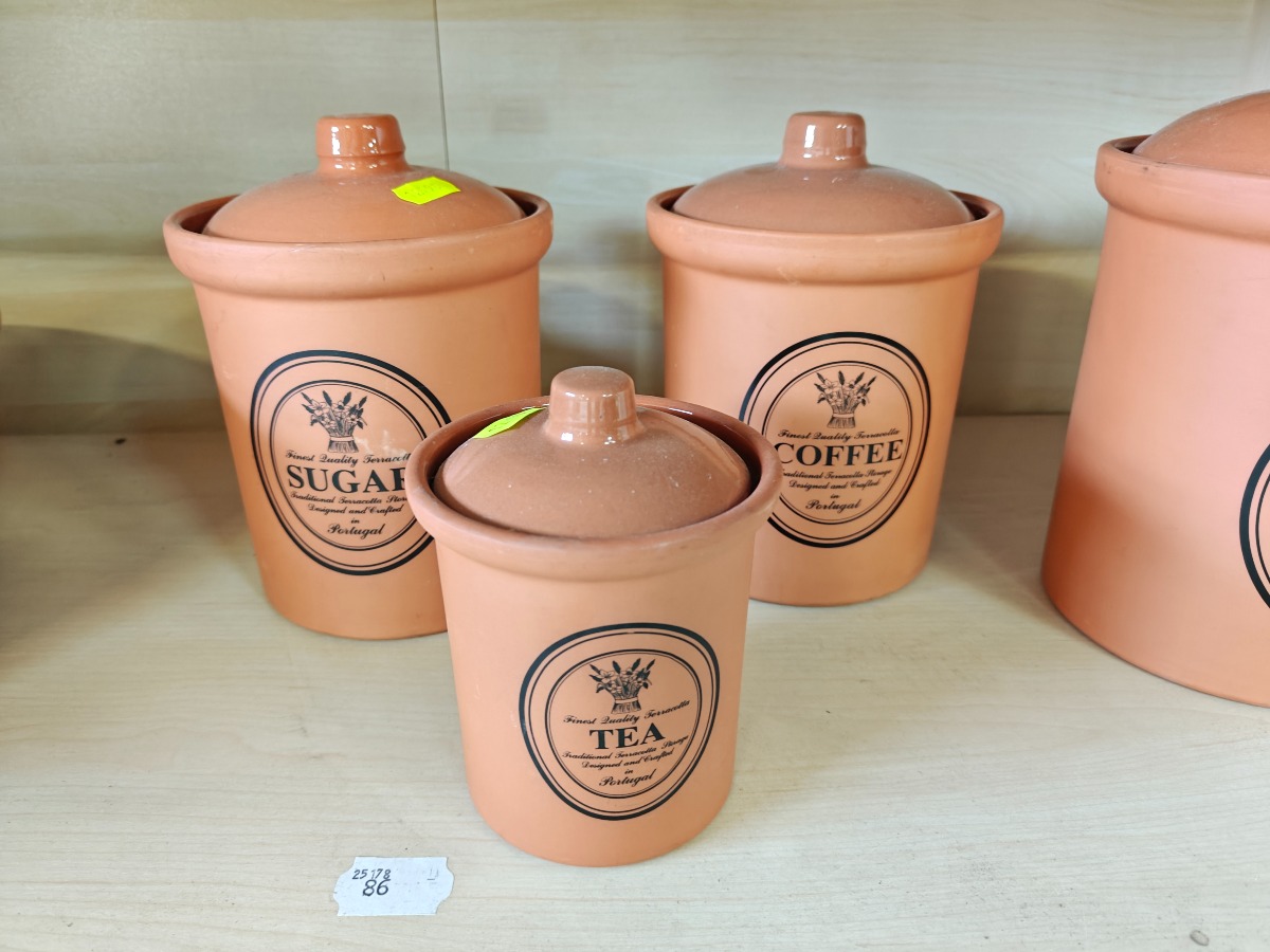 Forrådskrukker af terracotta. 4 krukker til opbevaring og en stor skål.