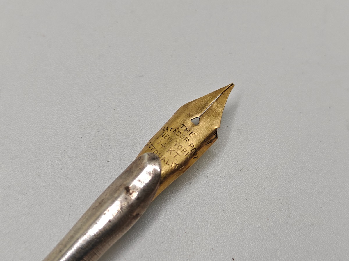 Penneskaft, ant. sølv med drevne dekorationer. Spids 14 kt.