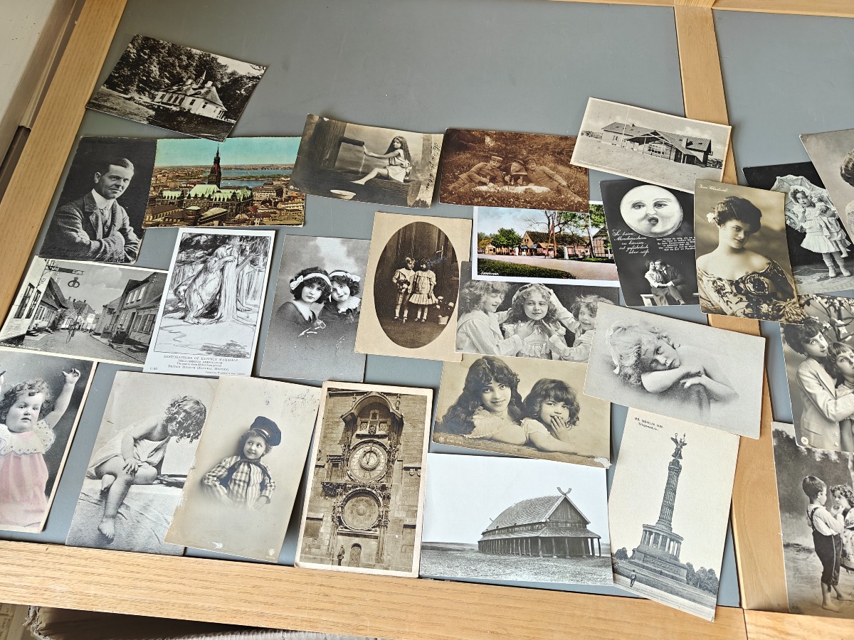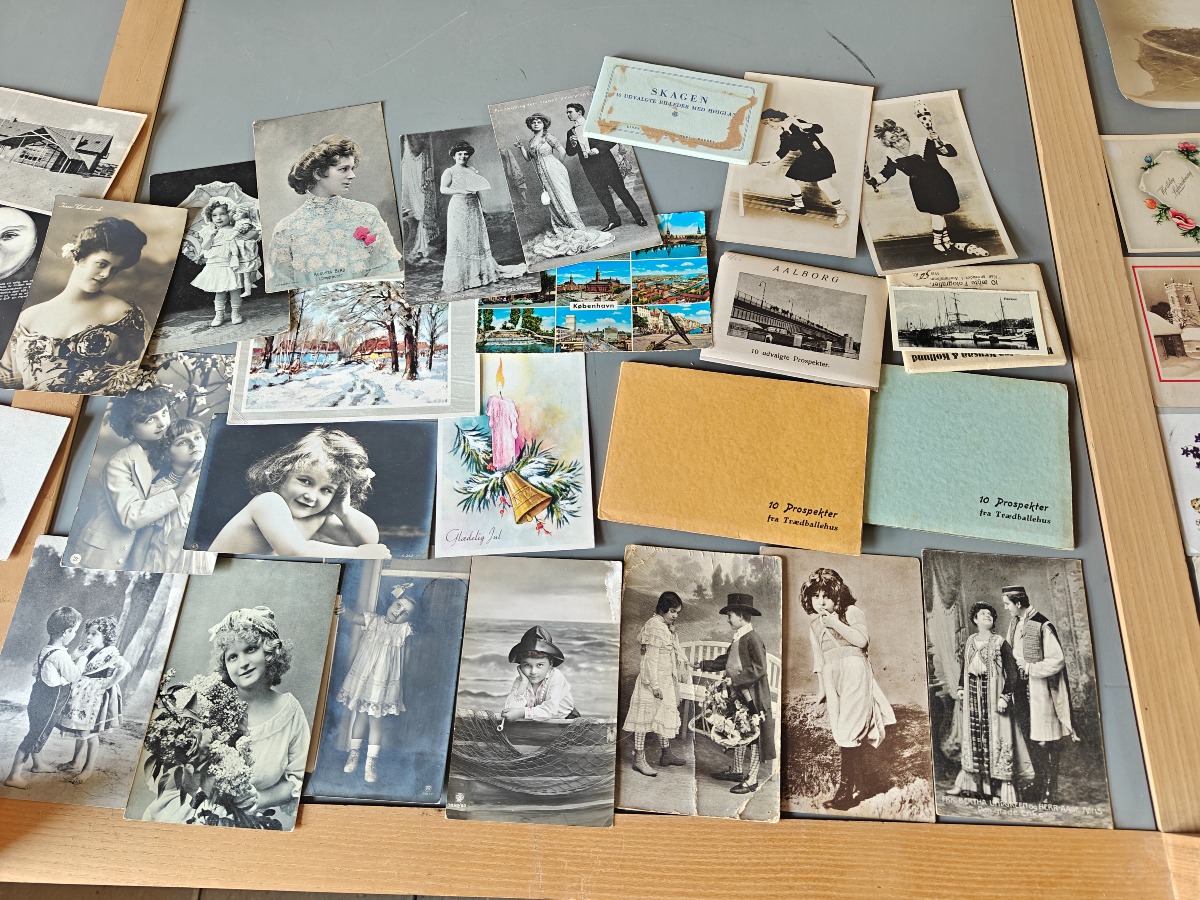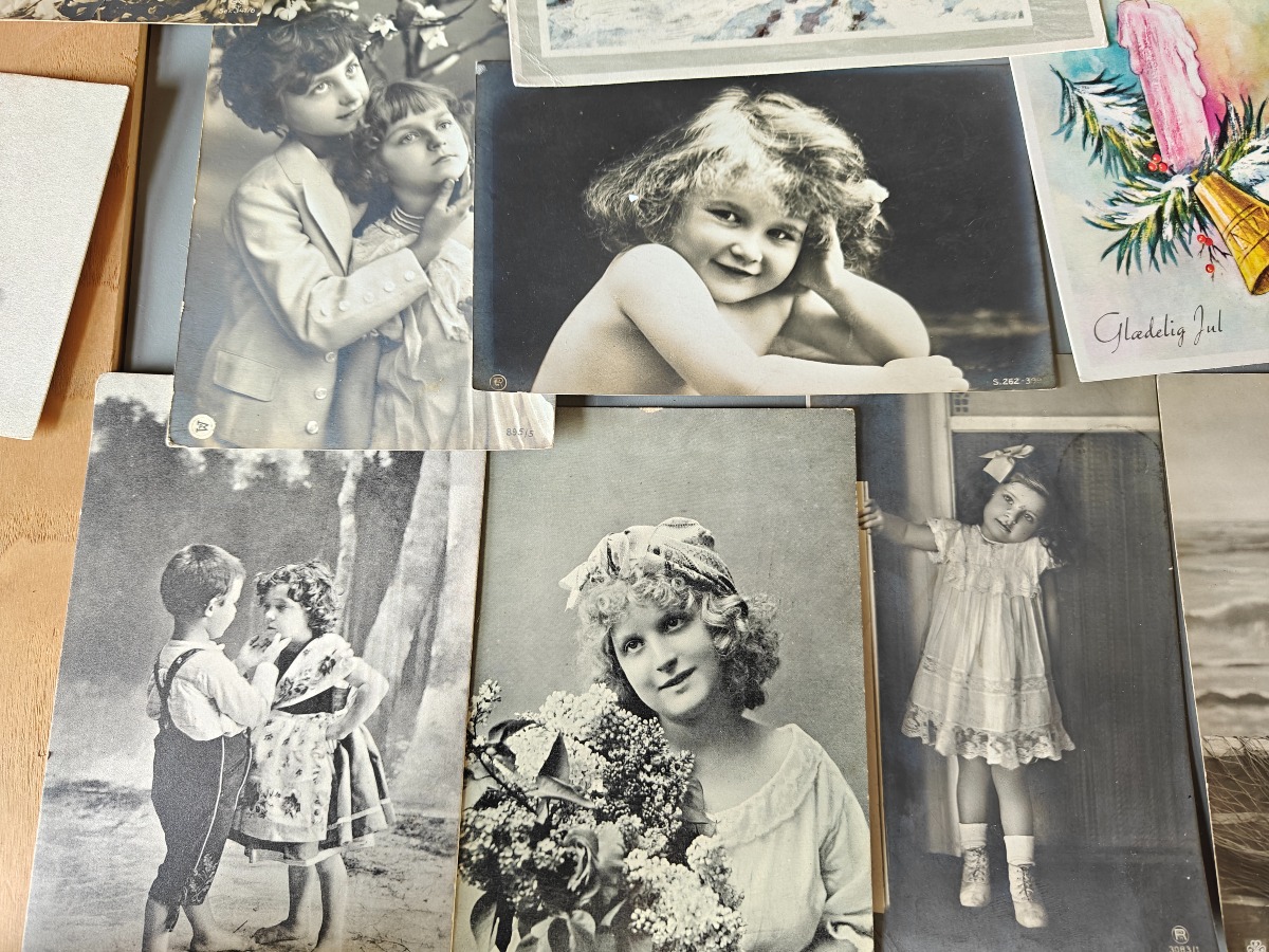 Ældre og nyere. Fotos af de ældre i det gamle lille format. Danmark, Tyskland og England. Mange har været sendt. Nogen tidligere opklæbet i album. Nyere kort ikke på foto