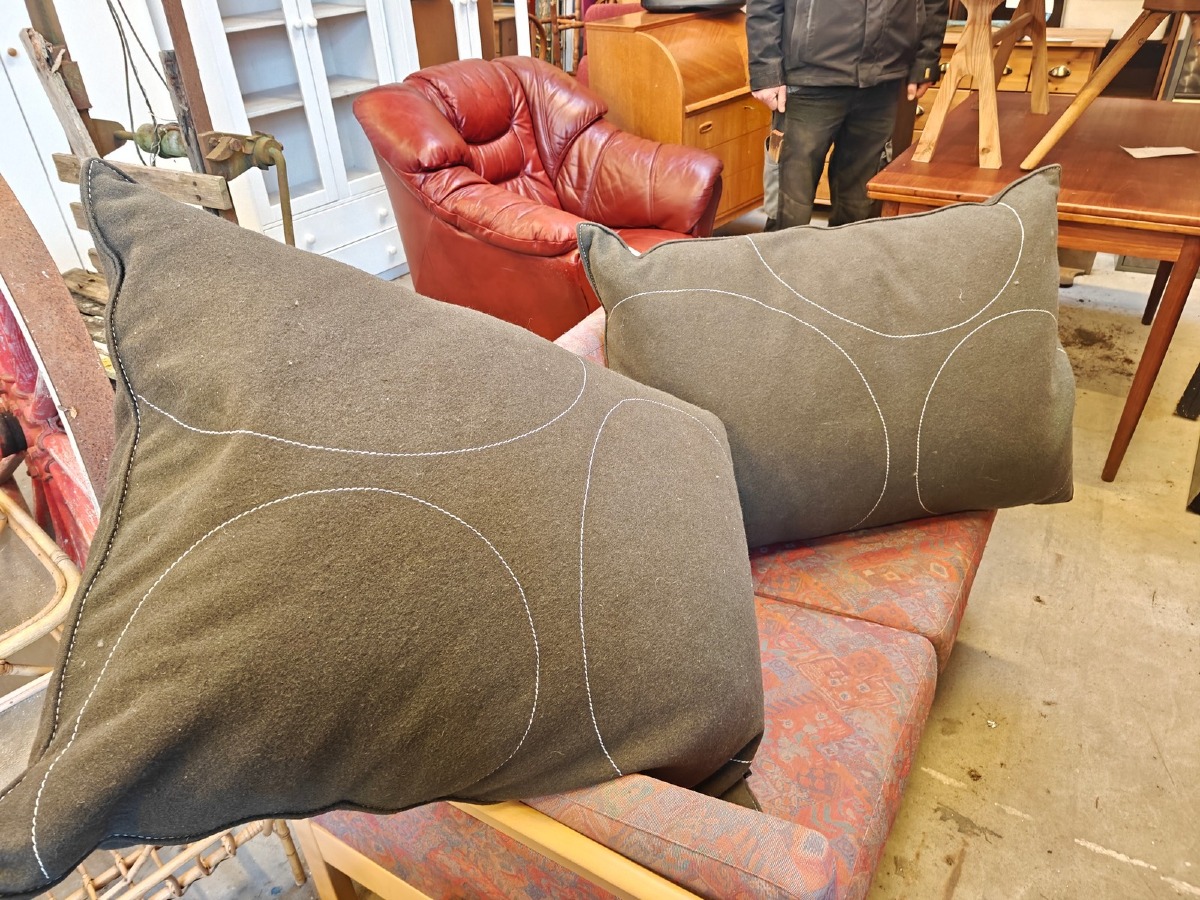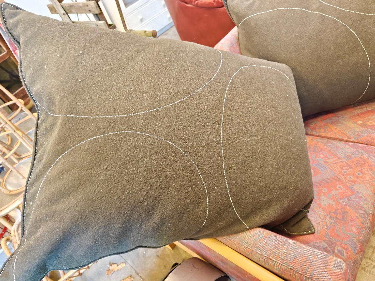 2 store HAY puder af gråligt stof. Trænger til let rengøring.  85 x 55 cm.