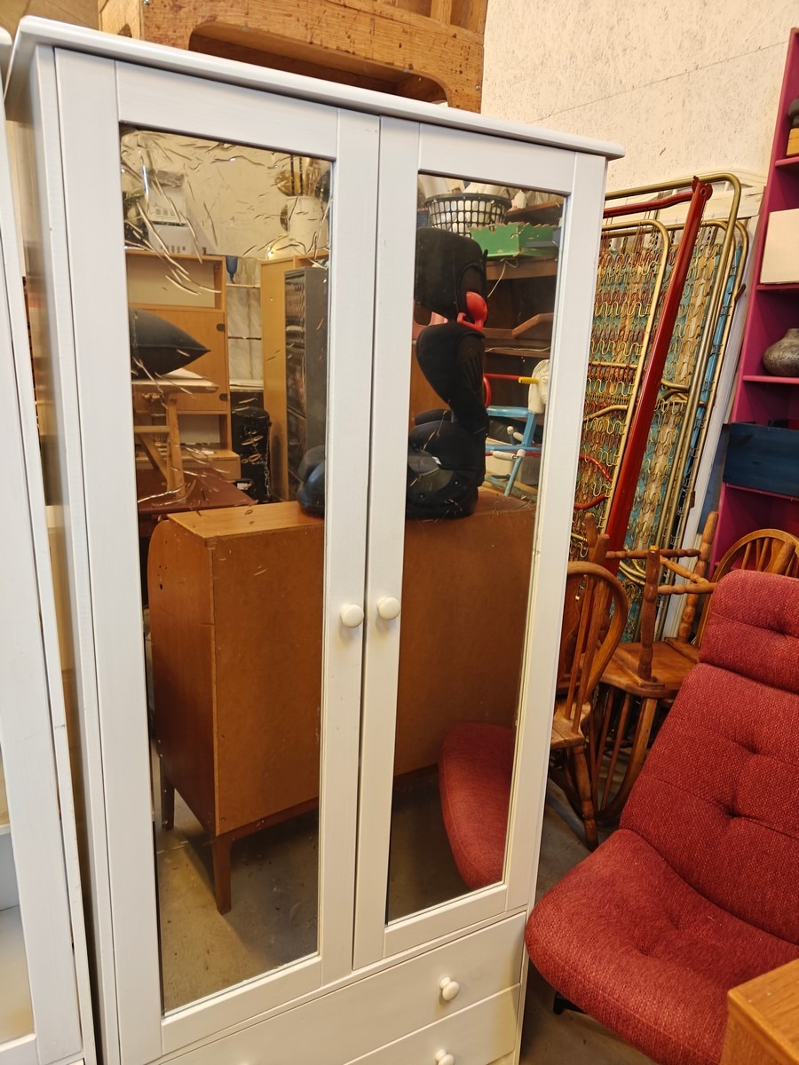 2 vitrineskabe af hvid laminat. Ene med spejlfolie på glaslåger. 170 x 78 x 37 cm. pr. skab.