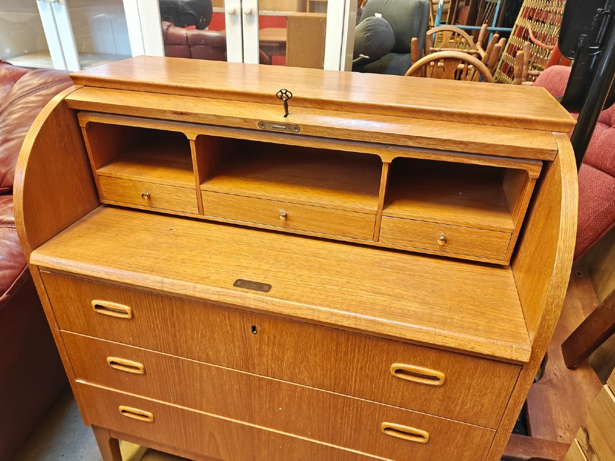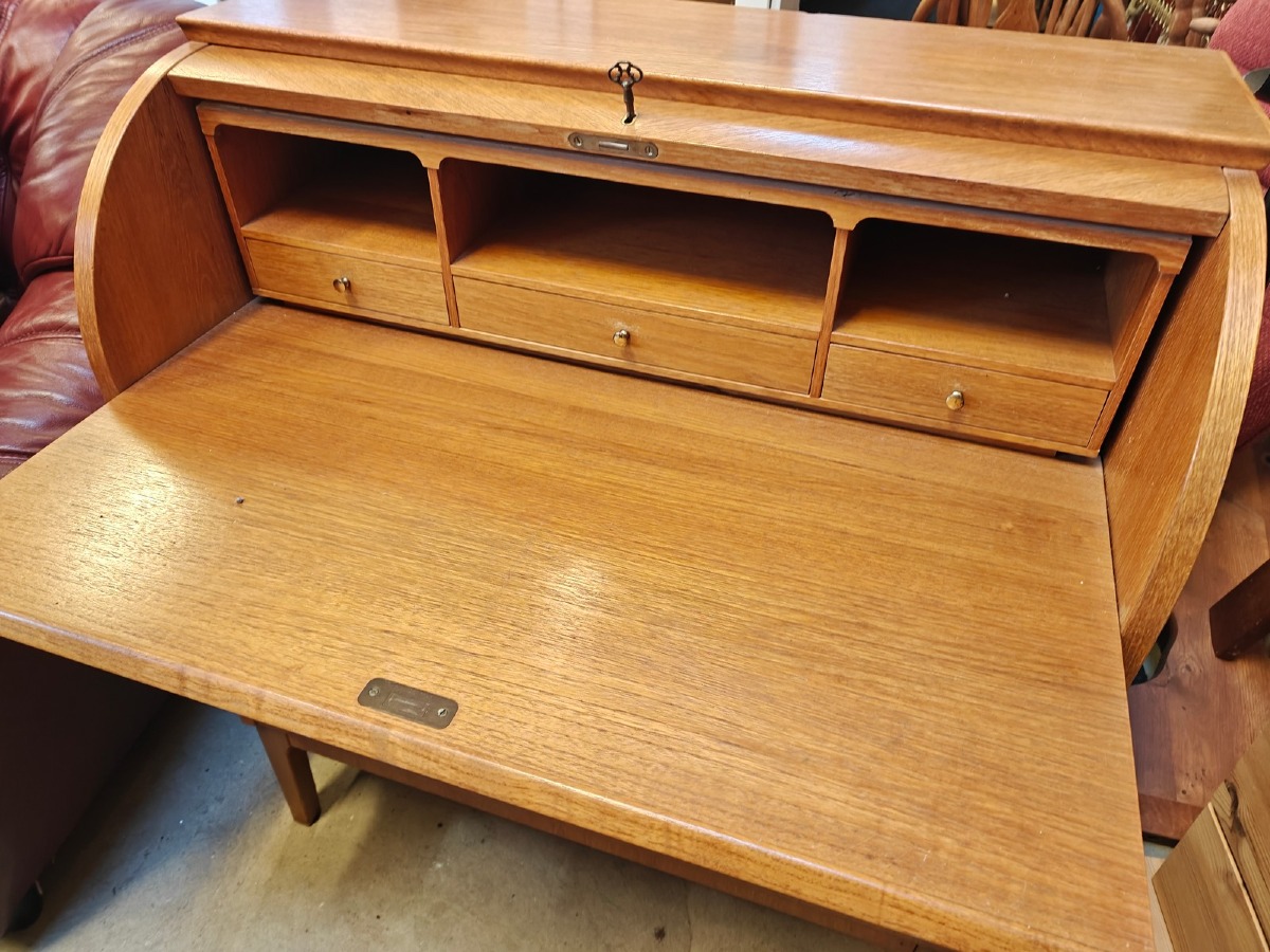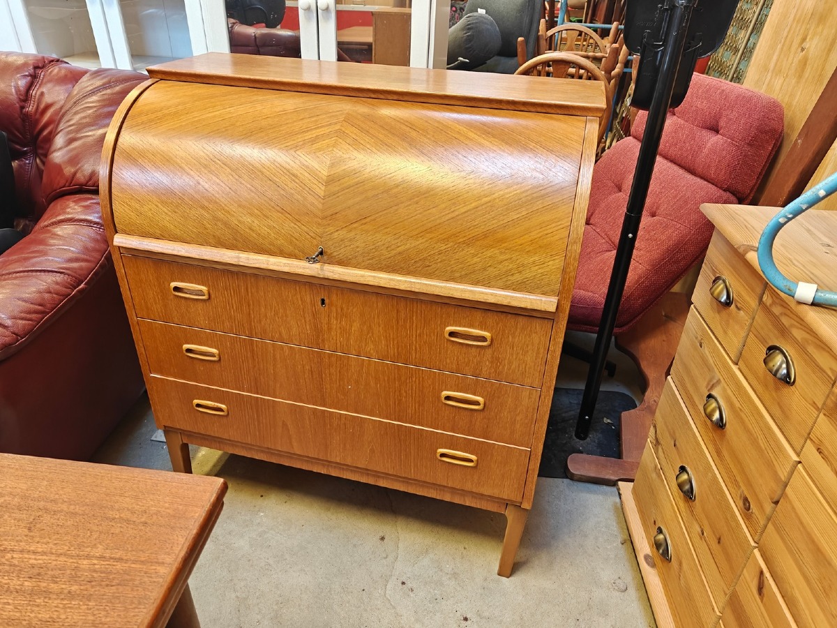 Chatol af teak med cylinderklap, fineret. 3 skuffer i front. 100 x 85 x 45 cm. Finerskader kan forekomme.
