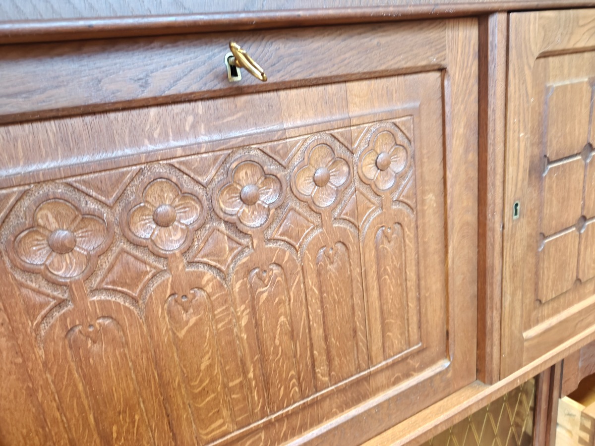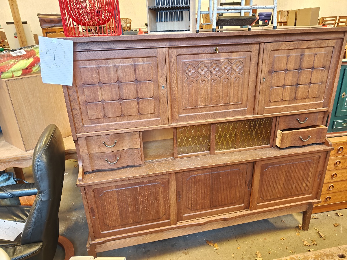 Dækketøjsskab af eg. Rigt prydet med udskæringer. 150 x 165 x 45 cm. Enkelte finerafslag forekommer.