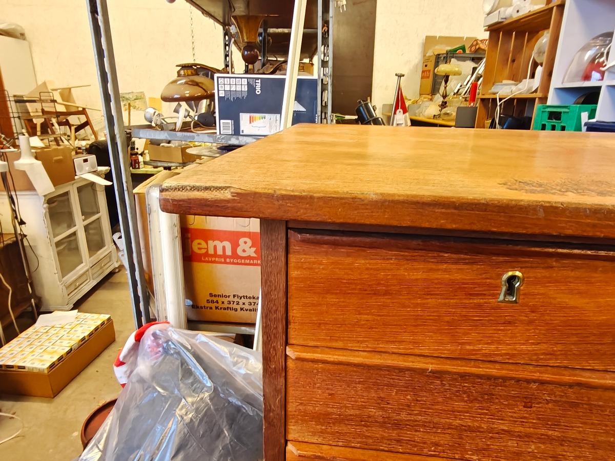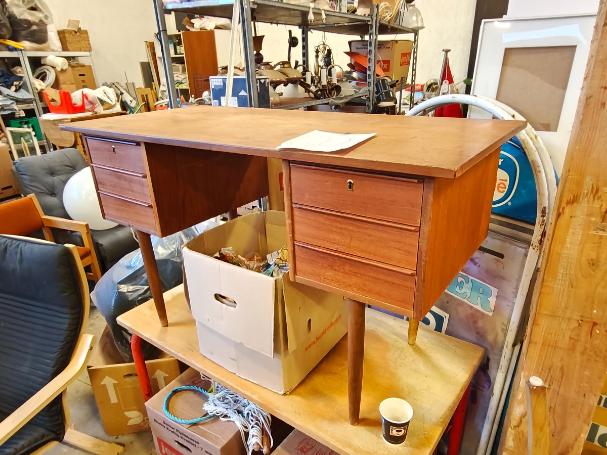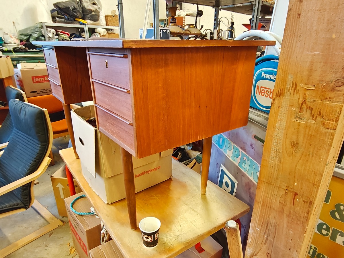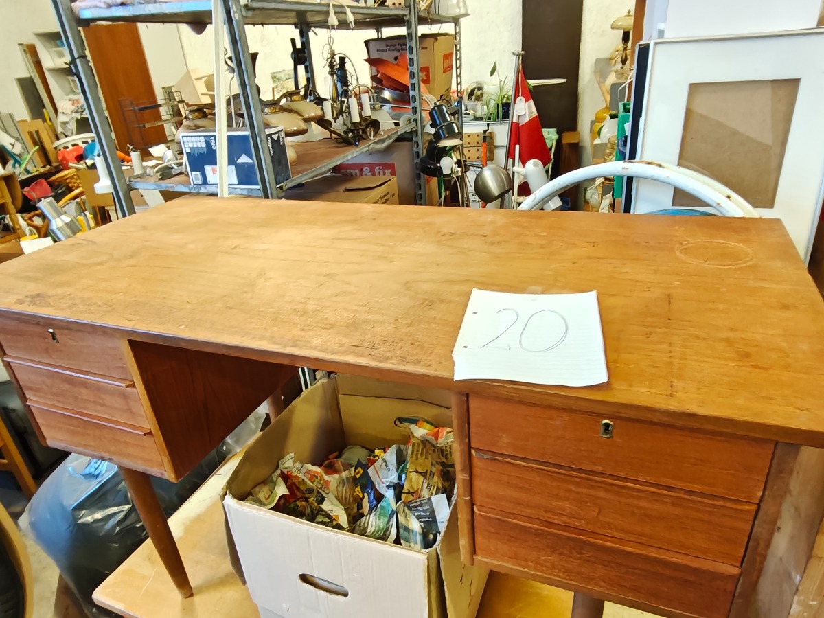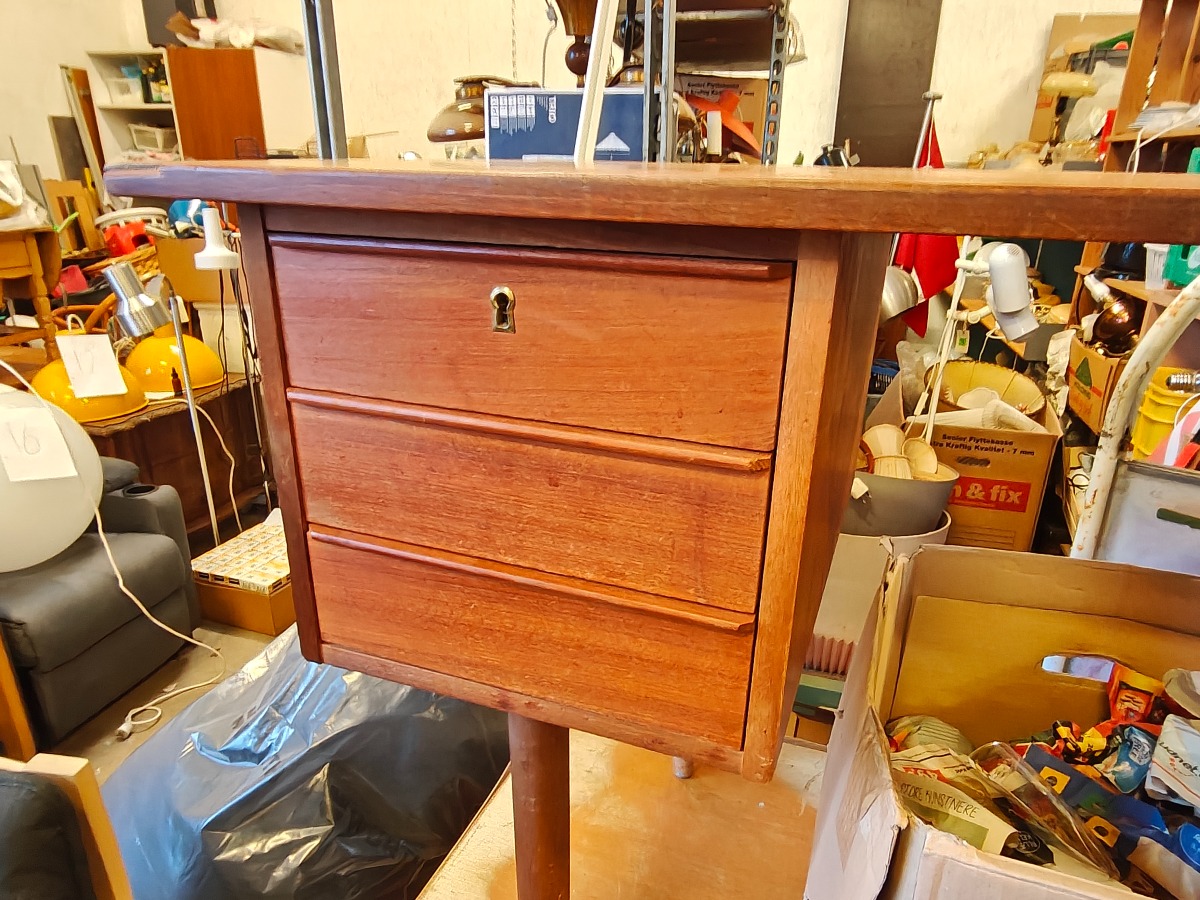 Dansk møbelproducent, fritstående skrivebord af teak. 6 skuffer i front. 72 x 120 x 58 cm. Brugsspor og finerafslag forekommer.