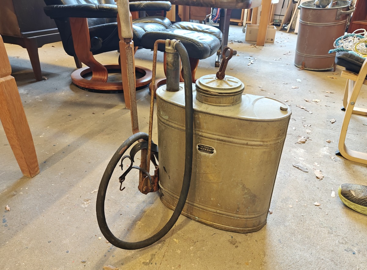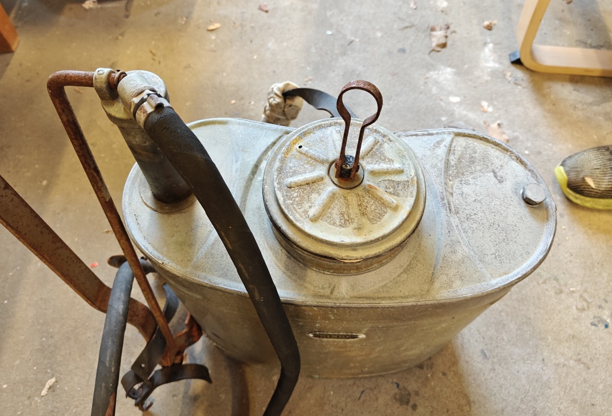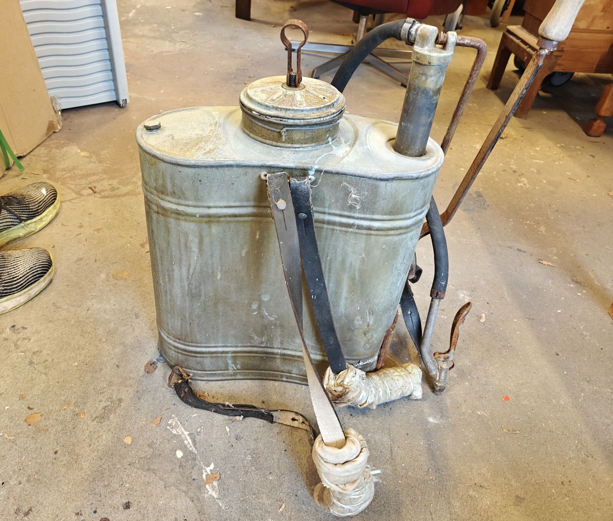 Ginge rygsprøjte af messing. aldersrelateret slid og patina. Bæreremme med kraftigt slid.